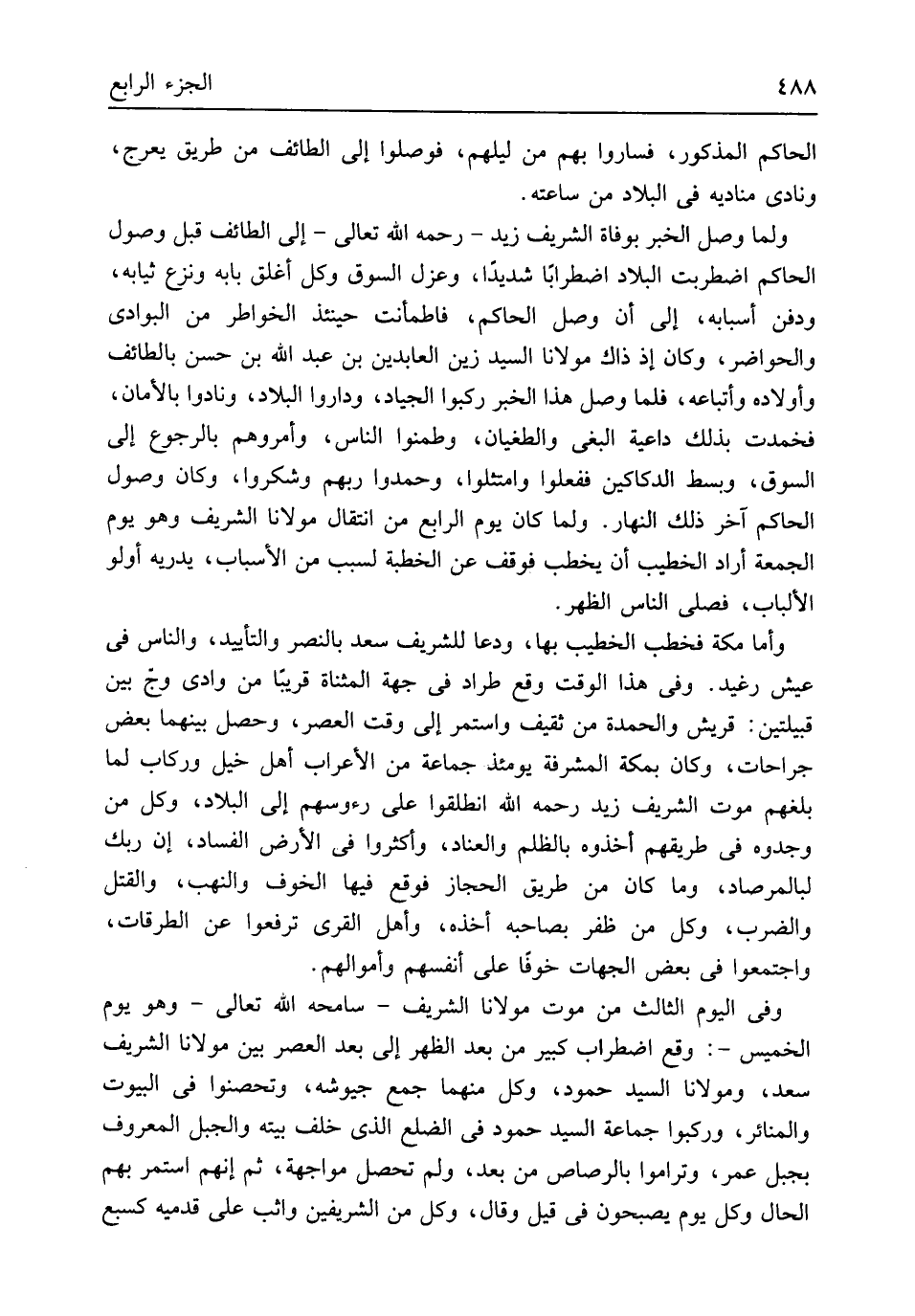 الْحَاكِم الْمَذْكُور فَسَارُوا بهم من ليلهم فوصلوا إِلَى الطَّائِف من طَرِيق يعرج ونادى مناديه فِي الْبِلَاد من سَاعَته وَلما وصل الْخَبَر بوفاة الشريف زيد رَحمَه الله تَعَالَى إِلَى الطَّائِف قبل وُصُول الْحَاكِم اضْطَرَبَتْ الْبِلَاد اضطراباً شَدِيدا وعزل السُّوق وكل أغلق بَابه وَنزع ثِيَابه وَدفن أَسبَابه إِلَى أَن وصل الْحَاكِم فاطمأنت حِينَئِذٍ الخواطر من البوادى والحواضر وَكَانَ إِذْ ذَاك مَوْلَانَا السَّيِّد زين العابدين بن عبد الله بن حسن بِالطَّائِف وَأَوْلَاده وَأَتْبَاعه فَلَمَّا وصل هَذَا الْخَبَر ركبُوا الْجِيَاد وداروا الْبِلَاد ونأدوا بالأمان فخمدت بذلك دَاعِيَة الْبَغي والطغيان وطمنوا النَّاس وَأمرُوهُمْ بِالرُّجُوعِ إِلَى السُّوق وَبسط الدكاكين فَفَعَلُوا وامتثلوا وحمدوا رَبهم وشكروا وَكَانَ وُصُول الْحَاكِم آخر ذَلِك النَّهَار وَلما كَانَ يَوْم الرَّابِع من انْتِقَال مَوْلَانَا الشريف وَهُوَ يَوْم الْجُمُعَة أَرَادَ الْخَطِيب أَن يخْطب فَوقف عَن الْخطْبَة لسَبَب من الْأَسْبَاب يدريه أولو الْأَلْبَاب فصلى النَّاس الظّهْر وَأما مَكَّة فَخَطب الْخَطِيب بهَا ودعا للشريف سعد بالنصر والتأييد وَالنَّاس فِي عَيْش رغيد وَفِي هَذَا الْوَقْت وَقع طراد فى جِهَة المشناة قَرِيبا من وادى وَج بَين قبيلتين قُرَيْش والحمدة من ثَقِيف وَاسْتمرّ إِلَى وَقت الْعَصْر وَحصل بَينهمَا بعض جراحات وَكَانَ بِمَكَّة المشرفة يَوْمئِذٍ جمَاعَة من الْأَعْرَاب أهل خيل وركاب لما بَلغهُمْ موت الشريف زيد رَحمَه الله انْطَلقُوا على رُءُوسهم إِلَى الْبِلَاد وكل من وجدوه فِي طريقهم أَخَذُوهُ بالظلم والعناد وَأَكْثرُوا فِي الأَرْض الْفساد إِن رَبك لبالمرصاد وَمَا كَانَ من طَرِيق الْحجاز فَوَقع فِيهَا الْخَوْف والنهب وَالْقَتْل وَالضَّرْب وكل من ظفر بِصَاحِبِهِ أَخذه وَأهل الْقرى تَرفعُوا عَن الطرقات واجتمعوا فِي بعض الْجِهَات خوفًا على أنفسهم وَأَمْوَالهمْ وَفِي الْيَوْم الثَّالِث من موت مَوْلَانَا الشريف سامحه الله تَعَالَى وَهُوَ يَوْم الْخَمِيس وَقع اضْطِرَاب كَبِير من بعد الظّهْر إِلَى بعد الْعَصْر بَين مَوْلَانَا الشريف سعد ومولانا السَّيِّد حمود وكل مِنْهُمَا جمع جيوشه وتحصنوا فِي الْبيُوت والمنائر وركبوا جمَاعَة السَّيِّد حمود فى الضلع الذى خلف بَيته والجبل الْمَعْرُوف بجبل عمر وتراموا بالرصاص من بعد وَلم تحصل مُوَاجهَة ثمَّ إِنَّهُم اسْتمرّ بهم الْحَال وكل يَوْم يُصْبِحُونَ فِي قيل وَقَالَ وكل من الشريفين واثب على قَدَمَيْهِ كسبع