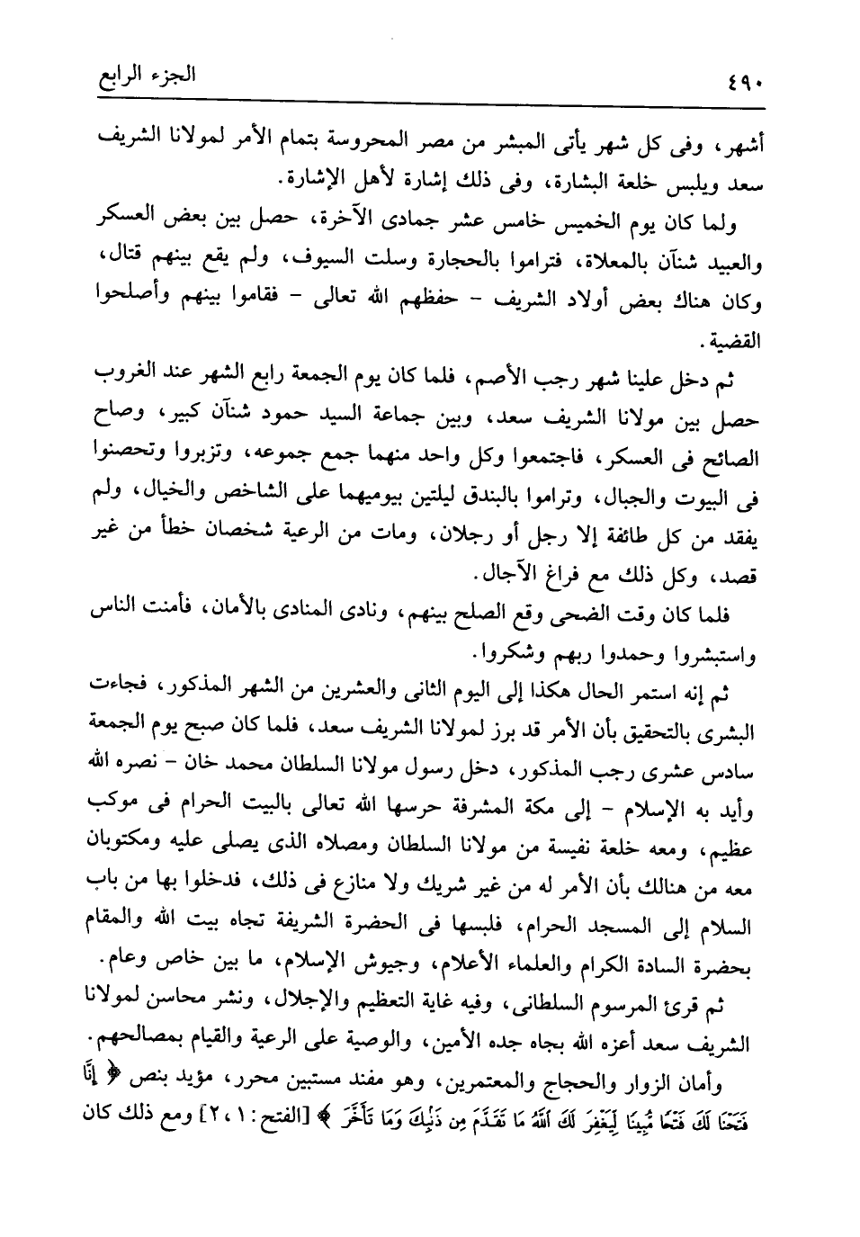 أشهر وَفِي كل شهر يَأْتِي المبشر من مصر المحروسة بِتمَام الْأَمر لمولانا الشريف سعد ويلبس خلعة الْبشَارَة وَفِي ذَلِك إِشَارَة لأهل الْإِشَارَة وَلما كَانَ يَوْم الْخَمِيس خَامِس عشر جُمَادَى الْآخِرَة حصل بَين بعض الْعَسْكَر وَالْعَبِيد شنآن بالمعلاة فتراموا بِالْحِجَارَةِ وسلت السيوف وَلم يَقع بَينهم قتال وَكَانَ هُنَاكَ بعض أَوْلَاد الشريف حفظهم الله تَعَالَى فَقَامُوا بَينهم وَأَصْلحُوا الْقَضِيَّة ثمَّ دخل علينا شهر رَجَب الْأَصَم فَلَمَّا كَانَ يَوْم الْجُمُعَة رَابِع الشَّهْر عِنْد الْغُرُوب حصل بَين مَوْلَانَا الشريف سعد وَبَين جمَاعَة السَّيِّد حمود شنآن كَبِير وَصَاح الصائح فِي الْعَسْكَر فَاجْتمعُوا وكل وَاحِد مِنْهُمَا جمع جموعه وتزبروا وتحصنوا فِي الْبيُوت وَالْجِبَال وتراموا بالبندق لَيْلَتَيْنِ بيوميهما على الشاخص والخيال وَلم يفقد من كل طَائِفَة إِلَّا رجل أَو رجلَانِ وَمَات من الرّعية شخصان خطأ من غير قصد وكل ذَلِك مَعَ فرَاغ الْآجَال فَلَمَّا كَانَ وَقت الضُّحَى وَقع الصُّلْح بَينهم ونادى الْمُنَادِي بالأمان فأمنت النَّاس وَاسْتَبْشَرُوا وحمدوا رَبهم وشكروا ثمَّ إِنَّه اسْتمرّ الْحَال هَكَذَا إِلَى الْيَوْم الثَّانِي وَالْعِشْرين من الشَّهْر الْمَذْكُور فَجَاءَت البشري بالتحقيق بِأَن الْأَمر قد برز لمولانا الشريف سعد فَلَمَّا كَانَ صبح يَوْم الْجُمُعَة سادس عشري رَجَب الْمَذْكُور دخل رَسُول مَوْلَانَا السُّلْطَان مُحَمَّد خَان نَصره الله وأيد بِهِ الْإِسْلَام إِلَى مَكَّة المشرفة حرسها الله تَعَالَى بِالْبَيْتِ الْحَرَام فِي موكب عَظِيم وَمَعَهُ خلعة نفيسة من مَوْلَانَا السُّلْطَان وَمُصَلَّاهُ الَّذِي يصلى عَلَيْهِ ومكتوبان مَعَه من هُنَالك بِأَن الْأَمر لَهُ من غير شريك وَلَا مُنَازع فِي ذَلِك فَدَخَلُوا بهَا من بَاب السَّلَام إِلَى الْمَسْجِد الْحَرَام فلبسها فِي الحضرة الشَّرِيفَة تجاه بَيت الله وَالْمقَام بِحَضْرَة السَّادة الْكِرَام وَالْعُلَمَاء الْأَعْلَام وجيوش الْإِسْلَام مَا بَين خَاص وعام ثمَّ قرئَ المرسوم السلطاني وَفِيه غَايَة التَّعْظِيم والإجلال وَنشر محَاسِن لمولانا الشريف سعد أعزه الله بجاه جده الْأمين وَالْوَصِيَّة على الرّعية وَالْقِيَام بمصالحهم وأمان الزوار وَالْحجاج والمعتمرين وَهُوَ مُفند مستبين مُحَرر مؤيد بِنَصّ {إِنَّا فتحنا لَكَ فَتحاً مُبينا ليغَفِرَ لَكَ اللهُ مَا تَقَدَمَ مِن ذَنْبِكَ وَما تأخرَ} الْفَتْح 1 2 وَمَعَ ذَلِك كَانَ