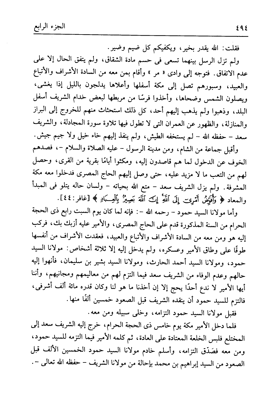 فَقلت الله يقدر بِخَير ويكفيكم كل ضيم وضير وَلم تزل الرُّسُل بَينهمَا تسْعَى فِي حسم مَادَّة الشقاق وَلم يتَّفق الْحَال إِلَّا على عدم الِاتِّفَاق فَتوجه إِلَى وَادي مر وَأقَام بِمن مَعَه من السَّادة الْأَشْرَاف والأتباع وَالْعَبِيد وسبورهم تصل إِلَى مَكَّة أَسْفَلهَا وأعلاها يدلجون بِاللَّيْلِ إِذا يغشى وَيصلونَ الشَّمْس وَضُحَاهَا وَأخذُوا فرسا من مربطها لبَعض خدام الشريف أَسْفَل الْبَلَد وذهبوا وَلم يذهب إِلَيْهِم أحد كل ذَلِك استحثاث مِنْهُم لِلْخُرُوجِ إِلَى البرَاز والمنازلة والظهور عَن الْعمرَان الَّتِي لَا تطول فِيهَا تِلَاوَة سُورَة المجادلة والشريف سعد حفظه الله لم يستخفه الطيش وَلم ينفذ إِلَيْهِم خاء خيل وَلَا جِيم جَيش وَأَقْبل جمَاعَة من الشَّام وَمن مَدِينَة الرَّسُول عَلَيْهِ الصَّلَاة وَالسَّلَام فصدهم الْخَوْف عَن الدُّخُول لما هم قاصدون إِلَيْهِ ومكثوا أَيَّامًا بقرية من الْقرى وَحصل لَهُم من التَّعَب مَا لَا مزِيد عَلَيْهِ حَتَّى وصل إِلَيْهِم الْحَاج المصرى فَدَخَلُوا مَعَه مَكَّة المشرفة وَلم يزل الشريف سعد متع الله بحياته ولسان حَاله يَتْلُو فِي المبدأ والمعاد {وأفوِضُ أَمرِي إِلَى الله إِن اَللهَ بَصِير بِالعِبادِ} غَافِر 44 وَأما مَوْلَانَا السَّيِّد حمود رَحمَه الله فَإِنَّهُ لما كَانَ يَوْم السبت رَابِع ذِي الْحجَّة الْحَرَام من السّنة الْمَذْكُورَة قدم على الْحَاج الْمصْرِيّ والأمير عَلَيْهِ أزبك بك فَركب إِلَيْهِ هُوَ وَمن مَعَه من السَّادة الْأَشْرَاف والأتباع وَالْعَبِيد فعقدت الْأَشْرَاف من أَنْفسهَا طوقاً عَليّ وطاق الْأَمِير وَعَسْكَره وَلم يدْخل إِلَيْهِ إِلَّا ثَلَاثَة أشخاص مَوْلَانَا السَّيِّد حمود ومولانا السَّيِّد أَحْمد الْحَارِث ومولانا السَّيِّد بشير بن سُلَيْمَان فأنهوا إِلَيْهِ حَالهم وَعدم الْوَفَاء من الشريف سعد فِيمَا الْتزم لَهُم من معاليمهم ومجانيهم وأننا أَيهَا الْأَمِير لَا نَدع أحدا يحجّ إِلَّا إِن أَخذنَا مَا هُوَ لنا وَكَانَ قدره مائَة ألف أشرفي فالتزم للسَّيِّد حمود أَن ينقده الشريف قبل الصعُود خمسين ألفا مِنْهَا فَقبل مَوْلَانَا السَّيِّد حمود الْتِزَامه وخلي سَبيله وَمن مَعَه فَلَمَّا دخل الْأَمِير مَكَّة يَوْم خَامِس ذِي الْحجَّة الْحَرَام خرج إِلَيْهِ الشريف سعد إِلَى المختلع فَلبس الخلعة الْمُعْتَادَة على الْعَادة ثمَّ كَلمه الْأَمِير فِيمَا الْتَزمهُ للسَّيِّد حمود وَمن مَعَه فصَدق الْتِزَامه وَأسلم خَادِم مَوْلَانَا السَّيِّد حمود الْخمسين الْألف قبل الصعُود من السَّيِّد إِبْرَاهِيم بن مُحَمَّد بإحالة من مَوْلَانَا الشريف حفظه الله تَعَالَى