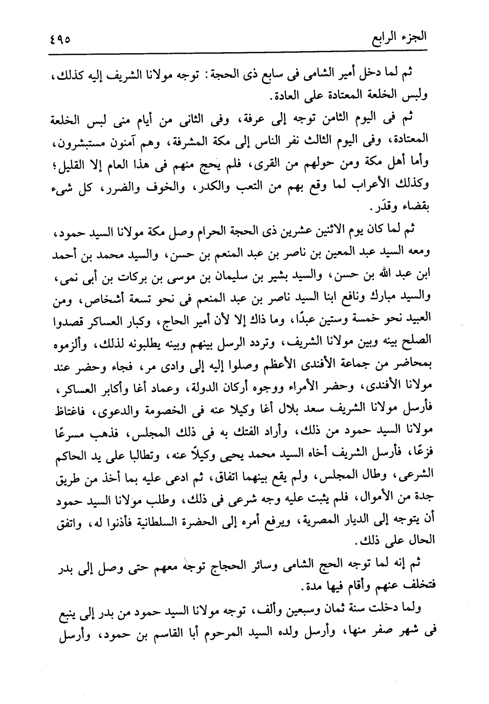 ثمَّ لما دخل أَمِير الشَّامي فِي سَابِع ذِي الْحجَّة توجه مَوْلَانَا الشريف إِلَيْهِ كَذَلِك وَلبس الخلعة الْمُعْتَادَة على الْعَادة ثمَّ فِي الْيَوْم الثَّامِن توجه إِلَى عَرَفَة وَفِي الثَّانِي من أَيَّام منى لبس الخلعة الْمُعْتَادَة وَفِي الْيَوْم الثَّالِث نفر النَّاس إِلَى مَكَّة المشرفة وهم آمنون مستبشرون وَأما أهل مَكَّة وَمن حَولهمْ من الْقرى فَلم يحجّ مِنْهُم فِي هَذَا الْعَام إِلَّا الْقَلِيل وَكَذَلِكَ الْأَعْرَاب لما وَقع بهم من التَّعَب والكدر وَالْخَوْف وَالضَّرَر كل شئ بِقَضَاء وقدَر ثمَّ لما كَانَ يَوْم الِاثْنَيْنِ عشْرين ذِي الْحجَّة الْحَرَام وصل مَكَّة مَوْلَانَا السَّيِّد حمود وَمَعَهُ السَّيِّد عبد الْمعِين بن نَاصِر بن عبد الْمُنعم بن حسن وَالسَّيِّد مُحَمَّد بن أَحْمد ابْن عبد الله بن حسن وَالسَّيِّد بشير بن سُلَيْمَان بن مُوسَى بن بَرَكَات بن أبي نمي وَالسَّيِّد مبارك وَنَافِع ابْنا السَّيِّد نَاصِر بن عبد الْمُنعم فِي نَحْو تِسْعَة أشخاص وَمن العبيد نَحْو خَمْسَة وَسِتِّينَ عبدا وَمَا ذَاك إِلَّا لِأَن أَمِير الْحَاج وكبار العساكر قصدُوا الصُّلْح بَينه وَبَين مَوْلَانَا الشريف وَتردد الرُّسُل بَينهم وَبَينه يطلبونه لذَلِك وألزموه بمحاضر من جمَاعَة الأفندي الْأَعْظَم وصلوا إِلَيْهِ إِلَى وَادي مر فجَاء وَحضر عِنْد مَوْلَانَا الأفندي وَحضر الْأُمَرَاء ووجوه أَرْكَان الدولة وعماد أغا وأكابر العساكر فَأرْسل مَوْلَانَا الشريف سعد بِلَال أغا وَكيلا عَنهُ فِي الْخُصُومَة وَالدَّعْوَى فاغتاظ مَوْلَانَا السَّيِّد حمود من ذَلِك وَأَرَادَ الفتك بِهِ فِي ذَلِك الْمجْلس فَذهب مسرعاً فَزعًا فَأرْسل الشريف أَخَاهُ السَّيِّد مُحَمَّد يحيى وَكيلا عَنهُ وتطالبا على يَد الْحَاكِم الشَّرْعِيّ وَطَالَ الْمجْلس وَلم يَقع بَينهمَا اتِّفَاق ثمَّ ادعِي عَلَيْهِ بِمَا أَخذ من طَرِيق جدة من الْأَمْوَال فَلم يثبت عَلَيْهِ وَجه شَرْعِي فِي ذَلِك وَطلب مَوْلَانَا السَّيِّد حمود أَن يتَوَجَّه إِلَى الديار المصرية وَيرْفَع أمره إِلَى الحضرة السُّلْطَانِيَّة فأذنوا لَهُ وَاتفقَ الْحَال على ذَلِك ثمَّ إِنَّه لما توجه الْحَج الشَّامي وَسَائِر الْحجَّاج توجه مَعَهم حَتَّى وصل إِلَى بدر فَتخلف عَنْهُم وَأقَام فِيهَا مُدَّة وَلما دخلت سنة ثَمَان وَسبعين وَألف توجه مَوْلَانَا السَّيِّد حمود من بدر إِلَى يَنْبع فِي شهر صفر مِنْهَا وَأرْسل وَلَده السَّيِّد المرحوم أَبَا الْقَاسِم بن حمود وَأرْسل