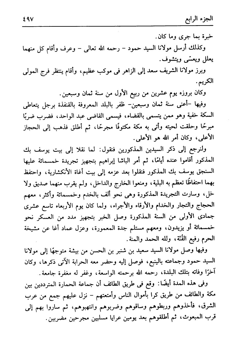 خبْرَة بِمَا جرى وَمَا كَانَ وَكَذَلِكَ أرسل مَوْلَانَا السَّيِّد حمود رَحمَه الله تَعَالَى وَعرف وَأقَام كل مِنْهُمَا يُعلل ويعسى ويتشوف وبرز مَوْلَانَا الشريف سعد إِلَى الزَّاهِر فِي موكب عَظِيم وَأقَام ينْتَظر فرج الْمولى الْكَرِيم وَكَانَ بروزه يَوْم عشْرين من ربيع الأول من سنة ثَمَان وَسبعين وفيهَا أَعنِي سنة ثَمَان وَسبعين ظفر بِالْبَلَدِ الْمَعْرُوفَة بالقنفذة بِرَجُل يتعاطى السِّكَّة خُفْيَة وَهُوَ مِمَّن يتسمى بِالْقضَاءِ فيسمى القَاضِي عبد الْوَاحِد فَضرب ضربا مبرحاً وحلقت لحيته وأتى بِهِ مَكَّة مكتوفاً مجرحاً ثمَّ أطلق فَذهب إِلَى الْحجاز الْأَعْلَى وَكَانَ أَمر الله هُوَ الْأَعْلَى ولنرجع إِلَى ذكر السيدين الْمَذْكُورين فَنَقُول لما نقلا إِلَى بَيت يُوسُف بك الْمَذْكُور أَقَامُوا عِنْده أَيَّامًا ثمَّ أَمر الباشا إِبْرَاهِيم بتجهيز تجريدة خَمْسمِائَة عَلَيْهَا السنجق يُوسُف بك الْمَذْكُور فنقلوا بعد عزمه إِلَى بَيت أغاة الأنكشارية واحتفظ بهما احتفاظاً تعظم بِهِ البلية وَمنعُوا الْخَارِج والداخل وَلم يقرب مِنْهُمَا صديق وَلَا خل وسارت التجريدة الْمَذْكُورَة وَهِي نَحْو ألف بالخدم وَخَمْسمِائة وَأكْثر مَعَهم الْحجَّاج والتجار والخدام والأرقاء والأجراء وَلما كَانَ يَوْم الْأَرْبَعَاء تَاسِع عشري جُمَادَى الأولى من السّنة الْمَذْكُورَة وصل الْخَبَر بتجهيز مدد من الْعَسْكَر نَحْو خَمْسمِائَة أَو يزِيدُونَ وَمَعَهُمْ مستلم جدة المعمورة وعزل عماد أغا عَن مشيخة الْحرم رفيع القُنة وَللَّه الْحَمد والْمنَّة وفيهَا وصل مَوْلَانَا السَّيِّد سعيد بن شنبر بن الْحسن من بيشة مُتَوَجها إِلَى مَوْلَانَا السَّيِّد حمود وجماعته بالينبع فوصل إِلَيْهِ وَحضر مَعَه الْحِرَابَة الْآتِي ذكرهَا وَكَانَ آخرا وَفَاته بِتِلْكَ الْبَلدة رَحمَه الله برحمته الوسعة وَغفر لَهُ مغْفرَة جَامِعَة وَفِي هَذِه الْمدَّة أَيْضا وَقع فِي طَرِيق الطَّائِف أَن جمَاعَة الحمارة المترددين بَين مَكَّة والطائف من طَرِيق كرا بأموال النَّاس وأمتعتهم نزل عَلَيْهِم جمع من عرب الشرق فَأَخَذُوهُمْ وربطوهم وساقوهم وضربوهم وانتهبوهم ثمَّ سَارُوا بهم إِلَى قرب الْمَبْعُوث ثمَّ أطلقوهم بعد يَوْمَيْنِ عرايا مسلبين مجرحين مضربين
