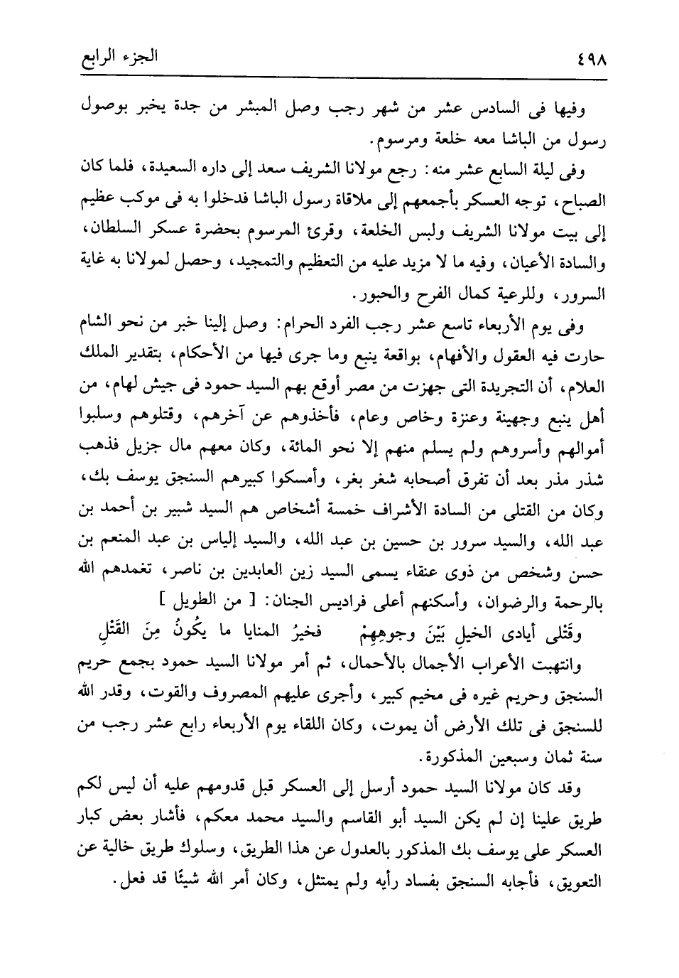 وفيهَا فِي السَّادِس عشر من شهر رَجَب وصل المبشر من جدة يخبر بوصول رَسُول من الباشا مَعَه خلعة ومرسوم وَفِي لَيْلَة السَّابِع عشر مِنْهُ رَجَعَ مَوْلَانَا الشريف سعد إِلَى دَاره السعيدة فَلَمَّا كَانَ الصَّباح توجه الْعَسْكَر بأجمعهم إِلَى ملاقة رَسُول الباشا فَدَخَلُوا بِهِ فِي موكب عَظِيم إِلَى بَيت مَوْلَانَا الشريف وَلبس الخلعة وَقُرِئَ المرسوم بِحَضْرَة عَسْكَر السُّلْطَان والسادة الْأَعْيَان وَفِيه مَا لَا مزِيد عَلَيْهِ من التَّعْظِيم والتمجيد وَحصل لمولانا بِهِ غَايَة السرُور وللرعية كَمَال الْفَرح والحبور وَفِي يَوْم الْأَرْبَعَاء تَاسِع عشر رَجَب الْفَرد الْحَرَام وصل إِلَيْنَا خبر من نَحْو الشَّام حَارِث فِيهِ الْعُقُول والأفهام بواقعة يَنْبع وَمَا جرى فِيهَا من الْأَحْكَام بِتَقْدِير الْملك العلام أَن التجريدة الَّتِي جهزت من مصر أوقع بهم السَّيِّد حمود فِي جَيش لهام من أهل يَنْبع وجهينة وعنزة وخاص وعام فَأَخَذُوهُمْ عَن آخِرهم وقتلوهم وسلبوا أَمْوَالهم وَأسرُوهُمْ وَلم يسلم مِنْهُم إِلَّا نَحْو الْمِائَة وَكَانَ مَعَهم مَال جزيل فَذهب شذر مذر بعد أَن تفرق أَصْحَابه شغر بغر وأمسكوا كَبِيرهمْ السنجق يُوسُف بك وَكَانَ من الْقَتْلَى من السَّادة الْأَشْرَاف خَمْسَة أشخاص هم السَّيِّد شبير بن أَحْمد بن عبد الله وَالسَّيِّد سرُور بن حُسَيْن بن عبد الله وَالسَّيِّد إلْيَاس بن عبد الْمُنعم بن حسن وشخص من ذوى عنقاء يُسمى السَّيِّد زين العابدين بن نَاصِر تغمدهم الله بِالرَّحْمَةِ والرضوان وأسكنهم أَعلَى فراديس الْجنان // (من الطَّوِيل) //