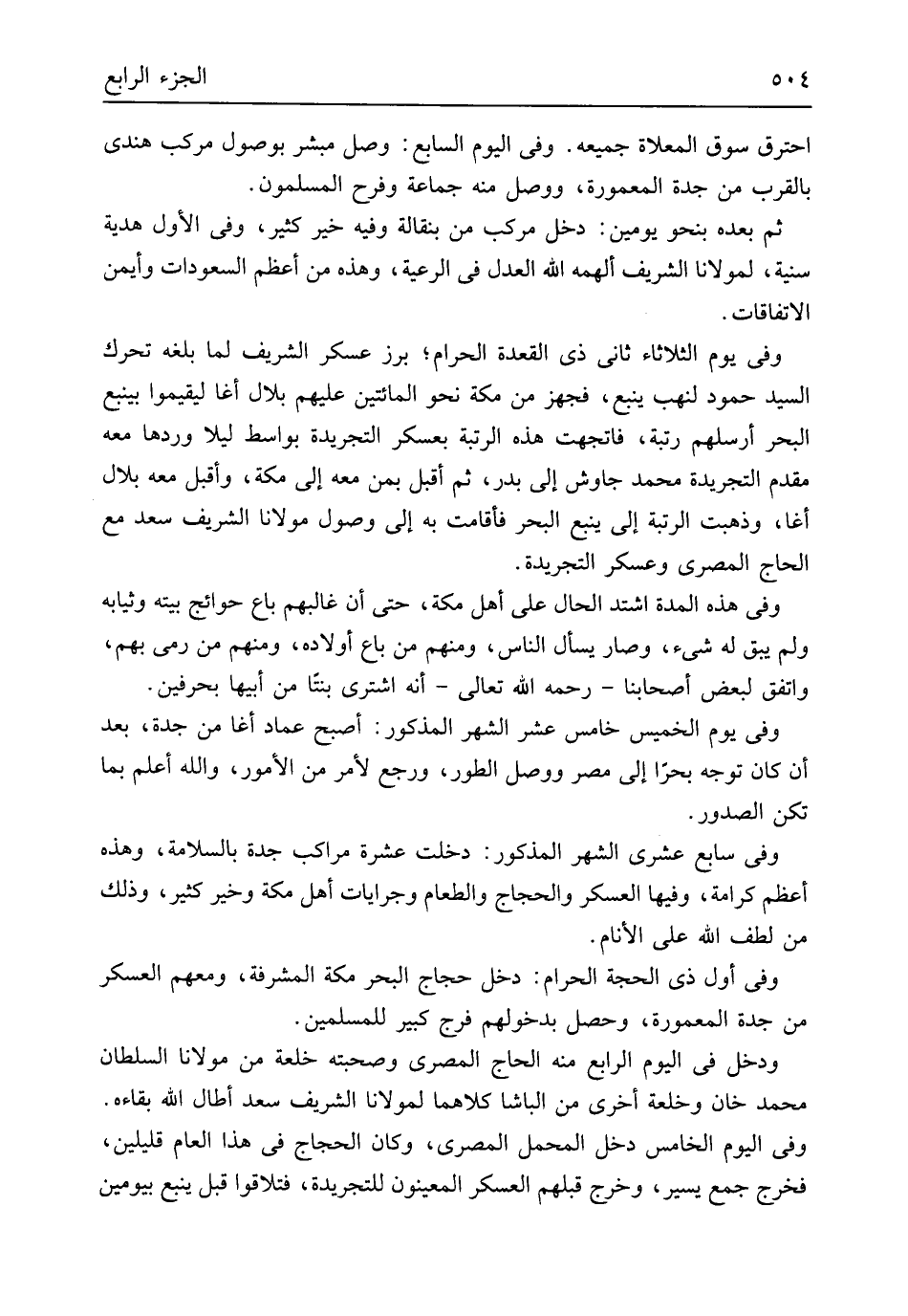 احْتَرَقَ سوق المعلاة جَمِيعه وَفِي الْيَوْم السَّابِع وصل مُبشر بوصول مركب هندي بِالْقربِ من جدة المعمورة وَوصل مِنْهُ جمَاعَة وَفَرح الْمُسلمُونَ ثمَّ بعده بِنَحْوِ يَوْمَيْنِ دخل مركب من بنقالة وَفِيه خير كثير وَفِي الأول هَدِيَّة سنية لمولانا الشريف ألهمه الله الْعدْل فِي الرّعية وَهَذِه من أعظم السعودات وأيمن الاتفاقات وَفِي يَوْم الثُّلَاثَاء ثَانِي ذِي الْقعدَة الْحَرَام برز عَسْكَر الشريف لما بلغه تحرّك السَّيِّد حمود لنهب يَنْبع فَجهز من مَكَّة نَحْو الْمِائَتَيْنِ عَلَيْهِم بِلَال أغا ليقيموا بينبع الْبَحْر أرسلهم رُتْبَة فاتجهت هَذِه الرُّتْبَة بعسكر التجريدة بواسط لَيْلًا وردهَا مَعَه مقدم التجريدة مُحَمَّد جاوش إِلَى بدر ثمَّ أقبل بِمن مَعَه إِلَى مَكَّة وَأَقْبل مَعَه بِلَال أغا وَذَهَبت الرُّتْبَة إِلَى يَنْبع الْبَحْر فأقامت بِهِ إِلَى وُصُول مَوْلَانَا الشريف سعد مَعَ الْحَاج الْمصْرِيّ وعسكر التجريدة وَفِي هَذِه الْمدَّة اشْتَدَّ الْحَال على أهل مَكَّة حَتَّى أَن غالبهم بَاعَ حوائج بَيته وثيابه وَلم يبْق لَهُ شئ وَصَارَ يسْأَل النَّاس وَمِنْهُم من بَاعَ أَوْلَاده وَمِنْهُم من رمى بهم وَاتفقَ لبَعض أَصْحَابنَا رَحمَه الله تَعَالَى أَنه اشْترى بِنْتا من أَبِيهَا بحرفين وَفِي يَوْم الْخَمِيس خَامِس عشر الشَّهْر الْمَذْكُور أصبح عماد أغا من جدة بعد أَن كَانَ توجه بحراً إِلَى مصر وَوصل الطّور وَرجع لأمر من الْأُمُور وَالله أعلم بِمَا تكن الصُّدُور وَفِي سَابِع عشري الشَّهْر الْمَذْكُور دخلت عشرَة مراكب جدة بالسلامة وَهَذِه أعظم كَرَامَة وفيهَا الْعَسْكَر وَالْحجاج وَالطَّعَام وجرايات أهل مَكَّة وَخير كثير وَذَلِكَ من لطف الله على الْأَنَام وَفِي أول ذِي الْحجَّة الْحَرَام دخل حجاج الْبَحْر مَكَّة المشرفة وَمَعَهُمْ الْعَسْكَر من جدة المعمورة وَحصل بدخولهم فرج كَبِير للْمُسلمين وَدخل فِي الْيَوْم الرَّابِع مِنْهُ الْحَاج الْمصْرِيّ وصحبته خلعة من مَوْلَانَا السُّلْطَان مُحَمَّد خَان وخلعة أُخْرَى من الباشا كِلَاهُمَا لمولانا الشريف سعد أَطَالَ الله بَقَاءَهُ وَفِي الْيَوْم الْخَامِس دخل الْمحمل الْمصْرِيّ وَكَانَ الْحجَّاج فِي هَذَا الْعَام قليلين فَخرج جمع يسير وَخرج قبلهم الْعَسْكَر المعينون للتجريدة فتلاقوا قبل يَنْبع بيومين