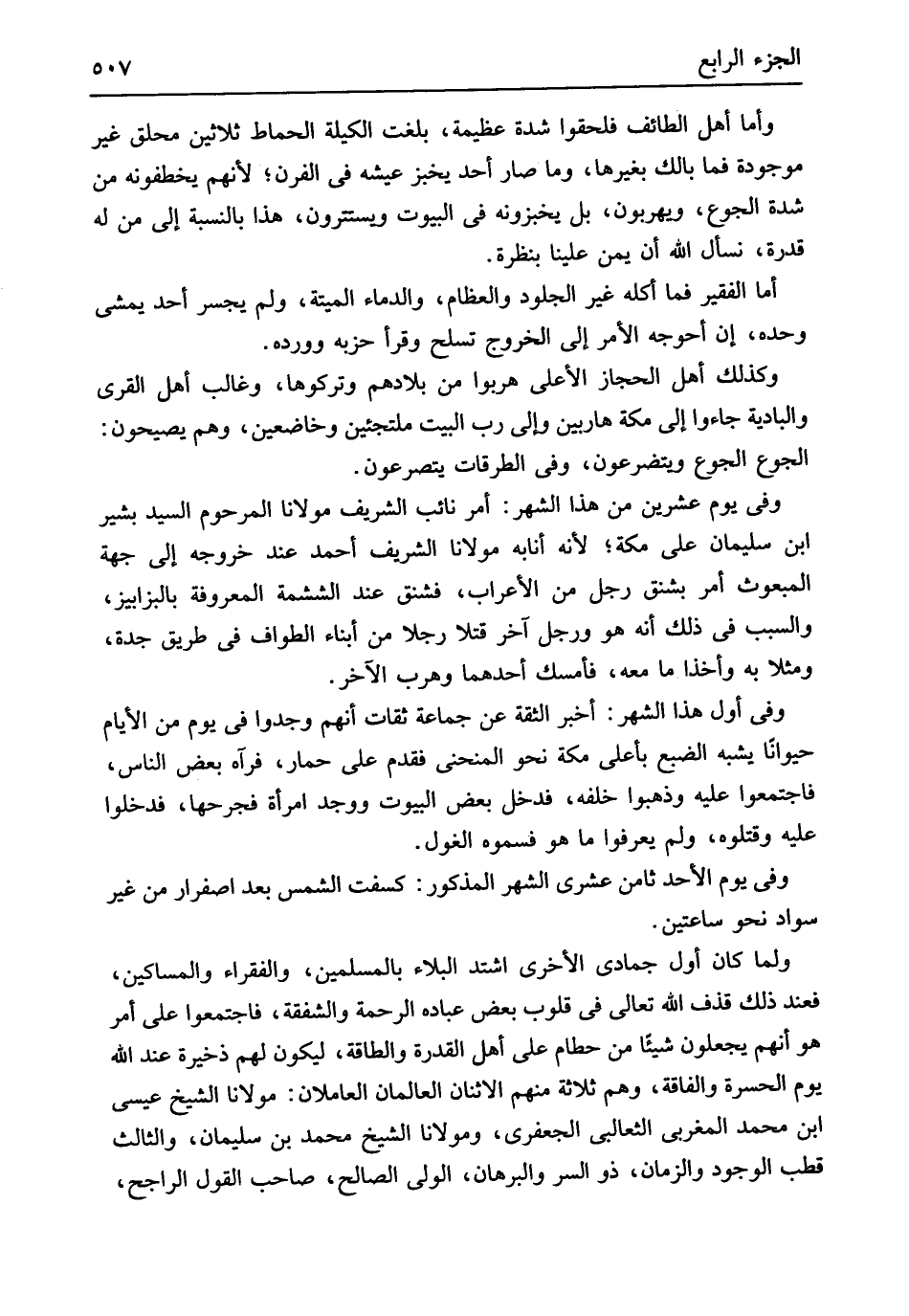وَأما أهل الطَّائِف فَلَحقُوا شدَّة عَظِيمَة بلغت الكيلة الحماط ثَلَاثِينَ محلق غير مَوْجُودَة فَمَا بالك بغَيْرهَا وَمَا صَار أحد يخبز عيشه فى الْقرن لأَنهم يخطفونه من شدَّة الْجُوع ويهربون بل يخبزونه فِي الْبيُوت ويستترون هَذَا بِالنِّسْبَةِ إِلَى من لَهُ قدرَة نسْأَل الله أَن يمن علينا بنظرة أما الْفَقِير فَمَا أكله غير الْجُلُود وَالْعِظَام والدماء الْميتَة وَلم يَجْسُر أحد يمشي وَحده إِن أحوجه الْأَمر إِلَى الْخُرُوج تسلح وَقَرَأَ حزبه وورده وَكَذَلِكَ أهل الْحجاز الْأَعْلَى هربوا من بِلَادهمْ وتركوها وغالب أهل الْقرى والبادية جَاءُوا إِلَى مَكَّة هاربين وَإِلَى رب الْبَيْت ملتجئين وخاضعين وهم يصيحون الْجُوع الْجُوع ويتضرعون وَفِي الطرقات يتصرعون وَفِي يَوْم عشْرين من هَذَا الشَّهْر أَمر نَائِب الشريف مَوْلَانَا المرحوم السَّيِّد بشير ابْن سُلَيْمَان على مَكَّة لِأَنَّهُ أنابه مَوْلَانَا الشريف أَحْمد عِنْد خُرُوجه إِلَى جِهَة الْمَبْعُوث أَمر بشنق رجل من الْأَعْرَاب فشنق عِنْد الششمة الْمَعْرُوفَة بالبزابيز وَالسَّبَب فِي ذَلِك أَنه هُوَ وَرجل آخر قتلا رجلا من أَبنَاء الطّواف فِي طَرِيق جدة ومثلا بِهِ وأخذا مَا مَعَه فَأمْسك أَحدهمَا وهرب الآخر وَفِي أول هَذَا الشَّهْر أخبر الثِّقَة عَن جمَاعَة ثِقَات أَنهم وجدوا فِي يَوْم من الْأَيَّام حَيَوَانا يشبه الضبع بِأَعْلَى مَكَّة نَحْو المنحنى فَقدم على حمَار فَرَآهُ بعض النَّاس فَاجْتمعُوا عَلَيْهِ وذهبوا خَلفه فَدخل بعض الْبيُوت وَوجد امْرَأَة فجرحها فَدَخَلُوا عَلَيْهِ وقتلوه وَلم يعرفوا مَا هُوَ فَسَموهُ الغول وَفِي يَوْم الْأَحَد ثامن عشري الشَّهْر الْمَذْكُور كسفت الشَّمْس بعد اصفرار من غير سَواد نَحْو ساعتين وَلما كَانَ أول جُمَادَى الْأُخْرَى اشْتَدَّ الْبلَاء بِالْمُسْلِمين والفقراء وَالْمَسَاكِين فَعِنْدَ ذَلِك قذف الله تَعَالَى فِي قُلُوب بعض عباده الرَّحْمَة والشفقة فَاجْتمعُوا على أَمر هُوَ أَنهم يجْعَلُونَ شَيْئا من حطام على أهل الْقُدْرَة والطاقة ليَكُون لَهُم ذخيرة عِنْد الله يَوْم الْحَسْرَة والفاقة وهم ثَلَاثَة مِنْهُم الِاثْنَان العالمان العاملان مَوْلَانَا الشَّيْخ عِيسَى ابْن مُحَمَّد المغربي الثعالبي الْجَعْفَرِي ومولانا الشَّيْخ مُحَمَّد بن سُلَيْمَان وَالثَّالِث قطب الْوُجُود وَالزَّمَان ذُو السِّرّ والبرهان الْوَلِيّ الصَّالح صَاحب القَوْل الرَّاجِح