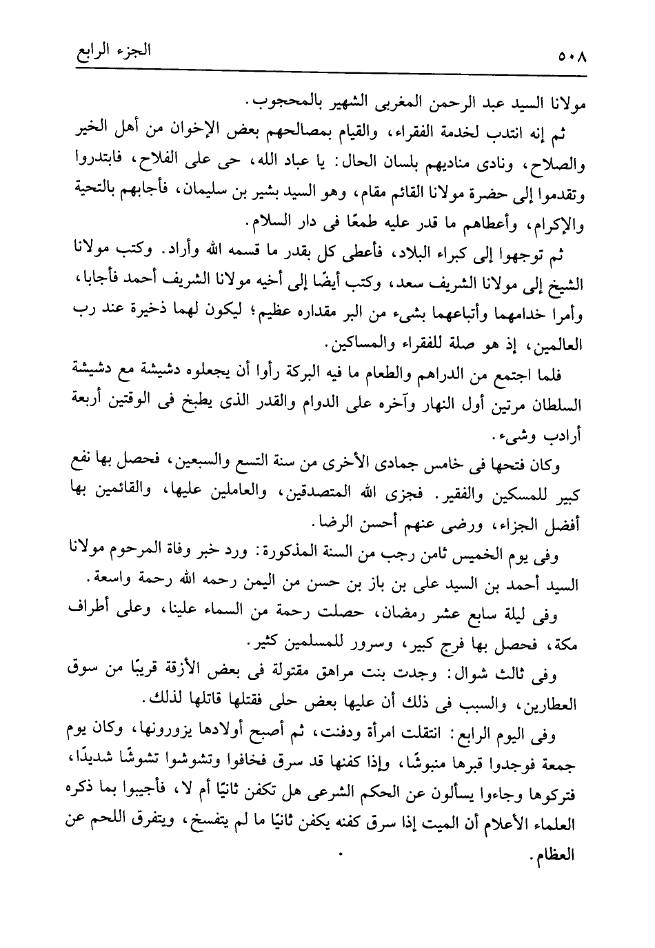 مَوْلَانَا السَّيِّد عبد الرَّحْمَن المغربي الشهير بالمحجوب ثمَّ إِنَّه انتدب لخدمة الْفُقَرَاء وَالْقِيَام بمصالحهم بعض الإخوان من أهل الْخَيْر وَالصَّلَاح ونادى مناديهم بِلِسَان الْحَال يَا عباد الله حَيّ على الْفَلاح فابتدروا وتقدموا إِلَى حَضْرَة مَوْلَانَا الْقَائِم مقَام وَهُوَ السَّيِّد بشير بن سُلَيْمَان فأجابهم بالتحية وَالْإِكْرَام وَأَعْطَاهُمْ مَا قدر عَلَيْهِ طَمَعا فِي دَار السَّلَام ثمَّ توجهوا إِلَى كبراء الْبِلَاد فَأعْطِي كل بِقدر مَا قسمه الله وَأَرَادَ وَكتب مَوْلَانَا الشَّيْخ إِلَى مَوْلَانَا الشريف سعد وَكتب أَيْضا إِلَى أَخِيه مَوْلَانَا الشريف أَحْمد فأجابا وأمرا خدامهما وأتباعهما بشئ من الْبر مِقْدَاره عَظِيم ليَكُون لَهما ذخيرة عِنْد رب الْعَالمين إِذْ هُوَ صلَة للْفُقَرَاء وَالْمَسَاكِين فَلَمَّا اجْتمع من الدَّرَاهِم وَالطَّعَام مَا فِيهِ الْبركَة رَأَوْا أَن يَجْعَلُوهُ دشيشة مَعَ دشيشة السُّلْطَان مرَّتَيْنِ أول النَّهَار واَخره على الدَّوَام وَالْقدر الَّذِي يطْبخ فِي الْوَقْتَيْنِ أَرْبَعَة أرادب وشئ وَكَانَ فتحهَا فِي خَامِس جُمَادَى الْأُخْرَى من سنة التسع وَالسبْعين فَحصل بهَا نفع كَبِير للْمُسلمين وَالْفَقِير فجزى الله المتصدقين والعاملين عَلَيْهَا والقائمين بهَا أفضل الْجَزَاء ورضى عَنْهُم أحسن الرِّضَا وَفِي يَوْم الْخَمِيس ثامن رَجَب من السّنة الْمَذْكُورَة ورد خبر وَفَاة المرحوم مَوْلَانَا السَّيِّد أَحْمد بن السَّيِّد عَليّ بن باز بن حسن من الْيمن رَحمَه الله رَحْمَة وَاسِعَة وَفِي لَيْلَة سَابِع عشر رَمَضَان حصلت رَحْمَة من السَّمَاء علينا وعَلى أَطْرَاف مَكَّة فَحصل بهَا فرج كَبِير وسرور للْمُسلمين كثير وَفِي ثَالِث شَوَّال وجدت بنت مراهق مقتولة فِي بعض الْأَزِقَّة قَرِيبا من سوق العطارين وَالسَّبَب فِي ذَلِك أَن عَلَيْهَا بعض حلي فَقَتلهَا قاتلها لذَلِك وَفِي الْيَوْم الرَّابِع انْتَقَلت امْرَأَة ودفنت ثمَّ أصبح أَوْلَادهَا يزورونها وَكَانَ يَوْم جُمُعَة فوجدوا قبرها منبوشاً وَإِذا كفنها قد سرق فخافوا وتشوشوا تشوشاً شَدِيدا فتركوها وَجَاءُوا يسْأَلُون عَن الحكم الشَّرْعِيّ هَل تكفن ثَانِيًا أم لَا فأجيبوا بِمَا ذكره الْعلمَاء الْأَعْلَام أَن الْمَيِّت إِذا سرق كَفنه يُكفن ثَانِيًا مَا لم يتفسخ ويتفرق اللَّحْم عَن الْعِظَام