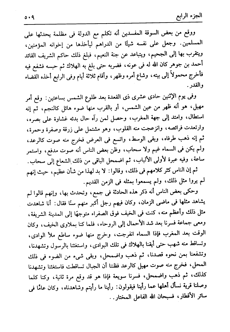 وَوَقع من بعض السوقة المفسدين أَنه تكلم مَعَ الدولة فِي مظْلمَة يحدثها على الْمُسلمين وَجعل على نَفسه شَيْئا من الدَّرَاهِم ليأخذها من إخوانه الْمُؤمنِينَ ويتقرب بهَا إِلَى الْجَحِيم ويتباعد عَن جنَّة النَّعيم فَبلغ ذَلِك حَاكم الشريف الْقَائِد أَحْمد بن جَوْهَر كَانَ الله لَهُ فِي عونه فَضَربهُ حَتَّى بلغ بِهِ الْهَلَاك ثمَّ حَبسه فشفع فِيهِ فَأخْرج مَحْمُولا إِلَى بَيته وشاع أمره وَظهر وَأقَام ثَلَاثَة أَيَّام وَفِي الرَّابِع أَخذه الْقَضَاء وَالْقدر وَفِي يَوْم الْإِثْنَيْنِ حادي عشري ذِي الْقعدَة بعد طُلُوع الشَّمْس بساعتين وَقع أَمر مهيل هُوَ أَنه ظهر من عين الشَّمْس أَو بِالْقربِ مِنْهَا ضوء هائل كالنجم ثمَّ إِنَّه استطال وامتد إِلَى جِهَة الْمغرب وَحصل لمن رَآهُ حَال بدئه غشاوة على بَصَره وارتعدت فرائصه وانزعجت مِنْهُ الْقُلُوب وَهُوَ مُشْتَمل على زرقة وصفرة وَحُمرَة ثمَّ إِنَّه ذهب طرفاه وبقى الْوسط واتسع فِي الْعرض فَخرج مِنْهُ صَوت كالرعد وَلم يكن فِي السَّمَاء غيم وَلَا سَحَاب وَظن بعض النَّاس أَنه صَوت مدفع وَاسْتمرّ سَاعَة وَفِيه عِبْرَة لأولى الْأَلْبَاب ثمَّ اضمحل الْبَاقِي من ذَلِك الشعاع إِلَى سَحَاب ثمَّ إِن النَّاس كثر كَلَامهم فِي ذَلِك وَقَالُوا لَا بُد لهَذَا من شَأْن عَظِيم حَيْثُ إِنَّهُم لم يرَوا مثل ذَلِك وَلم يسمعوا بِمثلِهِ فِي الزَّمن الْقَدِيم وَحكى بعض النَّاس أَنه ذكر هَذِه الْحَادِثَة فِي جمع وتحدث بهَا وَإِنَّهُم قَالُوا لم يُشَاهد مثلهَا فِي ماضي الزَّمَان وَكَانَ فيهم رجل أكبر مِنْهُم سنا فَقَالَ أَنا شاهدت مثل ذَلِك وَأعظم مِنْهُ كنت فِي الْخيف فَوق الصَّفْرَاء مُتَوَجها إِلَى الْمَدِينَة الشَّرِيفَة وَمَعِي جمَاعَة فسرنا بعد شدّ الْأَحْمَال إِلَى الروحاء فَلَمَّا كُنَّا بملاوي الْخيف وَكَانَ الْوَقْت بعد الْمغرب فَإِذا السَّمَاء انفرجت وَخرج مِنْهَا ضوء سَاطِع مَلأ الْوَادي وتساقط مِنْهُ شهب حَتَّى أيقنا بِالْهَلَاكِ فِي تِلْكَ الْبَوَادِي واستغثنا بالرسول وتشهدنا وتشفعنا بِمن نَحوه قصدنا ثمَّ ذهب واضمحل وبقى شئ من الضَّوْء فِي ذَلِك الْمحل فَخرج مِنْهُ صَوت مهيل كالرعد فظننا أَن الْجبَال تساقطت فاستغثنا وتشهدنا كَذَلِك ثمَّ ذهب واضمحل فسرنا سويعة فَإِذا هُوَ قد وَقع مرّة ثَانِيَة وَكُنَّا كلما وصلنا قَرْيَة نسْأَل أَهلهَا عَمَّا رَأينَا فَيَقُولُونَ رَأينَا مَا رَأَيْتُمْ وشاهدناه وَكَانَ عَاما فِي سَائِر الأقطار فسبحان الله الْفَاعِل الْمُخْتَار