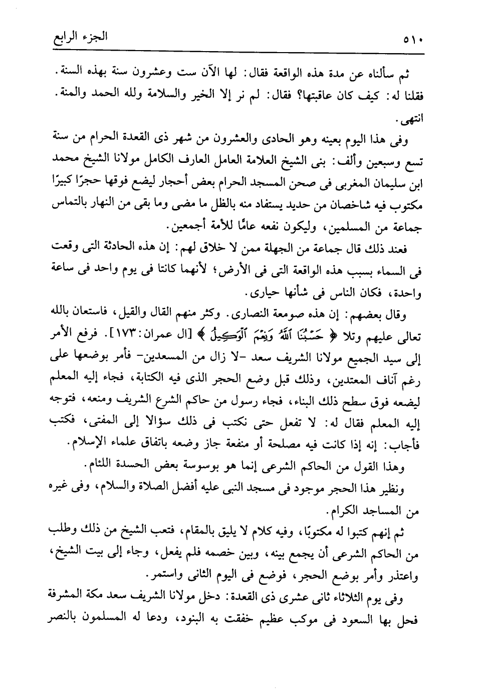 ثمَّ سألناه عَن مُدَّة هَذِه الْوَاقِعَة فَقَالَ لَهَا الْآن سِتّ وَعِشْرُونَ سنة بِهَذِهِ السّنة فَقُلْنَا لَهُ كَيفَ كَانَ عَاقبَتهَا فَقَالَ لم نر إِلَّا الْخَيْر والسلامة وَللَّه الْحَمد والْمنَّة انْتهى وَفِي هَذَا الْيَوْم بِعَيْنِه وَهُوَ الْحَادِي وَالْعشْرُونَ من شهر ذِي الْقعدَة الْحَرَام من سنة تسع وَسبعين وَألف بني الشَّيْخ الْعَلامَة الْعَامِل الْعَارِف الْكَامِل مَوْلَانَا الشَّيْخ مُحَمَّد ابْن سُلَيْمَان المغربي فِي صحن الْمَسْجِد الْحَرَام بعض أَحْجَار ليضع فَوْقهَا حجرا كَبِيرا مَكْتُوب فِيهِ شاخصان من حَدِيد يُسْتَفَاد مِنْهُ بالظل مَا مضى وَمَا بقى من النَّهَار بالتماس جمَاعَة من الْمُسلمين وليكون نَفعه عَاما للْأمة أَجْمَعِينَ فَعِنْدَ ذَلِك قَالَ جمَاعَة من الجهلة مِمَّن لَا خلاق لَهُم إِن هَذِه الْحَادِثَة الَّتِي وَقعت فِي السَّمَاء بِسَبَب هَذِه الْوَاقِعَة الَّتِي فِي الأَرْض لِأَنَّهُمَا كَانَتَا فِي يَوْم وَاحِد فِي سَاعَة وَاحِدَة فَكَانَ النَّاس فِي شَأْنهَا حيارى وَقَالَ بَعضهم إِن هَذِه صومعة النَّصَارَى وَكثر مِنْهُم القال والقيل فاستعان بِاللَّه تَعَالَى عَلَيْهِم وتلا {حَسبُناً الله وَنِعْمَ اَلْوَكِيلُ} آل عمرَان 173 فَرفع الْأَمر إِلَى سيد الْجَمِيع مَوْلَانَا الشريف سعد لَا زَالَ من المسعدين فَأمر بوضعها على رغم آناف الْمُعْتَدِينَ وَذَلِكَ قبل وضع الْحجر الَّذِي فِيهِ الْكِتَابَة فجَاء إِلَيْهِ الْمعلم ليضعه فَوق سطح ذَلِك الْبناء فجَاء رَسُول من حَاكم الشَّرْع الشريف وَمنعه فَتوجه إِلَيْهِ الْمعلم فَقَالَ لَهُ لَا تفعل حَتَّى نكتب فِي ذَلِك سؤالا إِلَى الْمُفْتى فَكتب فَأجَاب إِنَّه إِذا كَانَت فِيهِ مصلحَة أَو مَنْفَعَة جَازَ وَضعه بِاتِّفَاق عُلَمَاء الْإِسْلَام وَهَذَا القَوْل من الْحَاكِم الشَّرْعِيّ إِنَّمَا هُوَ بوسوسة بعض الحسدة اللئام وَنَظِير هَذَا الْحجر مَوْجُود فِي مَسْجِد النَّبِي عَلَيْهِ أفضل الصَّلَاة وَالسَّلَام وَفِي غَيره من الْمَسَاجِد الْكِرَام ثمَّ إِنَّهُم كتبُوا لَهُ مَكْتُوبًا وَفِيه كَلَام لَا يَلِيق بالْمقَام فتعب الشَّيْخ من ذَلِك وَطلب من الْحَاكِم الشَّرْعِيّ أَن يجمع بَينه وَبَين خَصمه فَلم يفعل وَجَاء إِلَى بَيت الشَّيْخ وَاعْتذر وَأمر بِوَضْع الْحجر فَوضع فِي الْيَوْم الثَّانِي وَاسْتمرّ وَفِي يَوْم الثُّلَاثَاء ثَانِي عشري ذِي الْقعدَة دخل مَوْلَانَا الشريف سعد مَكَّة المشرفة فَحل بهَا السُّعُود فِي موكب عَظِيم خَفَقت بِهِ البنود ودعا لَهُ الْمُسلمُونَ بالنصر