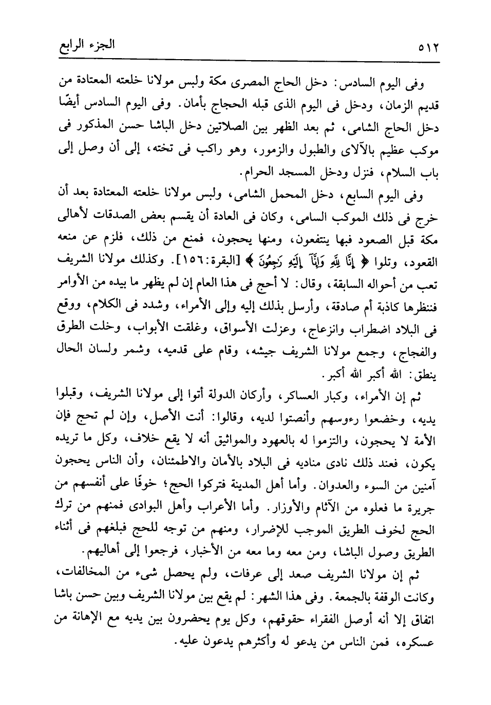 وَفِي الْيَوْم السَّادِس دخل الْحَاج الْمصْرِيّ مَكَّة وَلبس مَوْلَانَا خلعته الْمُعْتَادَة من قديم الزَّمَان وَدخل فِي الْيَوْم الَّذِي قبله الْحجَّاج بِأَمَان وَفِي الْيَوْم السَّادِس أَيْضا دخل الْحَاج الشَّامي ثمَّ بعد الظّهْر بَين الصَّلَاتَيْنِ دخل الباشا حسن الْمَذْكُور فِي موكب عَظِيم بالآلاى والطبول والزمور وَهُوَ رَاكب فِي تخته إِلَى أَن وصل إِلَى بَاب السَّلَام فَنزل وَدخل الْمَسْجِد الْحَرَام وَفِي الْيَوْم السَّابِع دخل الْمحمل الشَّامي وَلبس مَوْلَانَا خلعته الْمُعْتَادَة بعد أَن خرج فِي ذَلِك الموكب السَّامِي وَكَانَ فِي الْعَادة أَن يقسم بعض الصَّدقَات لأهالي مَكَّة قبل الصعُود فبها يَنْتَفِعُونَ وَمِنْهَا يحجون فَمنع من ذَلِك فَلَزِمَ عَن مَنعه الْقعُود وتلوا {إِنا للهِ وَإِنَّا إليهِ رَاجِعوُنَ} الْبَقَرَة 156 وَكَذَلِكَ مَوْلَانَا الشريف تَعب من أَحْوَاله السَّابِقَة وَقَالَ لَا أحج فِي هَذَا الْعَام إِن لم يظْهر مَا بِيَدِهِ من الْأَوَامِر فننظرها كَاذِبَة أم صَادِقَة وَأرْسل بذلك إِلَيْهِ وَإِلَى الْأُمَرَاء وشدد فِي الْكَلَام وَوَقع فِي الْبِلَاد اضْطِرَاب وانزعاج وعزلت الْأَسْوَاق وغلقت الْأَبْوَاب وخلت الطّرق والفجاج وَجمع مَوْلَانَا الشريف جَيْشه وَقَامَ على قَدَمَيْهِ وشمر ولسان الْحَال ينْطق الله أكبر الله أكبر ثمَّ إِن الْأُمَرَاء وكبار العساكر وأركان الدولة أَتَوا إِلَى مَوْلَانَا الشريف وقبلوا يَدَيْهِ وخضعوا رُءُوسهم وأنصتوا لَدَيْهِ وَقَالُوا أَنْت الأَصْل وَإِن لم تحج فَإِن الْأمة لَا يحجون والتزموا لَهُ بالعهود والمواثيق أَنه لَا يَقع خلاف وكل مَا تريده يكون فَعِنْدَ ذَلِك نَادَى مناديه فِي الْبِلَاد بالأمان والاطمئنان وَأَن النَّاس يحجون آمِنين من السوء والعدوان وَأما أهل الْمَدِينَة فتركوا الْحَج خوفًا على أنفسهم من جريرة مَا فَعَلُوهُ من الآثام والأوزار وَأما الْأَعْرَاب وَأهل الْبَوَادِي فَمنهمْ من ترك الْحَج لخوف الطَّرِيق الْمُوجب للإضرار وَمِنْهُم من توجه لِلْحَجِّ فَبَلغهُمْ فى أثْنَاء الطَّرِيق وُصُول الباشا وَمن مَعَه وَمَا مَعَه من الْأَخْبَار فَرَجَعُوا إِلَى أَهَالِيهمْ ثمَّ إِن مَوْلَانَا الشريف صعد إِلَى عَرَفَات وَلم يحصل شئ من المخالفات وَكَانَت الوقفة بِالْجمعَةِ وَفِي هَذَا الشَّهْر لم يَقع بَين مَوْلَانَا الشريف وَبَين حسن باشا اتِّفَاق إِلَّا أَنه أوصل الْفُقَرَاء حُقُوقهم وكل يَوْم يحْضرُون بَين يَدَيْهِ مَعَ الإهانة من عسكره فَمن النَّاس من يَدْعُو لَهُ وَأَكْثَرهم يدعونَ عَلَيْهِ