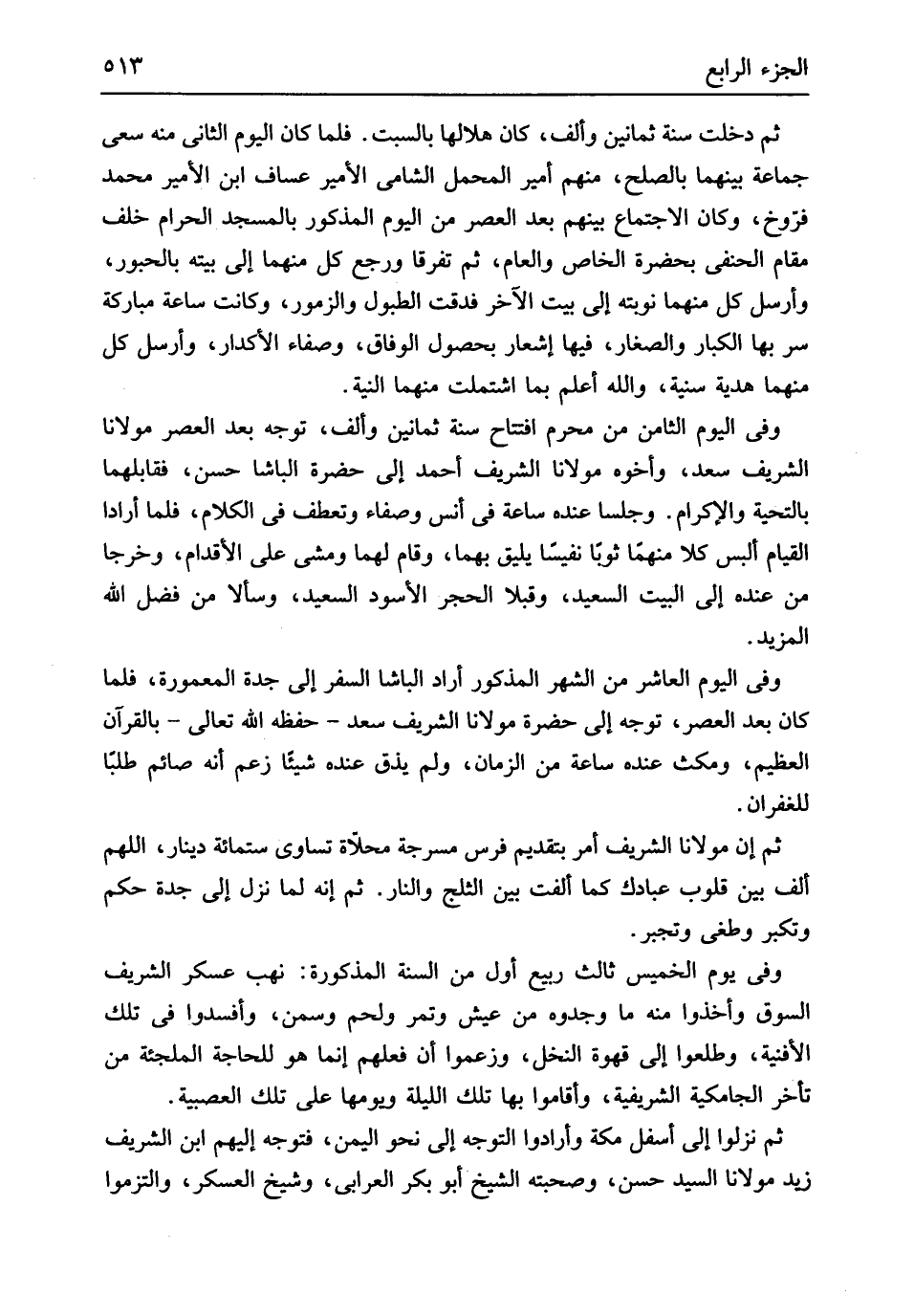 ثمَّ دخلت سنة ثَمَانِينَ وَألف كَانَ هلالها بالسبت فَلَمَّا كَانَ الْيَوْم الثَّانِي مِنْهُ سعى جمَاعَة بَينهمَا بِالصُّلْحِ مِنْهُم أَمِير الْمحمل الشَّامي الْأَمِير عساف ابْن الْأَمِير مُحَمَّد فروخ وَكَانَ الِاجْتِمَاع بَينهم بعد الْعَصْر من الْيَوْم الْمَذْكُور بِالْمَسْجِدِ الْحَرَام خلف مقَام الْحَنَفِيّ بِحَضْرَة الْخَاص وَالْعَام ثمَّ تفَرقا وَرجع كل مِنْهُمَا إِلَى بَيته بالحبور وَأرْسل كل مِنْهُمَا نوبَته إِلَى بَيت الآخر فدقت الطبول والزمور وَكَانَت سَاعَة مباركة سر بهَا الْكِبَار وَالصغَار فِيهَا إِشْعَار بِحُصُول الْوِفَاق وصفاء الأكدار وَأرْسل كل مِنْهُمَا هَدِيَّة سنية وَالله أعلم بِمَا اشْتَمَلت مِنْهُمَا النِّيَّة وَفِي الْيَوْم الثَّامِن من محرم افْتِتَاح سنة ثَمَانِينَ وَألف توجه بعد الْعَصْر مَوْلَانَا الشريف سعد وَأَخُوهُ مَوْلَانَا الشريف أَحْمد إِلَى حَضْرَة الباشا حسن فقابلهما بالتحية وَالْإِكْرَام وجلسا عِنْده سَاعَة فِي أنس وصفاء وَتعطف فِي الْكَلَام فَلَمَّا أَرَادَا الْقيام ألبس كلا مِنْهُمَا ثوبا نفيساً يَلِيق بهما وَقَامَ لَهما وَمَشى على الْأَقْدَام وخرجا من عِنْده إِلَى الْبَيْت السعيد وقبلا الْحجر الْأسود السعيد وسألا من فضل الله الْمَزِيد وَفِي الْيَوْم الْعَاشِر من الشَّهْر الْمَذْكُور أَرَادَ الباشا السّفر إِلَى جدة المعمورة فَلَمَّا كَانَ بعد الْعَصْر توجه إِلَى حَضْرَة مَوْلَانَا الشريف سعد حفظه الله تَعَالَى بِالْقُرْآنِ الْعَظِيم وَمكث عِنْده سَاعَة من الزَّمَان وَلم يذقْ عِنْده شَيْئا زعم أَنه صَائِم طلبا للغفران ثمَّ إِن مَوْلَانَا الشريف أَمر بِتَقْدِيم فرس مسرجة محلآة تَسَاوِي سِتّمائَة دِينَار اللَّهُمَّ ألف بَين قُلُوب عِبَادك كَمَا ألفت بَين الثَّلج وَالنَّار ثمَّ إِنَّه لما نزل إِلَى جدة حكم وتكبر وطغى وتجبر وَفِي يَوْم الْخَمِيس ثَالِث ربيع أول من السّنة الْمَذْكُورَة نهب عَسْكَر الشريف السُّوق وَأخذُوا مِنْهُ مَا وجدوه من عَيْش وتمر وَلحم وَسمن وأفسدوا فِي تِلْكَ الأفنية وطلعوا إِلَى قهوة النّخل وَزَعَمُوا أَن فعلهم إِنَّمَا هُوَ للْحَاجة الملجئة من تَأَخّر الجامكية الشريفية وَأَقَامُوا بهَا تِلْكَ اللَّيْلَة ويومها على تِلْكَ العصبية ثمَّ نزلُوا إِلَى أَسْفَل مَكَّة وَأَرَادُوا التَّوَجُّه إِلَى نَحْو الْيمن فَتوجه إِلَيْهِم ابْن الشريف زيد مَوْلَانَا السَّيِّد حسن وصحبته الشَّيْخ أَبُو بكر العرابي وَشَيخ الْعَسْكَر والتزموا