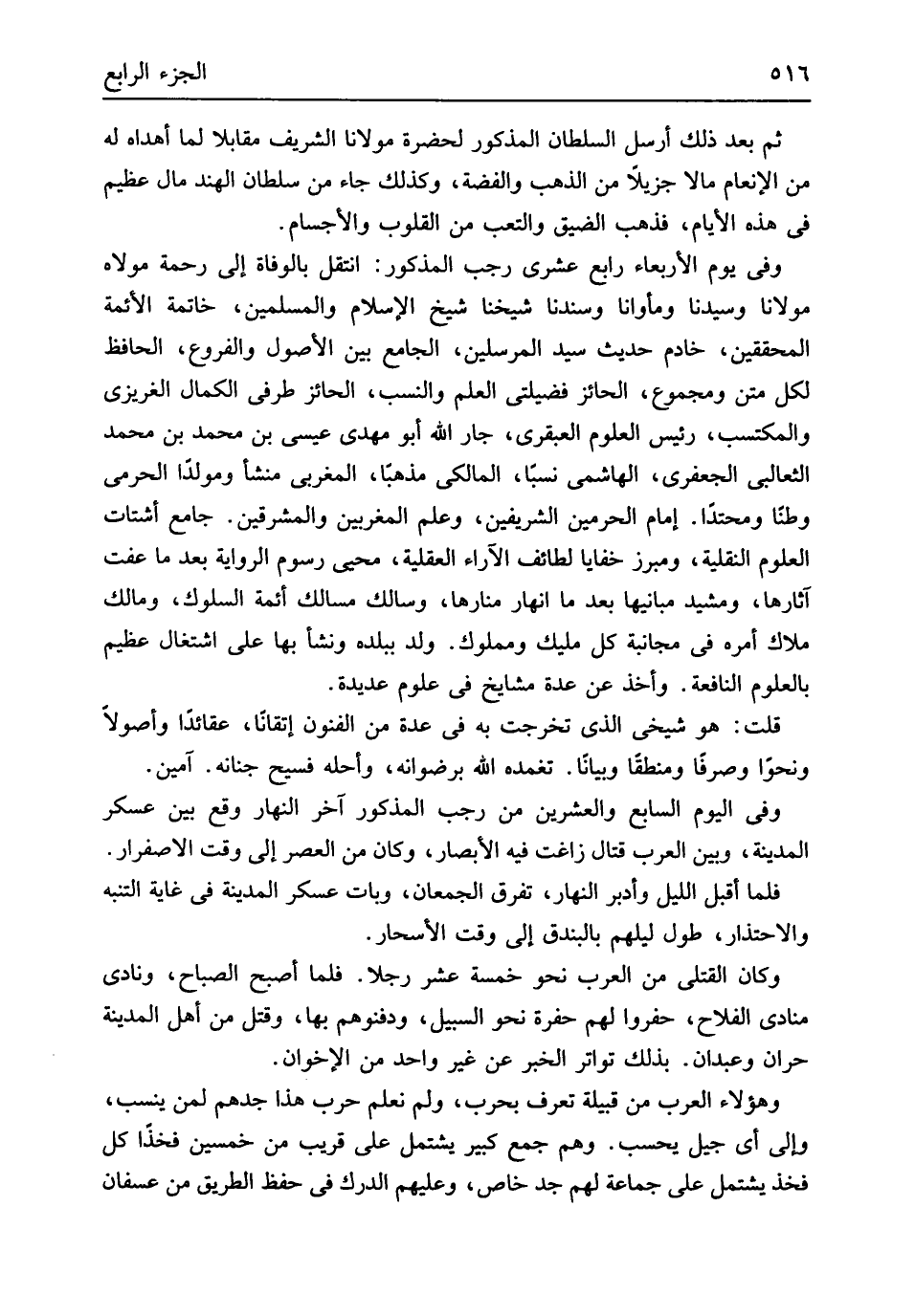 ثمَّ بعد ذَلِك أرسل السُّلْطَان الْمَذْكُور لحضرة مَوْلَانَا الشريف مُقَابلا لما أهداه لَهُ من الإنعام مَالا جزيلاً من الذَّهَب وَالْفِضَّة وَكَذَلِكَ جَاءَ من سُلْطَان الْهِنْد مَال عَظِيم فِي هَذِه الْأَيَّام فَذهب الضّيق والتعب من الْقُلُوب والأجسام وَفِي يَوْم الْأَرْبَعَاء رَابِع عشري رَجَب الْمَذْكُور انْتقل بالوفاة إِلَى رَحْمَة مَوْلَاهُ مَوْلَانَا وَسَيِّدنَا ومأوانا وسندنا شَيخنَا شيخ الْإِسْلَام وَالْمُسْلِمين خَاتِمَة الْأَئِمَّة الْمُحَقِّقين خَادِم حَدِيث سيد الْمُرْسلين الْجَامِع بَين الْأُصُول وَالْفُرُوع الْحَافِظ لكل متن ومجموع الْحَائِز فضيلتي الْعلم وَالنّسب الْحَائِز طرفِي الْكَمَال الغريزي والمكتسب رَئِيس الْعُلُوم العبقري جَار الله أَبُو مهْدي عِيسَى بن مُحَمَّد بن مُحَمَّد الثعالبي الْجَعْفَرِي الْهَاشِمِي نسبا الْمَالِكِي مذهبا المغربي منشأ ومولداً الحرمي وطناً ومحتداً إِمَام الْحَرَمَيْنِ الشريفين وَعلم المغربين والمشرقين جَامع أشتات الْعُلُوم النقلية ومبرز خفايا لطائف الآراء الْعَقْلِيَّة محيى رسوم الرِّوَايَة بعد مَا عفت آثارها ومشيد مبانيها بعد مَا انهار منارها وسالك مسالك أَئِمَّة السلوك وَمَالك ملاك أمره فِي مجانبة كل مليك ومملوك ولد بِبَلَدِهِ وَنَشَأ بهَا على اشْتِغَال عَظِيم بالعلوم النافعة وَأخذ عَن عدَّة مَشَايِخ فِي عُلُوم عديدة قلت هُوَ شَيْخي الَّذِي تخرجت بِهِ فِي عدَّة من الْفُنُون إتقاناً عقائداً وأصولاً ونحواً وصرفاً ومنطقاً وبياناً تغمده الله برضوانه وأحله فسيح جنانه آمين وَفِي الْيَوْم السَّابِع وَالْعِشْرين من رَجَب الْمَذْكُور آخر النَّهَار وَقع بَين عَسْكَر الْمَدِينَة وَبَين الْعَرَب قتال زاغت فِيهِ الْأَبْصَار وَكَانَ من الْعَصْر إِلَى وَقت الاصفرار فَلَمَّا أقبل اللَّيْل وَأدبر النَّهَار تفرق الْجَمْعَانِ وَبَات عَسْكَر الْمَدِينَة فى غَايَة التنبه والاحتذار طول ليلهم بالبندق إِلَى وَقت الأسحار وَكَانَ الْقَتْلَى من الْعَرَب نَحْو خَمْسَة عشر رجلا فَلَمَّا أصبح الصَّباح ونادى مُنَادِي الْفَلاح حفروا لَهُم حُفْرَة نَحْو السَّبِيل ودفنوهم بهَا وَقتل من أهل الْمَدِينَة حران وعبدان بذلك تَوَاتر الخبرعن غير وَاحِد من الإخوان وَهَؤُلَاء الْعَرَب من قَبيلَة تعرف بِحَرب وَلم نعلم حَرْب هَذَا جدهم لمن ينْسب وَإِلَى أَي جيل يحْسب وهم جمع كَبِير يشْتَمل على قريب من خمسين فخذاً كل فَخذ يشْتَمل على جمَاعَة لَهُم جد خَاص وَعَلَيْهِم الدَّرك فِي حفظ الطَّرِيق من عسفان