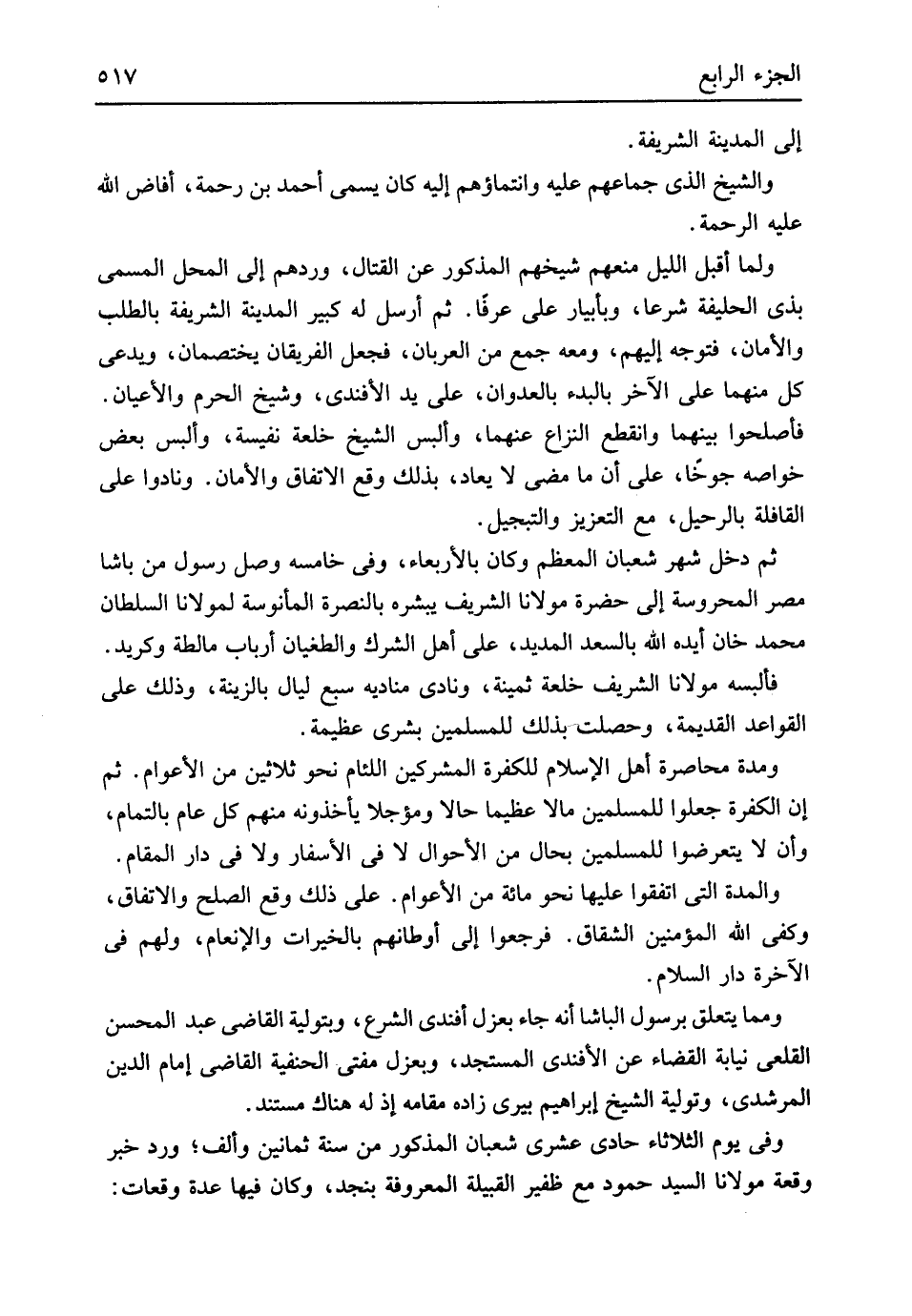 إِلَى الْمَدِينَة الشَّرِيفَة وَالشَّيْخ الَّذِي جماعهم عَلَيْهِ وانتماؤهم إِلَيْهِ كَانَ يُسمى أَحْمد بن رَحْمَة أَفَاضَ الله عَلَيْهِ الرَّحْمَة وَلما أقبل اللَّيْل مَنعهم شيخهم الْمَذْكُور عَن الْقِتَال وردهم إِلَى الْمحل الْمُسَمّى بِذِي الحليفة شرعا وبأبيار عَليّ عرفا ثمَّ أرسل لَهُ كَبِير الْمَدِينَة الشَّرِيفَة بِالطَّلَبِ والأمان فَتوجه إِلَيْهِم وَمَعَهُ جمع من العربان فَجعل الْفَرِيقَانِ يختصمان وَيَدعِي كل مِنْهُمَا على الآخر بالبدء بالعدوان على يَد الأفندي وَشَيخ الْحرم والأعيان فأصلحوا بَينهمَا وَانْقطع النزاع عَنْهُمَا وألبس الشَّيْخ خلعة نفيسة وألبس بعض خواصه جوخاً على أَن مَا مضى لَا يُعَاد بذلك وَقع الِاتِّفَاق والأمان وَنَادَوْا على الْقَافِلَة بالرحيل مَعَ التعزيز والتبجيل ثمَّ دخل شهر شعْبَان الْمُعظم وَكَانَ بالأربعاء وَفِي خامسه وصل رَسُول من باشا مصر المحروسة إِلَى حَضْرَة مَوْلَانَا الشريف يبشره بالنصرة المأنوسة لمولانا السُّلْطَان مُحَمَّد خَان أيده الله بالسعد المديد على أهل الشّرك والطغيان أَرْبَاب مالطة وكريد فألبسه مَوْلَانَا الشريف خلعة ثمينة ونادى مناديه سبع لَيَال بالزينة وَذَلِكَ على الْقَوَاعِد الْقَدِيمَة وحصلت بذلك للمسليمن بشرى عَظِيمَة وَمُدَّة محاصرة أهل الْإِسْلَام للكفرة الْمُشْركين اللئام نَحْو ثَلَاثِينَ من الأعوام ثمَّ إِن الْكَفَرَة جعلُوا للْمُسلمين مَالا عَظِيما حَالا ومؤجلاً يأخذونه مِنْهُم كل عَام بالتمام وَأَن لَا يتَعَرَّضُوا للْمُسلمين بِحَال من الْأَحْوَال لَا فِي الْأَسْفَار وَلَا فِي دَار الْمقَام والمدة الَّتِي اتَّفقُوا عَلَيْهَا نَحْو مائَة من الأعوام على ذَلِك وَقع الصُّلْح والاتفاق وَكفى الله الْمُؤمنِينَ الشقاق فَرَجَعُوا إِلَى أوطانهم بالخيرات والإنعام وَلَهُم فِي الْآخِرَة دَار السَّلَام وَمِمَّا يتَعَلَّق برَسُول الباشا أَنه جَاءَ بعزل أَفَنْدِي الشَّرْع وبتولية القَاضِي عبد المحسن القلعي نِيَابَة الْقَضَاء عَن الأفندي المستجد وبعزل مفتي الْحَنَفِيَّة القَاضِي إِمَام الدّين المرشدي وتولية الشَّيْخ إِبْرَاهِيم بيري زَاده مقَامه إِذْ لَهُ هُنَاكَ مُسْتَند وَفِي يَوْم الثُّلَاثَاء حادي عشري شعْبَان الْمَذْكُور من سنة ثَمَانِينَ وَألف ورد خبر وقْعَة مَوْلَانَا السَّيِّد حمود مَعَ ظفير الْقَبِيلَة الْمَعْرُوفَة بِنَجْد وَكَانَ فِيهَا عدَّة وقعات