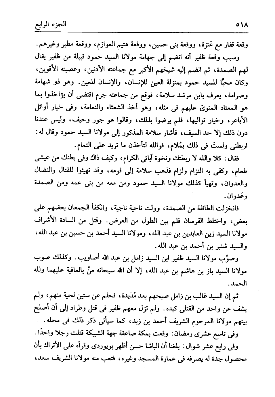 وقْعَة قفاز مَعَ عَنزة ووقعة بني حُسَيْن ووقعة هتيم العوازم ووقعة مطير وَغَيرهم وَسبب وقْعَة ظفير أَنه انْضَمَّ إِلَى جهامة مَوْلَانَا السَّيِّد حمود قَبيلَة من ظفير يُقَال لَهُم الصمدة ثمَّ انْضَمَّ إِلَيْهِ شيخهم الْأَكْبَر مَعَ جماعته الأدنين وعصبته الأقوين وَكَانَ محباً للسَّيِّد حمود بِمَنْزِلَة الْعين للْإنْسَان وَالْإِنْسَان للعين وَهُوَ ذُو شهامة وصرامة يعرف بِابْن مرشد سَلامَة فَوَقع من جماعته جرم اقْتضى أَن يؤاخذوا بِمَا هُوَ الْمُعْتَاد الْمَنوِي عَلَيْهِم فِي مثله وَهُوَ أَخذ الشعْثَاء والنعامة وَفِي خِيَار أَوَائِل الأباعر وَخيَار تواليها فَلم يرْضوا بذلك وَقَالُوا هُوَ جور وحيف وَلَيْسَ عندنَا دون ذَلِك إِلَّا حد السَّيْف فَأَشَارَ سَلامَة الْمَذْكُور إِلَى مَوْلَانَا السَّيِّد حمود وَقَالَ لَهُ اربطني ولستَ فِي ذَلِك بمُلام فوَاللَّه لتأخذن مَا تُرِيدُ على التَّمام فَقَالَ كلا وَالله لَا ربطتك ونخوة آبَائِي الْكِرَام وَكَيف ذَاك وَفِي بَطْنك من عيشي طَعَام وَكفى بِهِ الْتِزَام ولزام فَذهب سَلامَة إِلَى قومه وَقد تهيئوا لِلْقِتَالِ والنضال والعدوان وتهيأ كَذَلِك مَوْلَانَا السَّيِّد حمود وَمن مَعَه من بني عَمه وَمن الصمدة وعَدوان فانخزلت الطَّائِفَة من الصمدة وَوَلَّتْ نَاحيَة نَاجِية وانكفأ الْجَمْعَانِ بَعضهم على بعض وَاخْتَلَطَ الفرسان فَلم يبن الطول من الْعرض وَقتل من السَّادة الْأَشْرَاف مَوْلَانَا السَّيِّد زين العابدين بن عبد الله ومولانا السَّيِّد أَحْمد بن حُسَيْن بن عبد الله وَالسَّيِّد شنبر بن أَحْمد بن عبد الله وَصوب مَوْلَانَا السَّيِّد ظفير ابْن السَّيِّد زامل بن عبد الله أصاويب وَكَذَلِكَ صوب مَوْلَانَا السَّيِّد باز بن هَاشم بن عبد الله إِلَّا أَن الله سُبْحَانَهُ منَّ بالعافية عَلَيْهِمَا وَللَّه الْحَمد ثمَّ إِن السَّيِّد غَالب بن زامل صبحهمْ بعد مُدَيدة فحلم عَن سِتِّينَ لحية مِنْهُم وَلم يشف عَن وَاحِد من الْقَتْلَى كبده وَلم تزل مَعَهم ظفير فِي قتل وطراد إِلَى أَن أصلح بَينهم مَوْلَانَا المرحوم الشريف أَحْمد بن زيد كَمَا سَيَأْتِي ذكر ذَلِك فِي مَحَله وَفِي تَاسِع عشري رَمَضَان وَقعت بِمَكَّة صَاعِقَة جِهَة الشبيكة قتلت رجلا وَاحِدًا وَفِي رَابِع عشر شَوَّال بلغنَا أَن الباشا حسن اْظهر بويوردي وقرأه على الأتراك بِأَن محصول جدة لَهُ يصرفهُ فِي عمَارَة الْمَسْجِد وَغَيره فتعب مِنْهُ مَوْلَانَا الشريف سعد