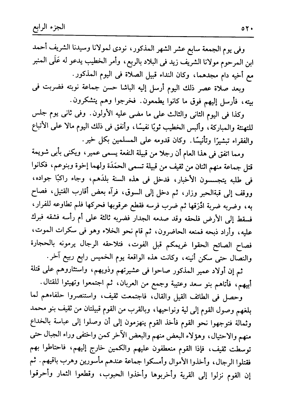 وَفِي يَوْم الْجُمُعَة سَابِع عشر الشَّهْر الْمَذْكُور نُودي لمولانا وَسَيِّدنَا الشريف أَحْمد ابْن المرحوم مَوْلَانَا الشريف زيد فِي الْبِلَاد بِالربعِ وَأمر الْخَطِيب يَدْعُو لَهُ عَلَى الْمِنْبَر مَعَ أَخِيه دَامَ مجدهما وَكَانَ النداء قبيل الصَّلَاة فِي الْيَوْم الْمَذْكُور وَبعد صَلَاة عصر ذَلِك الْيَوْم أرسل إِلَيْهِ الباشا حسن جمَاعَة نوبَته فَضربت فِي بَيته فَأرْسل إِلَيْهِم فَوق مَا كَانُوا يطمعون فَخَرجُوا وهم يتشكرون وَكَذَا فِي الْيَوْم الثَّانِي وَالثَّالِث على مَا مضى عَلَيْهِ الْأَولونَ وَفِي ثَانِي يَوْم جلس للتهنئة والمباركة وألبس الْخَطِيب ثوبا نفيساً وَأنْفق فِي ذَلِك الْيَوْم مَالا على الأتباع والفقراء تبشيراً وتأنيساً وَكَانَ قدومه على الْمُسلمين بِكُل خير وَمِمَّا اتّفق فِي هَذَا الْعَام أَن رجلا من قَبيلَة النفعة يُسمى عُمَيْر ويكنى بِأبي شويمة قتل جمَاعَة مِنْهُم اثْنَان من ثَقِيف من قَبيلَة تسمى الحمَدَة وَلَهُمَا إخْوَة وبنوعم فَكَانُوا فِي طلبه يتجسسون الْأَخْبَار فَدخل فِي هَذِه السّنة بلدَهم وَجَاء رَاكِبًا جَوَاده ووقف إِلَى قبَّة الحبر وزار ثمَّ دخل إِلَى السُّوق فَرَآهُ بعض أقَارِب الْقَتِيل فصاح بِهِ وضربه ضَرْبَة ادَّرَقها ثمَّ ضرب فرسه فَقطع عرقوبها فحركها فَلم تطاوعه للفرار فَسقط إِلَى الأَرْض فَلحقه وَقد صدمه الْجِدَار فَضَربهُ ثَالِثَة على أم رَأسه فشقه فبرك عَلَيْهِ وَأَرَادَ ذبحه فَمَنعه الْحَاضِرُونَ ثمَّ قَامَ نَحْو الْخَلَاء وَهُوَ فى سَكَرَات الْمَوْت فصاح الصائح الحقوا غريمكم قبل الْفَوْت فتلاحقه الرِّجَال يرمونه بِالْحِجَارَةِ والنضال حَتَّى سكن أنينه وَكَانَت هَذِه الْوَاقِعَة يَوْم الْخَمِيس رَابِع ربيع آخر ثمَّ إِن أَوْلَاد عُمَيْر الْمَذْكُور صاحوا فى عشيرتهم وذويهم واستشاروهم على قتلة أَبِيهِم فَأَتَاهُم بَنو سعد وعتيبة وَجمع من العربان ثمَّ اجْتَمعُوا وتهيئوا لِلْقِتَالِ وَحصل فِي الطَّائِف القيل والقال فاجتمعت ثَقِيف واستنصروا حلفاءهم لما بَلغهُمْ وُصُول الْقَوْم إِلَى لية ونواحيها وبالقرب من الْقَوْم قبيلتان من ثَقِيف بَنو مُحَمَّد وثمالة فتوجهوا نَحْو الْقَوْم فَأخذ الْقَوْم ينهزمون إِلَى أَن وصلوا إِلَى عباسة بالخداع مِنْهُم والاحتيال وَهَؤُلَاء الْبَعْض مِنْهُم وَالْبَعْض الآخر كمن واختفى وَرَاء الْجبَال حَتَّى توسطت ثَقِيف فَإِذا الْقَوْم منعطفون عَلَيْهِم والكمين خَارج إِلَيْهِم فاحتاطوا بهم فَقتلُوا الرِّجَال وَأخذُوا الْأَمْوَال وأمسكوا جمَاعَة عِنْدهم مأسورين وهرب باقيهم ثمَّ إِن الْقَوْم نزلُوا إِلَى الْقرْيَة وأخربوها وَأخذُوا الْحُبُوب وَقَطعُوا الثِّمَار وأحرقوا