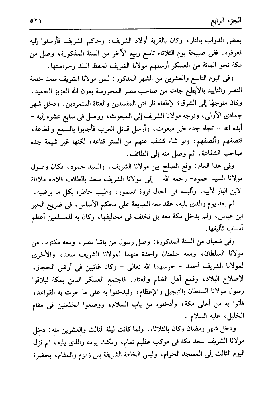 بعض الدَّوَابّ بالنَّار وَكَانَ بالقرية أَوْلَاد الشريف وحاكم الشريف فارسلوا إِلَيْهِ فعرفوه فَفِي صَبِيحَة يَوْم الثُّلَاثَاء تَاسِع ربيع الآخر من السّنة الْمَذْكُورَة وصل من مَكَّة نَحْو الْمِائَة من الْعَسْكَر أرسلهم مَوْلَانَا الشريف لحفظ الْبَلَد وحراستها وَفِي الْيَوْم التَّاسِع وَالْعِشْرين من الشَّهْر الْمَذْكُور لبس مَوْلَانَا الشريف سعد خلعة النَّصْر والتأييد بِالْأَبْطح جَاءَتْهُ من صَاحب مصر المحروسة بعون الله الْعَزِيز الحميد وَكَانَ مُتَوَجها إِلَى الشرق لإطفاء نَار فتن المفسدين والعتاة المتمردين وَدخل شهر جُمَادَى الأولى وَتوجه مَوْلَانَا الشريف إِلَى الْمَبْعُوث وَوصل فِي سَابِع عشره إِلَيْهِ أيده الله تجاه جده خير مَبْعُوث وَأرْسل قبائل الْعَرَب فَأَجَابُوا بِالسَّمْعِ وَالطَّاعَة فنصفهم وأنصفهم وَلَو شَاءَ كشف عَنْهُم من السّتْر قناعه لَكِنَّهَا غير شِيمَة جده صَاحب الشَّفَاعَة ثمَّ وصل مِنْهُ إِلَى الطَّائِف وَفِي هَذَا الْعَام وَقع الصُّلْح بَين مَوْلَانَا الشريف وَالسَّيِّد حمود فَكَانَ وُصُول مَوْلَانَا السَّيِّد حمود رَحمَه الله إِلَى مَوْلَانَا الشريف سعد بِالطَّائِف فلاقاه ملاقاة الابْن الْبَار لِأَبِيهِ وَألبسهُ فِي الْحَال فَرْوَة السمور وَطيب خاطره بِكُل مَا يرضيه ثمَّ بعد يَوْم وَالَّذِي يَلِيهِ عقد مَعَه الْمُبَايعَة على مُحكم الأساس فِي ضريح الحبر ابْن عَبَّاس وَلم يدْخل مَكَّة مَعَه بل تخلف فِي مخاليفها وَكَانَ بِهِ للْمُسلمين أعظم أَسبَاب تأليفها وَفِي شعْبَان من السّنة الْمَذْكُورَة وصل رَسُول من باشا مصر وَمَعَهُ مَكْتُوب من مَوْلَانَا السُّلْطَان وَمَعَهُ خلعتان وَاحِدَة مِنْهُمَا لمولانا الشريف سعد وَالْأُخْرَى لمولانا الشريف أَحْمد حرسهما الله تَعَالَى وَكَانَا غائبين فِي أَرض الْحجاز لإِصْلَاح الْبِلَاد وقمع أهل الظُّلم والعِناد فَاجْتمع الْعَسْكَر الَّذين بِمَكَّة ليلاقوا رَسُول مَوْلَانَا السُّلْطَان بالتبجيل والإعظام وليدخلوا بِهِ على مَا جرت بِهِ الْقَوَاعِد فَأتوا بِهِ من أَعلَى مَكَّة وأدخلوه من بَاب السَّلَام وَوَضَعُوا الخلعتين فِي مقَام الْخَلِيل عَلَيْهِ السَّلَام وَدخل شهر رَمَضَان وَكَانَ بالثلاثاء وَلما كَانَت لَيْلَة الثَّالِث وَالْعِشْرين مِنْهُ دخل مَوْلَانَا الشريف سعد مَكَّة فِي موكب عَظِيم تَمام وَمكث يَوْمه وَالَّذِي يَلِيهِ ثمَّ نزل الْيَوْم الثَّالِث إِلَى الْمَسْجِد الْحَرَام وَلبس الخلعة الشَّرِيفَة بَين زَمْزَم وَالْمقَام بِحَضْرَة