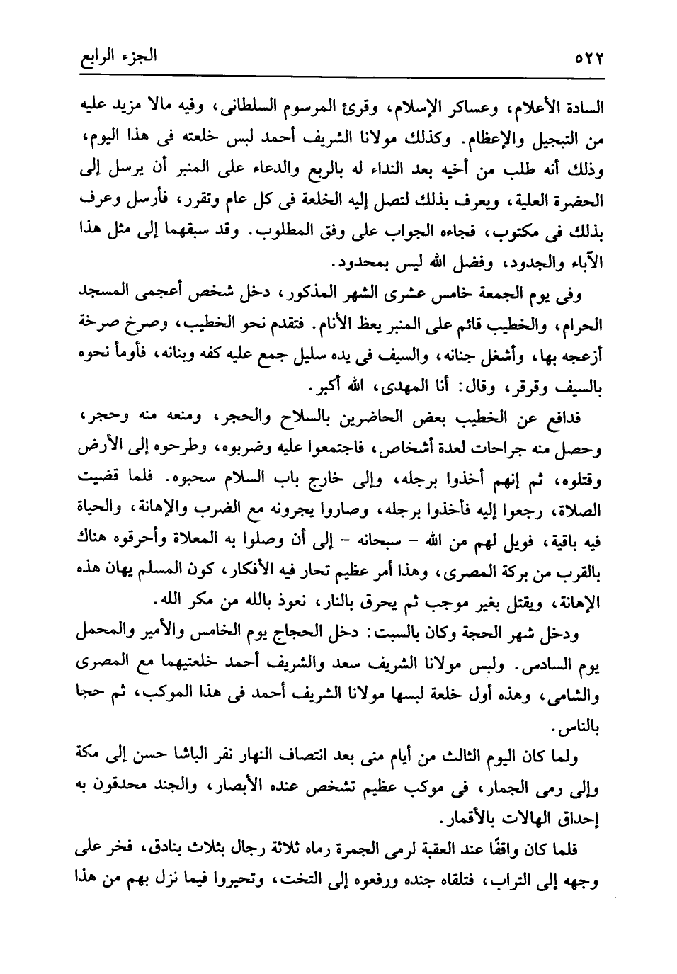 السَّادة الْأَعْلَام وعساكر الْإِسْلَام وَقُرِئَ المرسوم السلطاني وَفِيه مَالا مزِيد عَلَيْهِ من التبجيل والإعظام وَكَذَلِكَ مَوْلَانَا الشريف أَحْمد لبس خلعته فِي هَذَا الْيَوْم وَذَلِكَ أَنه طلب من أَخِيه بعد النداء لَهُ بِالربعِ وَالدُّعَاء على الْمِنْبَر أَن يُرْسل إِلَى الحضرة الْعلية وَيعرف بذلك لتصل إِلَيْهِ الخلعة فِي كل عَام وتقرر فَأرْسل وَعرف بذلك فِي مَكْتُوب فَجَاءَهُ الْجَواب على وفْق الْمَطْلُوب وَقد سبقهما إِلَى مثل هَذَا الْآبَاء والجدود وَفضل الله لَيْسَ بمحدود وَفِي يَوْم الْجُمُعَة خَامِس عشري الشَّهْر الْمَذْكُور دخل شخص أعجمي الْمَسْجِد الْحَرَام والخطيب قَائِم على الْمِنْبَر يعظ الْأَنَام فَتقدم نَحْو الْخَطِيب وصرخ صرخة أزعجه بهَا وأشغل جنانه وَالسيف فِي يَده سليل جمع عَلَيْهِ كَفه وبنانه فَأَوْمأ نَحوه بِالسَّيْفِ وقرقر وَقَالَ أَنا الْمهْدي الله أكبر فدافع عَن الْخَطِيب بعض الْحَاضِرين بِالسِّلَاحِ وَالْحجر وَمنعه مِنْهُ وَحجر وَحصل مِنْهُ جراحات لعدة أشخاص فَاجْتمعُوا عَلَيْهِ وضربوه وطرحوه إِلَى الأَرْض وقتلوه ثمَّ إِنَّهُم أخذُوا بِرجلِهِ والى خَارج بَاب السَّلَام سحبوه فَلَمَّا قضيت الصَّلَاة رجعُوا إِلَيْهِ فَأخذُوا بِرجلِهِ وصاروا يجرونه مَعَ الضَّرْب والإهانة والحياة فِيهِ بَاقِيَة فويل لَهُم من الله سُبْحَانَهُ إِلَى أَن وصلوا بِهِ المعلاة وأحرقوه هُنَاكَ بِالْقربِ من بركَة المصى وَهَذَا أَمر عَظِيم تحار فِيهِ الأفكار كَون الْمُسلم يهان هَذِه الإهانة وَيقتل بِغَيْر مُوجب ثمَّ يحرق بالنَّار نَعُوذ بِاللَّه من مكر الله وَدخل شهر الْحجَّة وَكَانَ بالسبت دخل الْحجَّاج يَوْم الخاسم والأمير والمحمل يَوْم السَّادِس وَلبس مَوْلَانَا الشريف سعد والشريف أَحْمد خلعتيهما مَعَ الْمصْرِيّ والشامي وَهَذِه أول خلعة لبسهَا مَوْلَانَا الشريف أَحْمد فِي هَذَا الموكب ثمَّ حجا بِالنَّاسِ وَلما كَانَ الْيَوْم الثَّالِث من أَيَّام منى بعد انتصاف النَّهَار نفر الباشا حسن إِلَى مَكَّة وَإِلَى رمي الْجمار فِي موكب عَظِيم تشخص عِنْده الْأَبْصَار والجند محدقون بِهِ إحداق الهالات بالأقمار فَلَمَّا كَانَ وَاقِفًا عِنْد الْعقبَة لرمي الْجَمْرَة رَمَاه ثَلَاثَة رجال بِثَلَاث بَنَادِق فَخر على وَجهه إِلَى التُّرَاب فَتَلقاهُ جنده ورفعوه إِلَى التخت وتحيروا فِيمَا نزل بهم من هَذَا