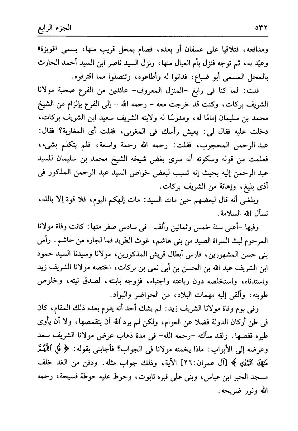 ومدافعه فتلاقيا على عسفان أَو بعده فصَام بِمحل قريب مِنْهَا يُسمى قويزة وَعِيد بِهِ ثمَّ توجه فَنزل بِأم الْعِيَال مِنْهَا وَنزل السَّيِّد نَاصِر ابْن السَّيِّد أَحْمد الْحَارِث بِالْمحل الْمُسَمّى أَبُو ضباع فدانوا لَهُ وأطاعوه وتنصلوا مِمَّا اقترفوه قلت لما كُنَّا فِي رابغ الْمنزل الْمَعْرُوف عائدين من الْفَرْع صُحْبَة مَوْلَانَا الشريف بَرَكَات وَكنت قد خرجت مَعَه رَحمَه الله إِلَى الْفَرْع بإلزام من الشَّيْخ مُحَمَّد بن سُلَيْمَان إِمَامًا لَهُ ومدرساً لَهُ ولابنه الشريف سعيد ابْن الشريف بَرَكَات دخلت عَلَيْهِ فَقَالَ لي يعِيش رَأسك فِي المغربي فَقلت أَي المغاربة فَقَالَ عبد الرَّحْمَن المحجوب فَقلت رَحمَه الله رَحْمَة وَاسِعَة فَلم يتَكَلَّم بشئ فَعلمت من قَوْله وسكوته أَنه سرى بغض شَيْخه الشَّيْخ مُحَمَّد بن سُلَيْمَان للسَّيِّد عبد الرَّحْمَن إِلَيْهِ بِحَيْثُ إِنَّه تسبب لبَعض خَواص السَّيِّد عبد الرَّحْمَن الْمَذْكُور فِي أَذَى بليغ وإهانة من الشريف بَرَكَات وَبَلغنِي أَنه قَالَ لبَعْضهِم حِين مَاتَ السَّيِّد مَاتَ إِلَهكُم الْيَوْم فَلَا قُوَّة إِلَّا بِاللَّه نسْأَل الله السَّلامَة وفيهَا أَعنِي سنة خمس وَثَمَانِينَ وَألف فِي سادس صفر مِنْهَا كَانَت وَفَاة مَوْلَانَا المرحوم لَيْث السراة الصَّيْد من بنى هِشَام غوث الطريد فَمَا لجاره من حاشم رَأس بني حسن الْمَشْهُورين فَارس أبطال قُرَيْش الْمَذْكُورين مَوْلَانَا وَسَيِّدنَا السَّيِّد حمود ابْن الشريف عبد الله بن الْحسن بن أبي نمي بن بَرَكَات اختصه مَوْلَانَا الشريف زيد واستدناه واستخلصه دون رباعته واجتباه فَزَوجهُ بابنته لصدق نِيَّته وخلوص طويته وَألقى إِلَيْهِ مهمات الْبِلَاد من الحواضر والبواد وَفِي يَوْم وَفَاة مَوْلَانَا الشريف زيد لم يشك أحد أَنه يقوم بعده ذَلِك الْمقَام كَانَ فِي ظن أَرْكَان الدولة فضلا عَن الْعَوام وَلَكِن لم يرد الله أَن يتقمصها وَلَا أَن يأوي طيره قفصها وَلَقَد سَأَلته رَحمَه الله فِي مُدَّة ذهَاب عرض مَوْلَانَا الشريف سعد وَعرضه إِلَى الْأَبْوَاب مَاذَا يخمنه مَوْلَانَا فِي الْجَواب فَأَجَابَنِي بقوله {قل اللَّهُمَّ ملك اَلمُلكِ} آل عمرَان 26 الْآيَة وَذَلِكَ جَوَاب مثله وَدفن من الْغَد خلف مَسْجِد الحبر ابْن عَبَّاس وَبني على قَبره تَابُوت وحوط عَلَيْهِ حوطة فسيحة رَحمَه الله وَنور ضريحه