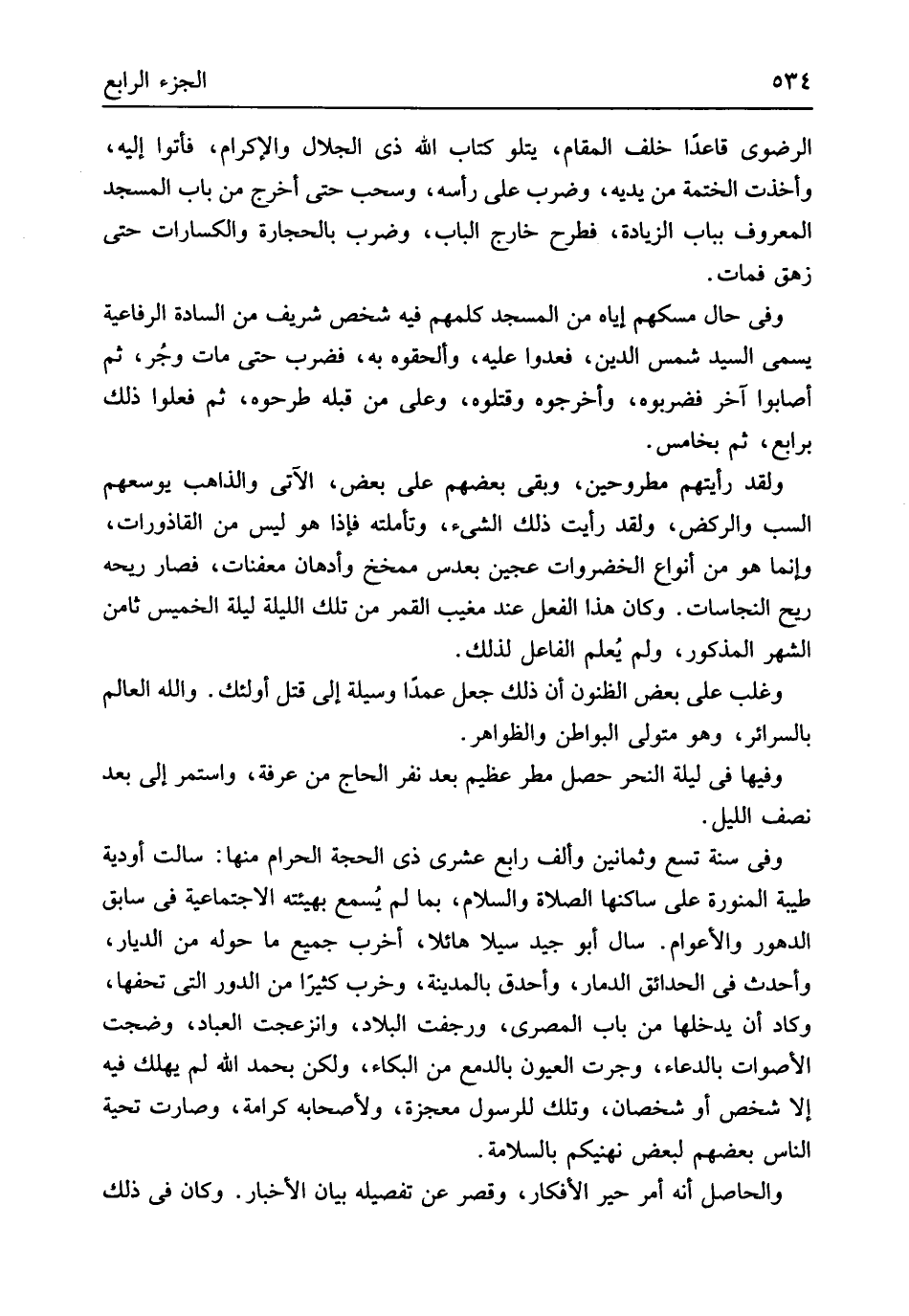 الرضوي قَاعِدا خلف الْمقَام يَتْلُو كتاب الله ذى الْجلَال وَالْإِكْرَام فَأتوا إِلَيْهِ وَأخذت الختمة من يَدَيْهِ وَضرب على رَأسه وسحب حَتَّى أخرج من بَاب الْمَسْجِد الْمَعْرُوف بِبَاب الزِّيَادَة فَطرح خَارج الْبَاب وَضرب بِالْحِجَارَةِ والكسارات حَتَّى زهق فَمَاتَ وَفِي حَال مسكهم إِيَّاه من الْمَسْجِد كَلمهمْ فِيهِ شخص شرِيف من السَّادة الرفاعية يُسمى السَّيِّد شمس الدّين فعدوا عَلَيْهِ وألحقوه بِهِ فَضرب حَتَّى مإت وجُر ثمَّ أَصَابُوا آخر فضربوه وأخرجوه وقتلوه وعَلى من قبله طرحوه ثمَّ فعلوا ذَلِك برابع ثمَّ بخامس وَلَقَد رَأَيْتهمْ مطروحين وبقى بَعضهم على بعض الْآتِي والذاهب يوسعهم السب والركض وَلَقَد رَأَيْت ذَلِك الشئ وتأملته فَإِذا هُوَ لَيْسَ من القاذورات وَإِنَّمَا هُوَ من أَنْوَاع الخضروات عجين بعدس ممخخ وأدهان معفنات فَصَارَ رِيحه ريح النَّجَاسَات وَكَانَ هَذَا الْفِعْل عِنْد مغيب الْقَمَر من تِلْكَ اللَّيْلَة لَيْلَة الْخَمِيس ثامن الشَّهْر الْمَذْكُور وَلم يُعلم الْفَاعِل لذَلِك وَغلب عَليّ بعض الظنون أَن ذَلِك جعل عمدا وَسِيلَة إِلَى قتل أُولَئِكَ وَالله الْعَالم بالسرائر وَهُوَ مُتَوَلِّي البواطن والظواهر وفيهَا فِي لَيْلَة النَّحْر حصل مطر عَظِيم بعد نفر الْحَاج من عَرَفَة وَاسْتمرّ إِلَى بعد نصف اللَّيْل وَفِي سنة تسع وَثَمَانِينَ وَألف رَابِع عشري ذِي الْحجَّة الْحَرَام مِنْهَا سَالَتْ أَوديَة طيبَة المنورة على ساكنها الصَّلَاة وَالسَّلَام بِمَا لم يسمع بهيئته الاجتماعية فِي سَابق الدهور والأعوام سَالَ أَبُو جيد سيلاً هائلاً أخرب جَمِيع مَا حوله من الديار وأحدث فِي الحدائق الدمار وأحدق بِالْمَدِينَةِ وَخرب كثيرا من الدّور الَّتِي تحفها وَكَاد أَن يدخلهَا من بَاب الْمصْرِيّ ورجفت الْبِلَاد وانزعجت الْعباد وضجت الْأَصْوَات بِالدُّعَاءِ وَجَرت الْعُيُون بالدمع من الْبكاء وَلَكِن بِحَمْد الله لم يهْلك فِيهِ إِلَّا شخص أَو شخصان وَتلك معْجزَة للرسول معْجزَة ولأصحابه كَرَامَة وَصَارَت تَحِيَّة النَّاس بَعضهم لبَعض نهنيكم بالسلامة وَالْحَاصِل أَنه أَمر حير الأفكار وَقصر عَن تَفْصِيله بَيَان الْأَخْبَار وَكَانَ فِي ذَلِك