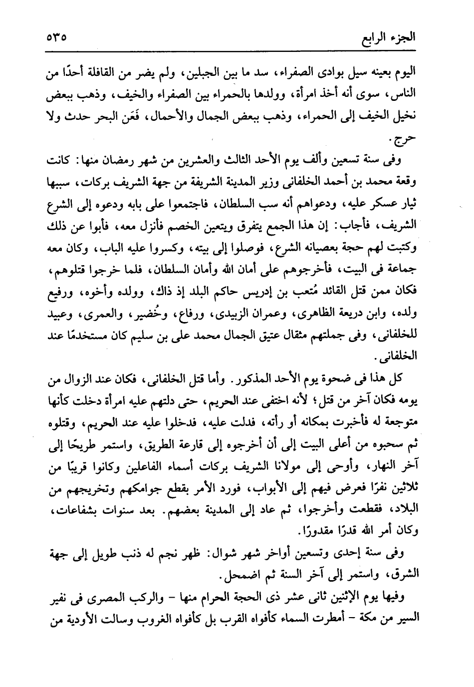 الْيَوْم بِعَيْنِه سيل بوادي الصَّفْرَاء سد مَا بَين الجبلين وَلم يضر من الْقَافِلَة أحدا من النَّاس سوى أَنه أَخذ امْرَأَة وَوَلدهَا بالحمراء بَين الصَّفْرَاء والخيف وَذهب بِبَعْض نخيل الْخيف إِلَى الْحَمْرَاء وَذهب بِبَعْض الْجمال والأحمال فَعَن الْبَحْر حدث وَلَا حرج وَفِي سنة تسعين وَألف يَوْم الْأَحَد الثَّالِث وَالْعِشْرين من شهر رَمَضَان مِنْهَا كَانَت وقْعَة مُحَمَّد بن أَحْمد الخلفاني وَزِير الْمَدِينَة الشَّرِيفَة من جِهَة الشريف بَرَكَات سَببهَا ثيار عَسْكَر عَلَيْهِ ودعواهم أَنه سبّ السُّلْطَان فَاجْتمعُوا على بَابه وَدعوهُ إِلَى الشَّرْع الشريف فَأجَاب إِن هَذَا الْجمع يتفرق وَيتَعَيَّن الْخصم فَأنْزل مَعَه فَأَبَوا عَن ذَلِك وكتبت لَهُم حجَّة بعصيانه الشَّرْع فوصلوا إِلَى بَيته وكسروا عَلَيْهِ الْبَاب وَكَانَ مَعَه جمَاعَة فِي الْبَيْت فأخرجوهم على أَمَان الله وأمان السُّلْطَان فَلَمَّا خَرجُوا قتلوهم فَكَانَ مِمَّن قتل الْقَائِد مُتعب بن إِدْرِيس حَاكم الْبَلَد إِذْ ذَاك وَولده وَأَخُوهُ ورفيع وَلَده وَابْن دريعة الظَّاهِرِيّ وَعمْرَان الزبيدِيّ ورفاع وخُضير والعمري وَعبيد للخلفاني وَفِي جُمْلَتهمْ مِثْقَال عَتيق الْجمال مُحَمَّد عَليّ بن سليم كَانَ مستخدماً عِنْد الخلفانى كل هَذَا فى صحوة يَوْم الْأَحَد الْمَذْكُور وَأما قتل الخلفاني فَكَانَ عِنْد الزَّوَال من يَوْمه فَكَانَ آخر من قتل لِأَنَّهُ اختفى عِنْد الْحَرِيم حَتَّى دلتهم عَلَيْهِ امْرَأَة دخلت كَأَنَّهَا متوجعة لَهُ فَأخْبرت بمكانه أَو رَأَتْهُ فدلت عَلَيْهِ فَدَخَلُوا عَلَيْهِ عِنْد الْحَرِيم وقتلوه ثمَّ سحبوه من أَعلَى الْبَيْت إِلَى أَن أَخْرجُوهُ إِلَى قَارِعَة الطَّرِيق وَاسْتمرّ طريحاً إِلَى آخر النَّهَار وَأوحى إِلَى مَوْلَانَا الشريف بَرَكَات أَسمَاء الفاعلين وَكَانُوا قَرِيبا من ثَلَاثِينَ نَفرا فَعرض فيهم إِلَى الْأَبْوَاب فورد الْأَمر بِقطع جوامكهم وتخريجهم من الْبِلَاد فَقطعت وأخرجوا ثمَّ عَاد إِلَى الْمَدِينَة بَعضهم بعد سنوات بشفاعات وَكَانَ أَمر الله قدرا مَقْدُورًا وَفِي سنة إِحْدَى وَتِسْعين أَوَاخِر شهر شَوَّال ظهر نجم لَهُ ذَنْب طَوِيل إِلَى جِهَة الشرق وَاسْتمرّ إِلَى آخر السّنة ثمَّ اضمحل وفيهَا يَوْم الْإِثْنَيْنِ ثَانِي عشر ذِي الْحجَّة الْحَرَام مِنْهَا والركب الْمصْرِيّ فِي نفير السّير من مَكَّة أمْطرت السَّمَاء كأفواه الْقرب بل كأفواه الْغُرُوب وسالت الأودية من