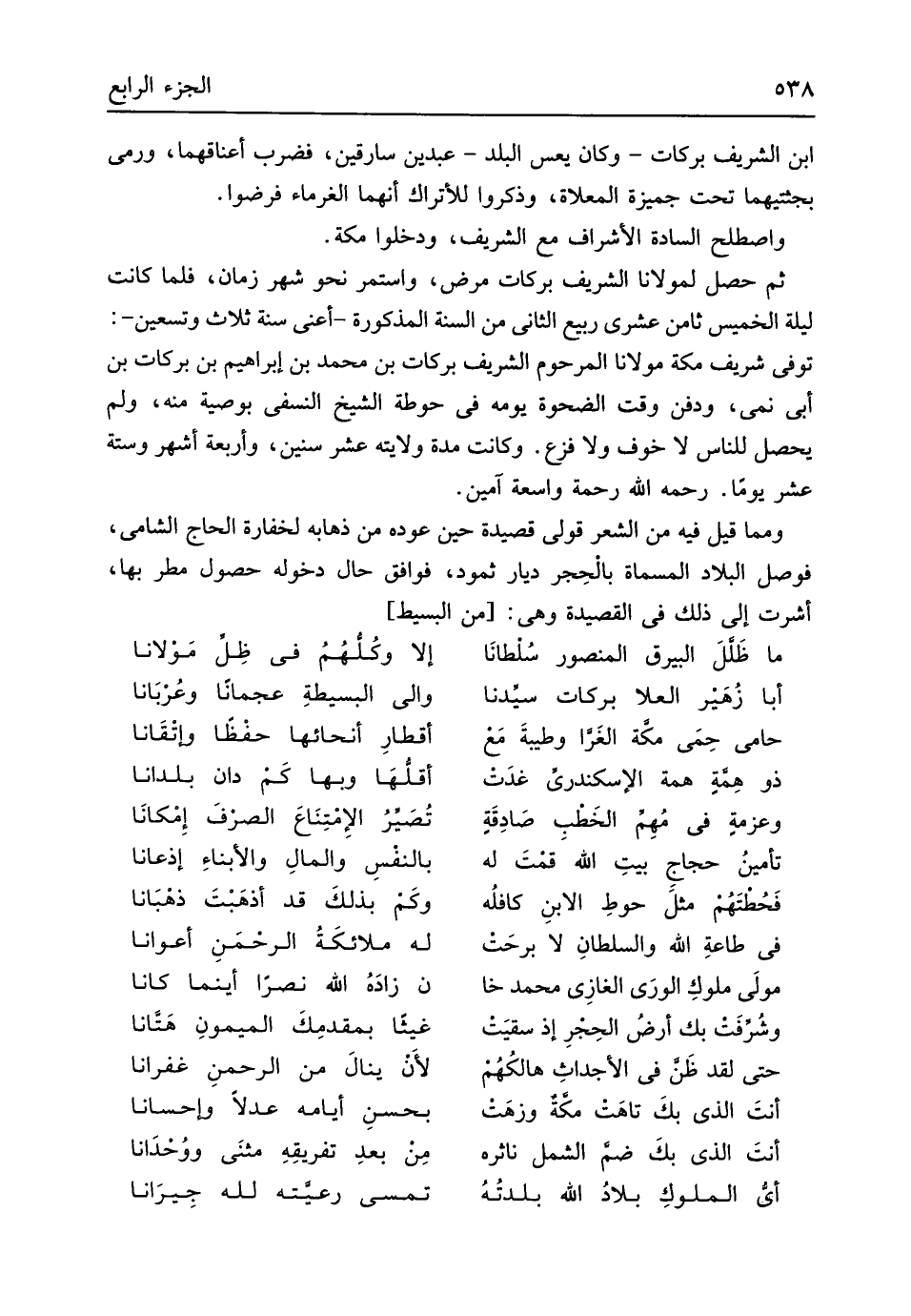 ابْن الشريف بَرَكَات وَكَانَ يعس الْبَلَد عَبْدَيْنِ سارقين فَضرب أعناقهما وَرمى بجثتيهما تَحت جميزة المعلاة وَذكروا للأتراك أَنَّهُمَا الْغُرَمَاء فرضوا واصطلح السَّادة الْأَشْرَاف مَعَ الشريف ودخلوا مَكَّة ثمَّ حصل لمولانا الشريف بَرَكَات مرض وَاسْتمرّ نَحْو شهر زمَان فَلَمَّا كَانَت لَيْلَة الْخَمِيس ثامن عشري ربيع الثَّانِي من السّنة الْمَذْكُورَة أَعنِي سنة ثَلَاث وَتِسْعين توفّي شرِيف مَكَّة مَوْلَانَا المرحوم الشريف بَرَكَات بن مُحَمَّد بن إِبْرَاهِيم بن بَرَكَات بن أبي نمي وَدفن وَقت الضحوة يَوْمه فِي حوطة الشَّيْخ النَّسَفِيّ بِوَصِيَّة مِنْهُ وَلم يحصل للنَّاس لَا خوف وَلَا فزع وَكَانَت مُدَّة ولَايَته عشر سِنِين وَأَرْبَعَة أشهر وَسِتَّة عشر يَوْمًا رَحمَه الله رَحْمَة وَاسِعَة آمين وَمِمَّا قيل فِيهِ من الشّعْر قولي قصيدة حِين عوده من ذَهَابه لخفارة الْحَاج الشَّامي فوصل الْبِلَاد الْمُسَمَّاة بالحِجر ديار ثَمُود فَوَافَقَ حَال دُخُوله حُصُول مطر بهَا اشرت إِلَى ذَلِك فِي القصيدة وَهِي // (من الْبَسِيط) //