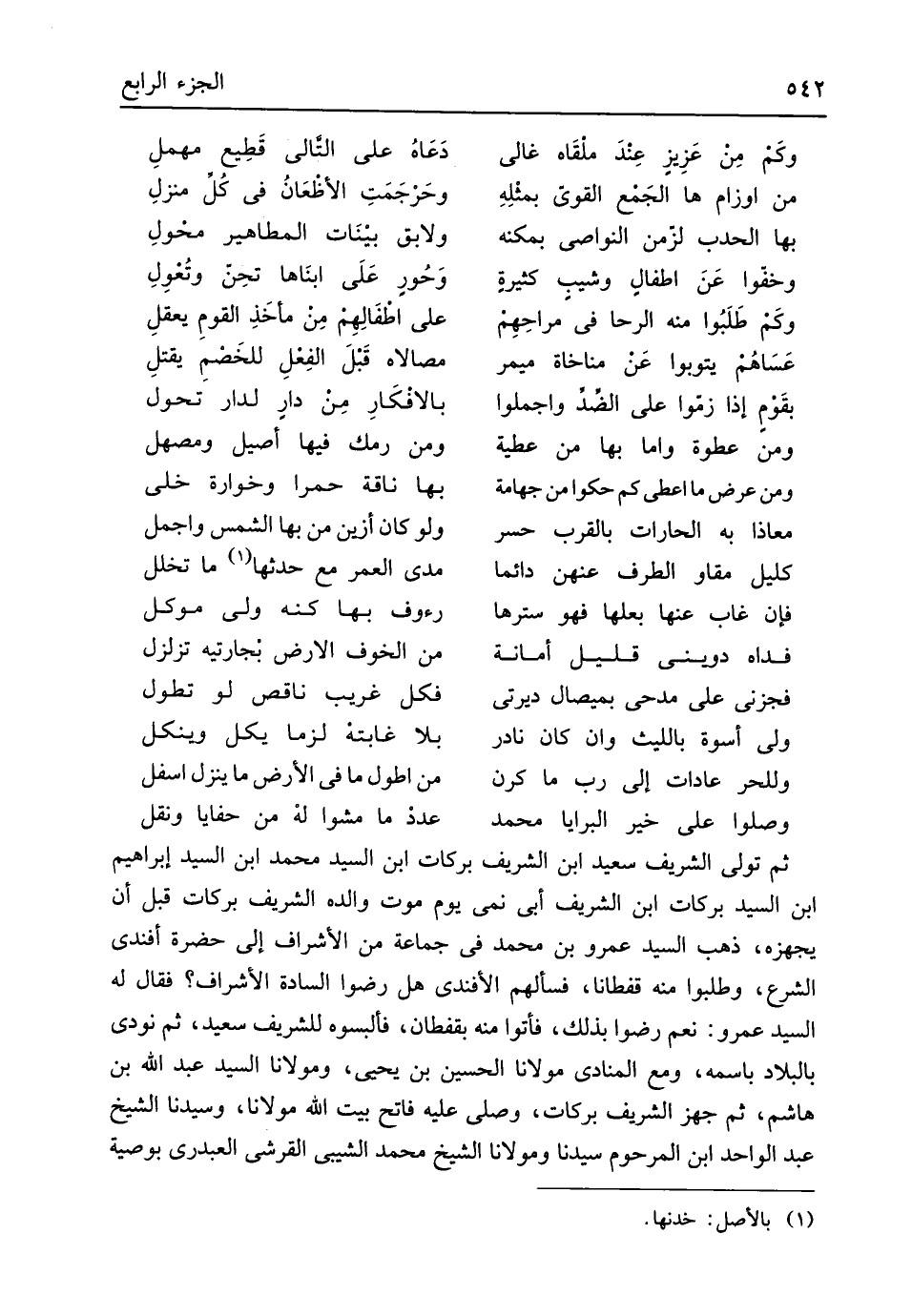 ثمَّ تولى الشريف سعيد ابْن الشريف بَرَكَات ابْن السَّيِّد مُحَمَّد ابْن السَّيِّد إِبْرَاهِيم ابْن السَّيِّد بَرَكَات ابْن الشريف أبي نمي يَوْم موت وَالِده الشريف بَرَكَات قبل أَن يجهزه ذهب السَّيِّد عَمْرو بن مُحَمَّد فِي جمَاعَة من الْأَشْرَاف إِلَى حَضْرَة أَفَنْدِي الشَّرْع وطلبوا مِنْهُ قفطاناً فَسَأَلَهُمْ الأفندي هَل رَضوا السَّادة الْأَشْرَاف فَقَالَ لَهُ السَّيِّد عَمْرو نعم رَضوا بذلك فَأتوا مِنْهُ بقفطان فألبسوه للشريف سعيد ثمَّ نودى بالبلاد باسمه وَمَعَ المنادى مَوْلَانَا الْحُسَيْن بن يحيى ومولانا السَّيِّد عبد الله بن هَاشم ثمَّ جهز الشريف بَرَكَات وَصلى عَلَيْهِ فاتح بَيت الله مَوْلَانَا وَسَيِّدنَا الشَّيْخ عبد الْوَاحِد ابْن المرحوم سيدنَا ومولانا الشَّيْخ مُحَمَّد الشيبي الْقرشِي العبدرى بِوَصِيَّة
