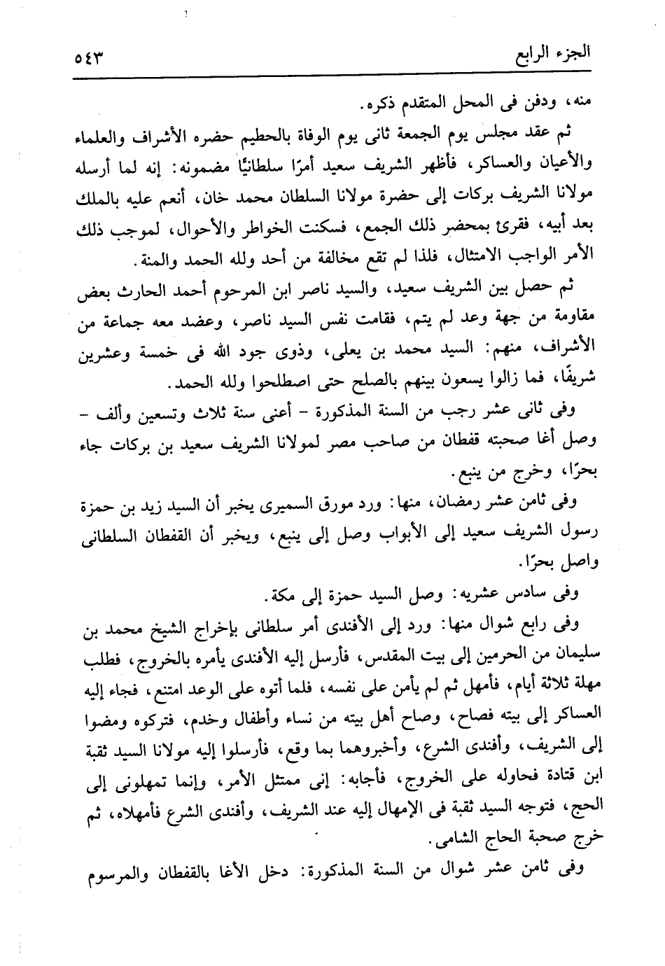مِنْهُ وَدفن فِي الْمحل الْمُتَقَدّم ذكره ثمَّ عقد مجْلِس يَوْم الْجُمُعَة ثَانِي يَوْم الْوَفَاة بِالْحَطِيمِ حَضَره الْأَشْرَاف وَالْعُلَمَاء والأعيان والعساكر فأظهر الشريف سعيد أمرا سلطانياً مضمونه إِنَّه لما أرْسلهُ مَوْلَانَا الشريف بَرَكَات إِلَى حَضْرَة مَوْلَانَا السُّلْطَان مُحَمَّد خَان أنعم عَلَيْهِ بِالْملكِ بعد أَبِيه فقرئ بِمحضر ذَلِك الْجمع فسكنت الخواطر وَالْأَحْوَال لموجب ذَلِك الْأَمر الْوَاجِب الِامْتِثَال فَلِذَا لم تقع مُخَالفَة من أحد وَللَّه الْحَمد والْمنَّة ثمَّ حصل بَين الشريف سعيد وَالسَّيِّد نَاصِر ابْن المرحوم أَحْمد الْحَارِث بعض مقاومة من جِهَة وعد لم يتم فَقَامَتْ نفس السَّيِّد نَاصِر وعضد مَعَه جمَاعَة من الْأَشْرَاف مِنْهُم السَّيِّد مُحَمَّد بن يعلى وَذَوي جود الله فِي خَمْسَة وَعشْرين شريفاً فَمَا زَالُوا يسعون بَينهم بِالصُّلْحِ حَتَّى اصْطَلحُوا وَللَّه الْحَمد وَفِي ثَانِي عشر رَجَب من السّنة الْمَذْكُورَة أَعنِي سنة ثَلَاث وَتِسْعين وَألف وصل أغا صحبته قفطان من صَاحب مصر لمولانا الشريف سعيد بن بَرَكَات جَاءَ بحراً وَخرج من يَنْبع وَفِي ثامن عشر رَمَضَان مِنْهَا ورد مُورق السميري يخبر أَن السَّيِّد زيد بن حَمْزَة رَسُول الشريف سعيد إِلَى الْأَبْوَاب وصل إِلَى يَنْبع ويخبر أَن القفطان السلطاني وَاصل بحراً وَفِي سادس عشريه وصل السَّيِّد حَمْزَة إِلَى مَكَّة وَفِي رَابِع شَوَّال مِنْهَا ورد إِلَى الأفندي أَمر سلطاني بِإِخْرَاج الشَّيْخ مُحَمَّد بن سُلَيْمَان من الْحَرَمَيْنِ إِلَى بَيت الْمُقَدّس فَأرْسل إِلَيْهِ الأفندي يَأْمُرهُ بِالْخرُوجِ فَطلب مهلة ثَلَاثَة أَيَّام فأمهل ثمَّ لم يَأْمَن على نَفسه فَلَمَّا أَتَوْهُ على الْوَعْد امْتنع فجَاء إِلَيْهِ العساكر إِلَى بَيته فصاح وَصَاح أهل بَيته من نسَاء وَأَطْفَال وخدم فَتَرَكُوهُ ومضوا إِلَى الشريف وأفندي الشَّرْع وأخبروهما بِمَا وَقع فأرسلوا إِلَيْهِ مَوْلَانَا السَّيِّد ثقبة ابْن قَتَادَة فحاوله على الْخُرُوج فَأَجَابَهُ إِنِّي ممتثل الْأَمر وَإِنَّمَا تمهلوني إِلَى الْحَج فَتوجه السَّيِّد ثقبة فِي الْإِمْهَال إِلَيْهِ عِنْد الشريف وأفندي الشَّرْع فأمهلاه ثمَّ خرج صُحْبَة الْحَاج الشَّامي وَفِي ثامن عشر شَوَّال من السّنة الْمَذْكُورَة دخل الأغا بالقفطان والمرسوم