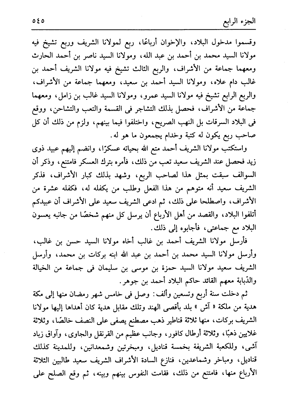 وقسموا مَدْخُول الْبِلَاد والإخوان أَربَاعًا ربع لمولانا الشريف وَربع تشيخ فِيهِ مَوْلَانَا السَّيِّد مُحَمَّد بن أَحْمد بن عبد الله ومولانا السَّيِّد نَاصِر بن أَحْمد الْحَارِث ومعهما جمَاعَة من الْأَشْرَاف وَالرّبع الثَّالِث تشيخ فِيهِ مَوْلَانَا الشريف أَحْمد بن غَالب دَامَ علاهُ ومولانا السَّيِّد أَحْمد بن سعيد ومعهما جمَاعَة من الْأَشْرَاف وَالرّبع الرَّابِع تشيخ فِيهِ مَوْلَانَا السَّيِّد عَمْرو ومولانا السَّيِّد غَالب بن زامل ومعهما جمَاعَة من الْأَشْرَاف فَحصل بذلك التشاجر فِي الْقِسْمَة والتعب والتشاحن وَوَقع فِي الْبِلَاد السرقات بل النهب الصَّرِيح وَاخْتلفُوا فِيمَا بَينهم وَلزِمَ من ذَلِك أَن كل صَاحب ربع يكون لَهُ كتبة وخدام يجمعُونَ مَا هُوَ لَهُ واستكتب مَوْلَانَا الشريف أَحْمد متع الله بحياته عسكراً وانضم إِلَيْهِم عبيد ذَوي زيد فَحصل عِنْد الشريف سعيد تَعب من ذَلِك فَأمره بترك الْعَسْكَر فَامْتنعَ وَذكر أَن السوالف سبقت بِمثل هَذَا لصَاحب الرّبع وَشهد بذلك كبار الْأَشْرَاف فَذكر الشريف سعيد أَنه متوهم من هَذَا الْفِعْل وَطلب من يكفله لَهُ فَكَفَلَهُ عشرَة من الْأَشْرَاف واصطلحا على ذَلِك ثمَّ ادّعى الشريف سعيد على الْأَشْرَاف أَن عبيدكم أتلفوا الْبِلَاد وَالْقَصْد من أهل الأرباع أَن يُرْسل كل مِنْهُم شخصا من جَانِبه يعسون الْبِلَاد مَعَ جماعتي فَأَجَابُوهُ إِلَى ذَلِك فَأرْسل مَوْلَانَا الشريف أَحْمد بن غَالب أَخَاهُ مَوْلَانَا السَّيِّد حسن بن غَالب وَأرْسل مَوْلَانَا السَّيِّد مُحَمَّد بن أَحْمد بن عبد الله ابْنه بَرَكَات بن مُحَمَّد وَأرْسل الشريف سعيد مَوْلَانَا السَّيِّد حَمْزَة بن مُوسَى بن سُلَيْمَان فِي جمَاعَة من الخيالة والدَّبابة مَعَهم الْقَائِد حَاكم الْبِلَاد أَحْمد بن جَوْهَر ثمَّ دخلت سنة أَربع وَتِسْعين وَألف وصل فِي خَامِس شهر رَمَضَان مِنْهَا إِلَى مَكَّة هَدِيَّة من ملكة آش بلد بأقصى الْهِنْد وَتلك مُقَابل هَدِيَّة كَانَ أهداها إِلَيْهَا مَوْلَانَا الشريف بَرَكَات مِنْهَا ثَلَاثَة قناطير ذهب مصطنع يصفى على النّصْف خَالِصا وَثَلَاثَة غلايين ذَهَبا وَثَلَاثَة أَرْطَال كافور وجانب عَظِيم من الفرنقل والجاوي وآواق زباد آشى وللكعبة الشَّرِيفَة بِخَمْسَة قناديل ومبخرتين وشمعدانين وللمدينة كَذَلِك قناديل ومباخر وشماعدين فنازع السَّادة الْأَشْرَاف الشريف سعيد طَالِبين الثَّلَاثَة الأرباع مِنْهَا فَامْتنعَ من ذَلِك فَقَامَتْ النُّفُوس بَينهم وَبَينه ثمَّ وَقع الصُّلْح على