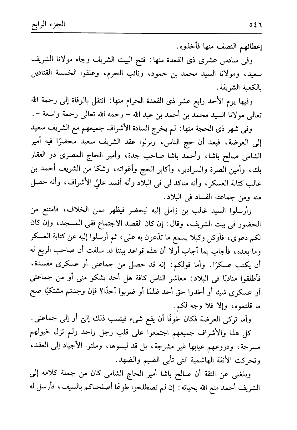إعطائهم النّصْف مِنْهَا فَأَخَذُوهُ وَفِي سادس عشري ذِي الْقعدَة مِنْهَا فتح الْبَيْت الشريف وَجَاء مَوْلَانَا الشريف سعيد ومولانا السَّيِّد مُحَمَّد بن حمود ونائب الْحرم وعلقوا الْخَمْسَة الْقَنَادِيل بِالْكَعْبَةِ الشَّرِيفَة وفيهَا يَوْم الْأَحَد رَابِع عشر ذِي الْقعدَة الْحَرَام مِنْهَا انْتقل بالوفاة إِلَى رَحمَه الله تَعَالَى مَوْلَانَا السَّيِّد مُحَمَّد بن أَحْمد بن عبد الله رَحمَه الله تَعَالَى رَحْمَة وَاسِعَة وَفِي شهر ذِي الْحجَّة مِنْهَا لم يخرج السَّادة الْأَشْرَاف جَمِيعهم مَعَ الشريف سعيد إِلَى العرضة فَبعد أَن حج النَّاس ونزلوا عقد الشريف سعيد محضراً فِيهِ أَمِير الشَّامي صَالح باشا وَأحمد باشا صَاحب جدة وأمير الْحَاج المصرى ذوالفقار بك وَأمين الصرة والسرادير وأكابر الْحَج وأغواته وشكا من الشريف أَحْمد بن غَالب كِتَابَة الْعَسْكَر وَأَنه مناكد لي فِي الْبِلَاد وَأَنه أفسد عَليّ الْأَشْرَاف وَأَنه حصل مِنْهُ وَمن جماعته الْفساد فِي الْبِلَاد وَأَرْسلُوا السَّيِّد غَالب بن زامل إِلَيْهِ ليحضر فَيظْهر مِمَّن الْخلاف فَامْتنعَ من الْحُضُور فِي بَيت الشريف وَقَالَ إِن كَانَ الْقَصْد الِاجْتِمَاع فَفِي الْمَسْجِد وَإِن كَانَ لكم دَعْوَى فأوكل وَكيلا يسمع مَا تدَّعون بِهِ عَليّ ثمَّ أرْسلُوا إِلَيْهِ عَن كِتَابَة الْعَسْكَر وَمَا بعده فَأجَاب بِمَا أجَاب أَولا أَن هَذِه قَوَاعِد بَيْننَا قد سلفت أَن صَاحب الرّبع لَهُ أَن يكْتب عسكراً وَأما قَوْلكُم إِنَّه قد حصل من جماعتي أَو عسكري مفْسدَة فأطلقوا منادياً فِي الْبِلَاد معاشر النَّاس كَافَّة هَل أحد يشكو مني أَو من جماعتي أَو عسكري شَيْئا أَو أخذُوا حق أحد ظلما أَو ضربوا أحدا فَإِن وجدْتُم مشتكياً صَحَّ مَا قلتموه وَإِلَّا فَلَا وَجه لكم وَأما تركي العرضة فَكَانَ خوفًا أَن يَقع شئ فينسب ذَلِك إليَّ أَو إِلَى جماعتي كل هَذَا والأشراف جَمِيعهم اجْتَمعُوا على قلب رجل وَاحِد وَلم تزل خيولهم مسرجة ودروعهم عيابها غير مشرجة بل قد لبسوها وملئوا الأجياد إِلَى العقد وتحركت الأنفة الهاشمية الَّتِي تأبى الضيم والضهد وَبَلغنِي عَن الثِّقَة أَن صَالح باشا أَمِير الْحَاج الشَّامي كَانَ من جملَة كَلَامه إِلَى الشريف أَحْمد متع الله بحياته إِن لم تصطلحوا طَوْعًا أصلحناكم بِالسَّيْفِ فَأرْسل لَهُ
