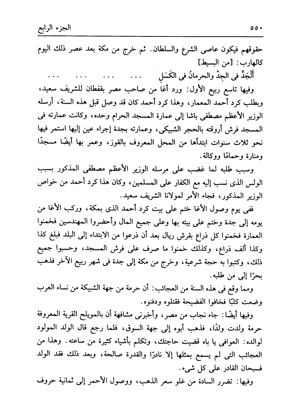وفيهَا تَاسِع ربيع الأول ورد أغا من صَاحب مصر بقفطان للشريف سعيد وبطلب كرد أَحْمد المعمار وَهَذَا كرد أَحْمد كَانَ قد وصل قبل هَذِه السّنة أرْسلهُ الْوَزير الْأَعْظَم مصطفى باشا إِلَى عمَارَة الْمَسْجِد الْحَرَام وَحده وَكَانَت عِمَارَته فِي الْمَسْجِد فرش أروقته بِالْحجرِ الشبيكي وعمارته بجدة إِجْرَاء عين إِلَيْهَا اسْتمرّ فِيهَا نَحْو ثَلَاث سنوات ابتدأها من الْمحل الْمَعْرُوف بالقوز وَعمر بهَا أَيْضا مَسْجِدا ومنارةً وحماماً ووكالةً وَسبب طلبه لما غضب على مرسله الْوَزير الْأَعْظَم مصطفى الْمَذْكُور بِسَبَب الولس الَّذِي نسب إِلَيْهِ مَعَ الْكفَّار على الْمُسلمين وَكَانَ هَذَا كرد أَحْمد من خَواص الْوَزير الْمَذْكُور فجَاء الْأَمر لمولانا الشريف سعيد ففى يَوْم وصل الأغا ختم على بَيت كرد أَحْمد الذى بِمَكَّة وَركب الأغا من يَوْمه إِلَى جدة وَختم على بَيته بهَا وعَلى جَمِيع المَال وأحضروا المهندسين فخمنوا الْعِمَارَة فخمنوا كل ذِرَاع بقرش ريال بعد أَن ذرعوا من الِابْتِدَاء إِلَى الْبَلَد فَبلغ كَذَا وَكَذَا ألف ذِرَاع وَكَذَلِكَ خمنوا مَا صرف على فرش الْمَسْجِد وَحَسبُوا جَمِيع ذَلِك وَكَتَبُوا بِهِ حجَّة شَرْعِيَّة وَخرج من مَكَّة إِلَى جدة فِي شهر ربيع الآخر فَذهب بحرا إِلَى من طلبه وَمِمَّا وَقع فِي هَذِه السّنة من الْعَجَائِب أَن حُرْمَة من جِهَة الشبيكه من نسَاء الْعَرَب وضعت كَلْبا فخافوا الفضيحة فَقَتَلُوهُ ودفنوه وفيهَا أَيْضا جَاءَ نجاب من مصر وَأَخْبرنِي مشافهة أَن بالمويلح الْقرْيَة الْمَعْرُوفَة حُرْمَة ولدت ولدا فَذهب أَبوهُ إِلَى جِهَة السُّوق فَلَمَّا رَجَعَ قَالَ الْوَلَد الْمَوْلُود لوالده العوافي يَا باه قضيت حَاجَتك وَتكلم بأَشْيَاء كَثِيرَة من سَاعَته وَهَذَا من الْعَجَائِب الَّتِي لم يسمع بِمِثْلِهَا إِلَّا نَادرا وَالْقُدْرَة صَالِحَة وَبعد ذَلِك فقد الْوَلَد فسبحان الْقَادِر على كل شئ وفيهَا تضرر السَّادة من غلو سعر الذَّهَب ووصول الْأَحْمَر إِلَى ثَمَانِيَة حُرُوف