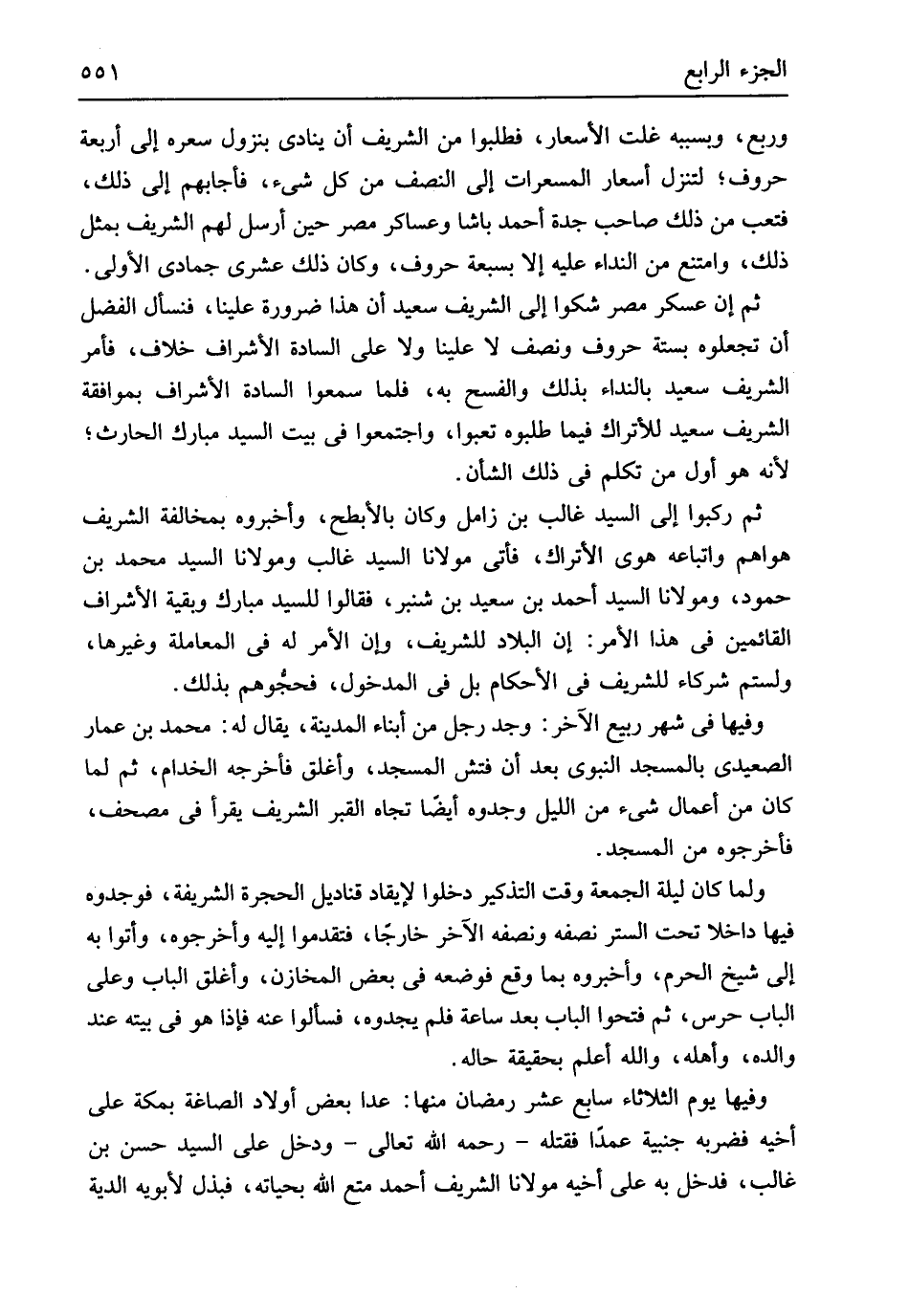 وَربع وبسببه غلت الأسعار فطلبوا من الشريف أَن يُنَادى بنزول سعره إِلَى أَرْبَعَة حُرُوف لتنزل أسعار المسعرات إِلَى النّصْف من كل شئ فأجابهم إِلَى ذَلِك فتعب من ذَلِك صَاحب جدة أَحْمد باشا وعساكر مصر حِين أرسل لَهُم الشريف بِمثل ذَلِك وَامْتنع من النداء عَلَيْهِ إِلَّا بسبعة حُرُوف وَكَانَ ذَلِك عشري جُمَادَى الأولى ثمَّ إِن عَسْكَر مصر شكوا إِلَى الشريف سعيد أَن هَذَا ضَرُورَة علينا فنسأل الْفضل أَن تجعلوه بِسِتَّة حُرُوف وَنصف لَا علينا وَلَا على السَّادة الْأَشْرَاف خلاف فَأمر الشريف سعيد بالنداء بذلك والفسح بِهِ فَلَمَّا سمعُوا السَّادة الْأَشْرَاف بموافقة الشريف سعيد للأتراك فِيمَا طلبوه تعبوا واجتمعوا فِي بَيت السَّيِّد مبارك الْحَارِث لِأَنَّهُ هُوَ أول من تكلم فِي ذَلِك الشَّأْن ثمَّ ركبُوا إِلَى السَّيِّد غَالب بن زامل وَكَانَ بِالْأَبْطح وَأَخْبرُوهُ بمخالفة الشريف هواهم واتباعه هوى الأتراك فَأتى مَوْلَانَا السَّيِّد غَالب ومولانا السَّيِّد مُحَمَّد بن حمود ومولانا السَّيِّد أَحْمد بن سعيد بن شنبر فَقَالُوا للسَّيِّد مبارك وَبَقِيَّة الْأَشْرَاف القائمين فِي هَذَا الْأَمر إِن الْبِلَاد للشريف وَإِن الْأَمر لَهُ فِي الْمُعَامَلَة وَغَيرهَا ولستم شُرَكَاء للشريف فِي الْأَحْكَام بل فِي الْمَدْخُول فحجوهم بذلك وفيهَا فِي شهر ربيع الآخر وجد رجل من أَبنَاء الْمَدِينَة يُقَال لَهُ مُحَمَّد بن عمار الصعيدي بِالْمَسْجِدِ النَّبَوِيّ بعد أَن فتش الْمَسْجِد وأغلق فَأخْرجهُ الخدام ثمَّ لما كَانَ من أَعمال شئ من اللَّيْل وجدوه أَيْضا تجاه الْقَبْر الشريف يقْرَأ فِي مصحف فأخرجوه من الْمَسْجِد وَلما كَانَ لَيْلَة الْجُمُعَة وَقت التَّذْكِير دخلُوا لإيقاد قناديل الْحُجْرَة الشَّرِيفَة فوجدوه فِيهَا دَاخِلا تَحت السّتْر نصفه وَنصفه الآخر خَارِجا فتقدموا إِلَيْهِ وأخرجوه وَأتوا بِهِ إِلَى شيخ الْحرم وَأَخْبرُوهُ بِمَا وَقع فَوَضعه فِي بعض المخازن وأغلق الْبَاب وعَلى الْبَاب حرس ثمَّ فتحُوا الْبَاب بعد سَاعَة فَلم يجدوه فسألوا عَنهُ فَإِذا هُوَ فِي بَيته عِنْد وَالِده وَأَهله وَالله أعلم بِحَقِيقَة حَاله وفيهَا يَوْم الثُّلَاثَاء سَابِع عشر رَمَضَان مِنْهَا عدا بعض أَوْلَاد الصاغة بِمَكَّة على أَخِيه فَضَربهُ جنبية عمدا فَقتله رَحمَه الله تَعَالَى وَدخل على السَّيِّد حسن بن غَالب فَدخل بِهِ على أَخِيه مَوْلَانَا الشريف أَحْمد متع الله بحياته فبذل لِأَبَوَيْهِ الدِّيَة