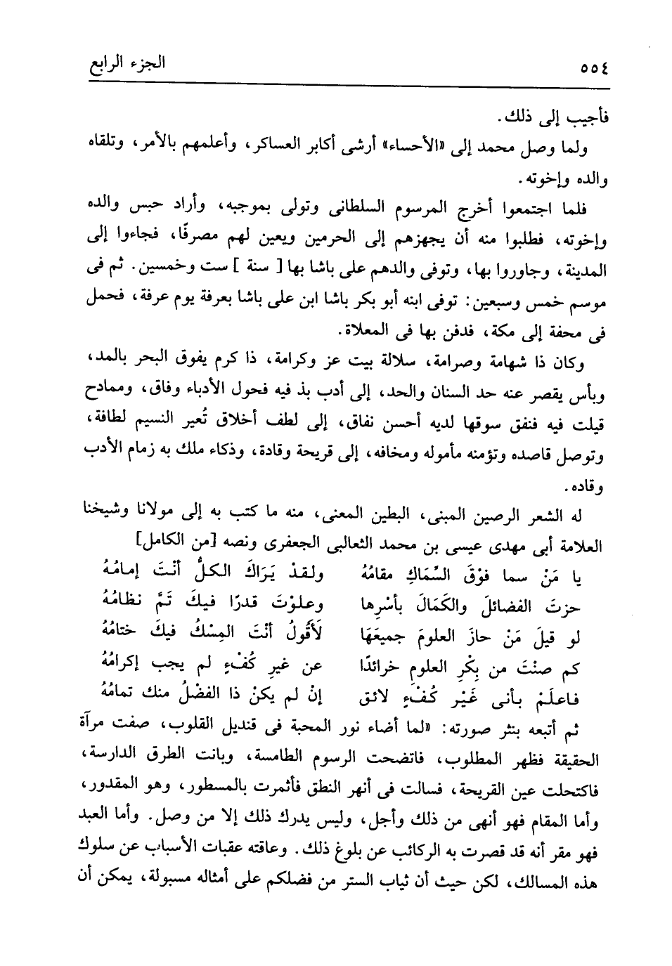فَأُجِيب إِلَى ذَلِك وَلما وصل مُحَمَّد إِلَى الأحساء أرشى أكَابِر العساكر وأعلمهم بِالْأَمر وتلقاه وَالِده وَإِخْوَته فَلَمَّا اجْتَمعُوا أخرج المرسوم السلطاني وَتَوَلَّى بِمُوجبِه وَأَرَادَ حبس وَالِده وَإِخْوَته فطلبوا مِنْهُ أَن يجهزهم إِلَى الْحَرَمَيْنِ ويعين لَهُم مصرفاً فَجَاءُوا إِلَى الْمَدِينَة وجاوروا بهَا وَتُوفِّي والدهم على باشا بهَا سنة سِتّ وَخمسين ثمَّ فِي موسم خمس وَسبعين توفّي ابْنه أَبُو بكر باشا ابْن على باشا بِعَرَفَة يَوْم عَرَفَة فَحمل فِي محفة إِلَى مَكَّة فَدفن بهَا فِي المعلاة وَكَانَ ذَا شهامة وصرامة سلالة بَيت عز وكرامة ذَا كرم يفوق الْبَحْر بِالْمدِّ وبأس يقصر عَنهُ حد السنان وَالْحَد إِلَى أدب بذ فِيهِ فحول الأدباء وفَاق وممادح قيلت فِيهِ فنفق سوقها لَدَيْهِ أحسن نفاق إِلَى لطف أَخْلَاق تُعير النسيم لطافة وتوصل قاصده وتؤمنه مأموله ومخافه إِلَى قريحة وقادة وذكاء ملك بِهِ زِمَام الْأَدَب وقاده لَهُ الشّعْر الرصين الْمَبْنِيّ البطين الْمَعْنى مِنْهُ مَا كتب بِهِ إِلَى مَوْلَانَا وَشَيخنَا الْعَلامَة أبي مهْدي عِيسَى بن مُحَمَّد الثعالبي الْجَعْفَرِي وَنَصه // (من الْكَامِل) //