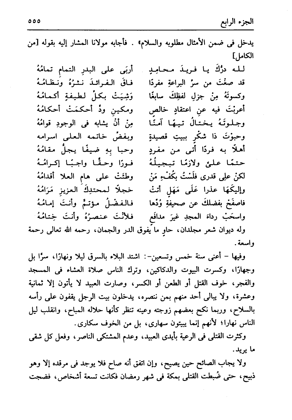 وَله ديوَان شعر مجلدان حاوٍ مَا يفوق الدّرّ والجمان رَحمَه الله تَعَالَى رَحْمَة وَاسِعَة وفيهَا أَعنِي سنة خمس وَتِسْعين اشْتَدَّ الْبلَاء بالسرق لَيْلًا وَنَهَارًا سرّاً بل وجهاراً وَكسرت الْبيُوت والدكاكين وَترك النَّاس صَلَاة الْعشَاء فِي الْمَسْجِد وَالْفَجْر خوف الْقَتْل أَو الطعْن أَو الْكسر وَصَارَت العبيد لَا يأْتونَ إِلَّا ثَمَانِيَة وَعشرَة وَلَا يُبَالِي أحد مِنْهُم بِمن ننصره يدْخلُونَ بَيت الرجل يقفون على رَأسه بِالسِّلَاحِ وَرُبمَا نكح بَعضهم زَوجته وعينه تنظر كَأَنَّهَا حَلَاله الْمُبَاح وانقلب ليل النَّاس نَهَارا لأَنهم إِنَّمَا يبيتُونَ سهارى بل من الْخَوْف سكارى وَكَثُرت الْقَتْلَى فِي الرّعية بأيدي العبيد وَعدم المشتكي النَّاصِر وَفعل كل شقي مَا يُرِيد وَلَا يُجَاب الصائح حِين يَصِيح وَإِن اتّفق أَنه صَاح فَلَا يُوجد فِي مرقده إِلَّا وَهُوَ ذبيح حَتَّى ضُبطت الْقَتْلَى بِمَكَّة فِي شهر رَمَضَان فَكَانَت تِسْعَة أشخاص فضجت