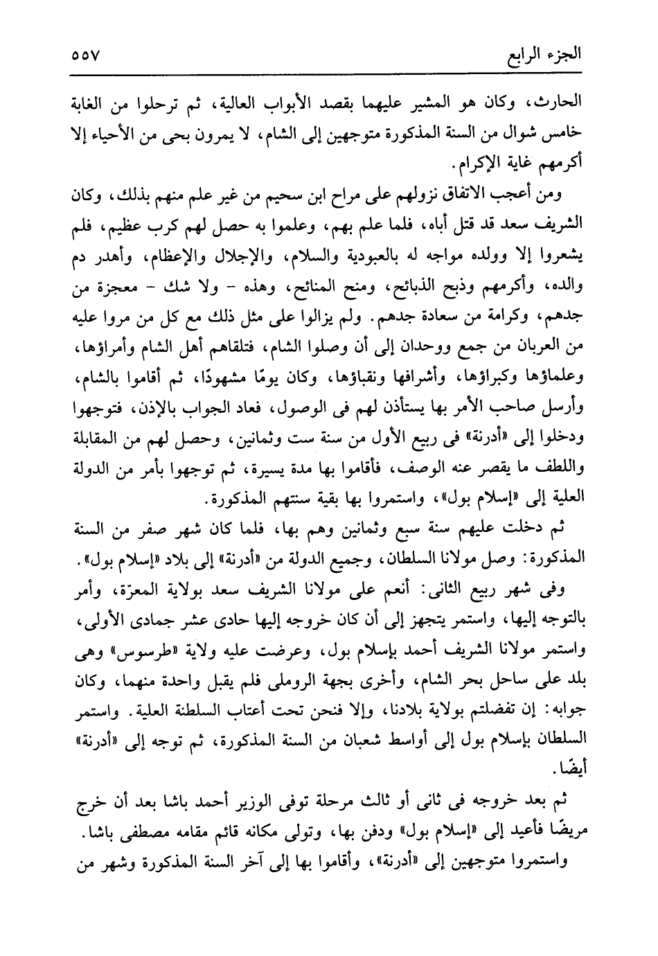 الْحَارِث وَكَانَ هُوَ المشير عَلَيْهِمَا بِقصد الْأَبْوَاب الْعَالِيَة ثمَّ ترحلوا من الغابة خَامِس شَوَّال من السّنة الْمَذْكُورَة متوجهين إِلَى الشَّام لَا يَمرونَ بحي من الْأَحْيَاء إِلَّا أكْرمهم غَايَة الْإِكْرَام وَمن أعجب الِاتِّفَاق نزولهم على مراح ابْن سحيم من غير علم مِنْهُم بذلك وَكَانَ الشريف سعد قد قتل أَبَاهُ فَلَمَّا علم بهم وَعَلمُوا بِهِ حصل لَهُم كرب عَظِيم فَلم يشعروا إِلَّا وَولده مواجه لَهُ بالعبودية وَالسَّلَام والإجلال والإعظام وأهدر دم وَالِده وَأكْرمهمْ وَذبح الذَّبَائِح ومنح المنائح وَهَذِه وَلَا شكّ معْجزَة من جدهم وكرامة من سَعَادَة جدهم وَلم يزَالُوا على مثل ذَلِك مَعَ كل من مروا عَلَيْهِ من العربان من جمع ووحدان إِلَى أَن وصلوا الشَّام فَتَلقاهُمْ أهل الشَّام وأمراؤها وعلماؤها وكبراؤها وأشرافها ونقباؤها وَكَانَ يَوْمًا مشهوداً ثمَّ أَقَامُوا بِالشَّام وَأرْسل صَاحب الْأَمر بهَا يسْتَأْذن لَهُم فِي الْوُصُول فَعَاد الْجَواب بِالْإِذْنِ فتوجهوا ودخلوا إِلَى أدرنة فِي ربيع الأول من سنة سِتّ وَثَمَانِينَ وَحصل لَهُم من الْمُقَابلَة واللطف مَا يقصر عَنهُ الْوَصْف فأقاموا بهَا مُدَّة يسيرَة ثمَّ توجهوا بِأَمْر من الدولة الْعلية إِلَى إِسْلَام بَوْل واستمروا بهَا بَقِيَّة سنتهمْ الْمَذْكُورَة ثمَّ دخلت عَلَيْهِم سنة سبع وَثَمَانِينَ وهم بهَا فَلَمَّا كَانَ شهر صفر من السّنة الْمَذْكُورَة وصل مَوْلَانَا السُّلْطَان وَجَمِيع الدولة من أدرنة إِلَى بِلَاد إِسْلَام بَوْل وَفِي شهر ربيع الثَّانِي أنعم على مَوْلَانَا الشريف سعد بِولَايَة المعرة وَأمر بالتوجه إِلَيْهَا وَاسْتمرّ يتجهز إِلَى أَن كَانَ خُرُوجه إِلَيْهَا حادي عشر جُمَادَى الأولى وَاسْتمرّ مَوْلَانَا الشريف أَحْمد بِإِسْلَام بَوْل وَعرضت عَلَيْهِ ولَايَة طرسوس وَهِي بلد على سَاحل بَحر الشَّام وَأُخْرَى بِجِهَة الروملي فَلم يقبل وَاحِدَة مِنْهُمَا وَكَانَ جَوَابه إِن تفضلتم بِولَايَة بِلَادنَا وَإِلَّا فَنحْن تَحت أعتاب السلطنة الْعلية وَاسْتمرّ السُّلْطَان بِإِسْلَام بَوْل إِلَى أواسط شعْبَان من السّنة الْمَذْكُورَة ثمَّ توجه إِلَى أدرنة أَيْضا ثمَّ بعد خُرُوجه فِي ثَانِي أَو ثَالِث مرحلة توفّي الْوَزير أَحْمد باشا بعد أَن خرج مَرِيضا فأعيد إِلَى إِسْلَام بَوْل وَدفن بهَا وَتَوَلَّى مَكَانَهُ قَائِم مقَامه مصطفى باشا واستمروا متوجهين إِلَى أدرنة وَأَقَامُوا بهَا إِلَى آخر السّنة الْمَذْكُورَة وَشهر من