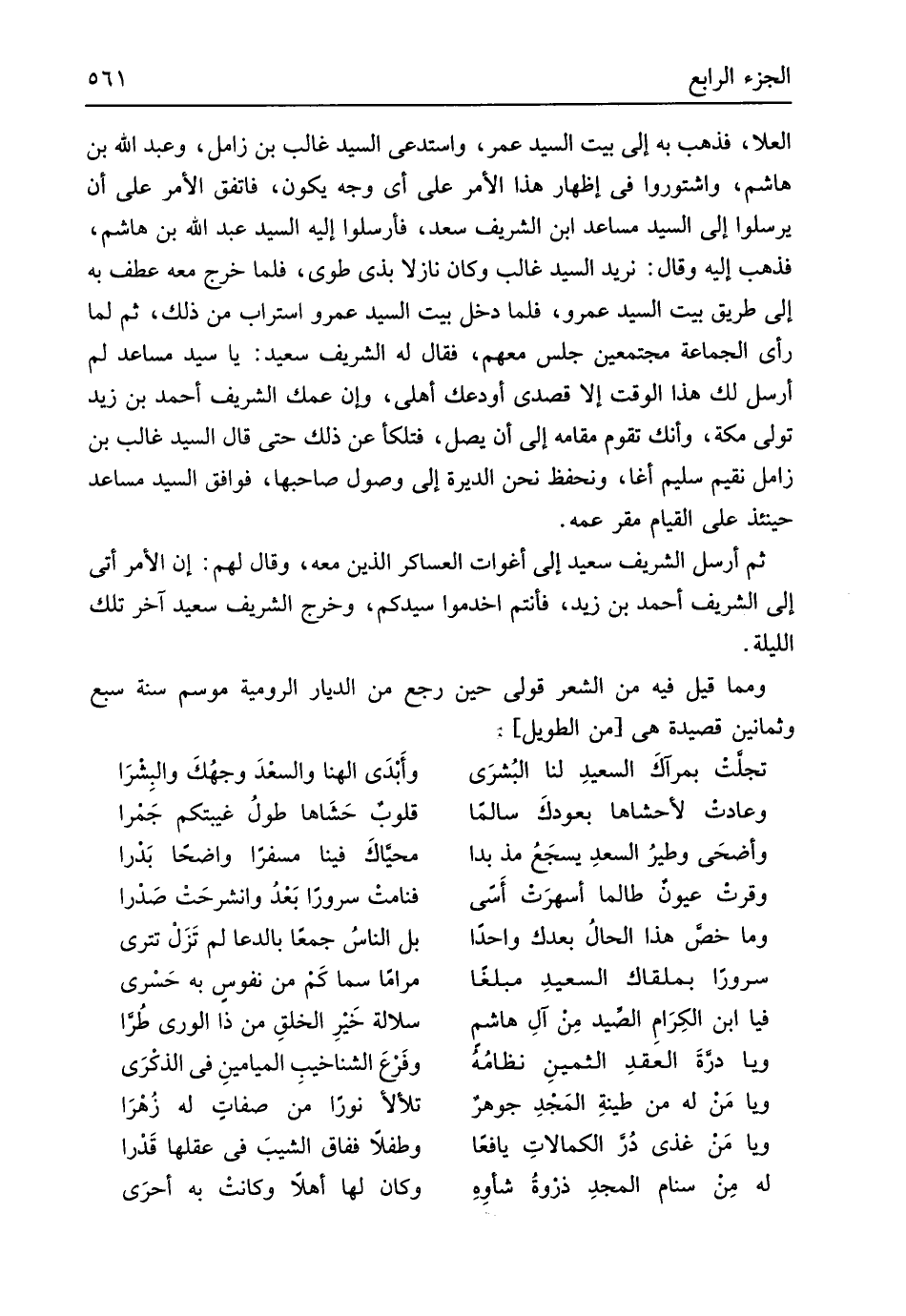 الْعلَا فَذهب بِهِ إِلَى بَيت السَّيِّد عمر واستدعي السَّيِّد غَالب بن زامل وَعبد الله بن هَاشم واشتوروا فِي إِظْهَار هَذَا الْأَمر على أَي وَجه يكون فاتفق الْأَمر على أَن يرسلوا إِلَى السَّيِّد مساعد ابْن الشريف سعد فأرسلوا إِلَيْهِ السَّيِّد عبد الله بن هَاشم فَذهب إِلَيْهِ وَقَالَ نُرِيد السَّيِّد غَالب وَكَانَ نازلاً بِذِي طوى فَلَمَّا خرج مَعَه عطف بِهِ إِلَى طَرِيق بَيت السَّيِّد عَمْرو فَلَمَّا دخل بَيت السَّيِّد عَمْرو استراب من ذَلِك ثمَّ لما رأى الْجَمَاعَة مُجْتَمعين جلس مَعَهم فَقَالَ لَهُ الشريف سعيد يَا سيد مساعد لم أرسل لَك هَذَا الْوَقْت إِلَّا قصدي أودعك أَهلِي وَإِن عمك الشريف أَحْمد بن زيد تولى مَكَّة وَأَنَّك تقوم مقَامه إِلَى أَن يصل فَتَلَكَّأَ عَن ذَلِك حَتَّى قَالَ السَّيِّد غَالب بن زامل نُقِيم سليم أغا ونحفظ نَحن الديرة إِلَى وُصُول صَاحبهَا فَوَافَقَ السَّيِّد مساعد حِينَئِذٍ على الْقيام مقرّ عَمه ثمَّ أرسل الشريف سعيد إِلَى أغوات العساكر الَّذين مَعَه وَقَالَ لَهُم إِن الْأَمر أَتَى إِلَى الشريف أَحْمد بن زيد فَأنْتم اخدموا سيدكم وَخرج الشريف سعيد آخر تِلْكَ اللَّيْلَة وَمِمَّا قيل فِيهِ من الشّعْر قولي حِين رَجَعَ من الديار الرومية موسم سنة سبع وَثَمَانِينَ قصيدة هِيَ // (من الطَّوِيل) //