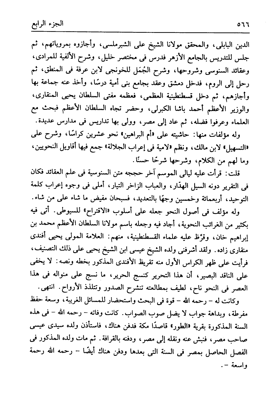 الدّين البابلى والمحقق مَوْلَانَا الشَّيْخ على الشبرملسى وأجازوه بمروياتهم ثمَّ جلس للتدريس بالجامع الْأَزْهَر فدرس فِي مُخْتَصر خَلِيل وَشرح الألفية للمرادي وعقائد السنوسي وشروحها وَشرح الجُمَل للخونجي لِابْنِ عَرَفَة فِي الْمنطق ثمَّ رَحل إِلَى الرّوم فَدخل دمشق وَعقد بِجَامِع بني أُميَّة درساً وَأخذ عَنهُ جمَاعَة بهَا وَأَجَازَهُمْ ثمَّ دخل قسطنطينية الْعُظْمَى فَعَظمهُ مفتي السُّلْطَان يحيى المنقاري والوزير الْأَعْظَم أَحْمد باشا الكبرلي وَحضر تجاه السُّلْطَان الْأَعْظَم فبحث مَعَ الْعلمَاء وَعرفُوا فَضله ثمَّ عَاد إِلَى مصر وَولي بهَا تداريس فِي مدارس عديدة وَله مؤلفات مِنْهَا حَاشِيَته على أم الْبَرَاهِين نَحْو عشْرين كراساً وَشرح على التسهيل لِابْنِ مَالك ونظم لامية فِي إِعْرَاب الْجَلالَة جمع فِيهَا أقاويل النَّحْوِيين وَمَا لَهُم من الْكَلَام وَشَرحهَا شرحاً حسنا قلت قَرَأت عَلَيْهِ ليَالِي الْمَوْسِم آخر حججه متن السنوسية فِي علم العقائد فَكَانَ فِي التَّقْرِير دونه السَّيْل الهدار والعباب الزاخر التيار أمْلى فِي وُجُوه إِعْرَاب كلمة التَّوْحِيد أَرْبَعمِائَة وَخمسين وَجها بالتعديد فسبحان مفيض مَا شَاءَ على من شَاءَ وَله مؤلف فِي أصُول النَّحْو جعله على أسلوب الاقتراح للسيوطي أَتَى فِيهِ بِكَثِير من الغرائب النحوية أَجَاد فِيهِ وَجعله باسم مَوْلَانَا السُّلْطَان الْأَعْظَم مُحَمَّد بن إِبْرَاهِيم خَان وقرَّظ عَلَيْهِ عُلَمَاء الْقُسْطَنْطِينِيَّة مِنْهُم الْعَلامَة الْمولى يحيى أَفَنْدِي منقاري زَاده وَلَقَد أشرفني وَلَده الشَّيْخ عِيسَى ابْن الشَّيْخ يحيى على ذَلِك التصنيف فَرَأَيْت على ظهر الكراس الأول مِنْهُ تقريظ الأفندي الْمَذْكُور بِخَطِّهِ وَنَصه لَا يخفى على النَّاقِد الْبَصِير أَن هَذَا التَّحْرِير كنسج الْحَرِير مَا نسج على منواله فِي هَذَا الْعَصْر فِي النَّحْو ناح لطيف بمطالعته تَنْشَرِح الصُّدُور وتتلذذ الْأَرْوَاح انْتهى وَكَانَت لَهُ رَحمَه الله قُوَّة فِي الْبَحْث واستحضار للمسائل الغريبة وسعة حفظ مفرطة وبداهة جَوَاب لَا يضل صوب الصَّوَاب كَانَت وَفَاته رَحمَه الله فِي هَذِه السّنة الْمَذْكُورَة بقرية الطّور قَاصِدا مَكَّة فَدفن هُنَاكَ فَاسْتَأْذن وَلَده سَيِّدي عِيسَى صَاحب مصر فنبش عَنهُ وَنَقله إِلَى مصر وَدَفنه بالقرافة ثمَّ مَاتَ وَلَده الْمَذْكُور فِي الْفَصْل الْحَاصِل بِمصْر فِي السّنة الَّتِي بعْدهَا وَدفن هُنَاكَ أَيْضا رَحمَه الله رَحْمَة وَاسِعَة