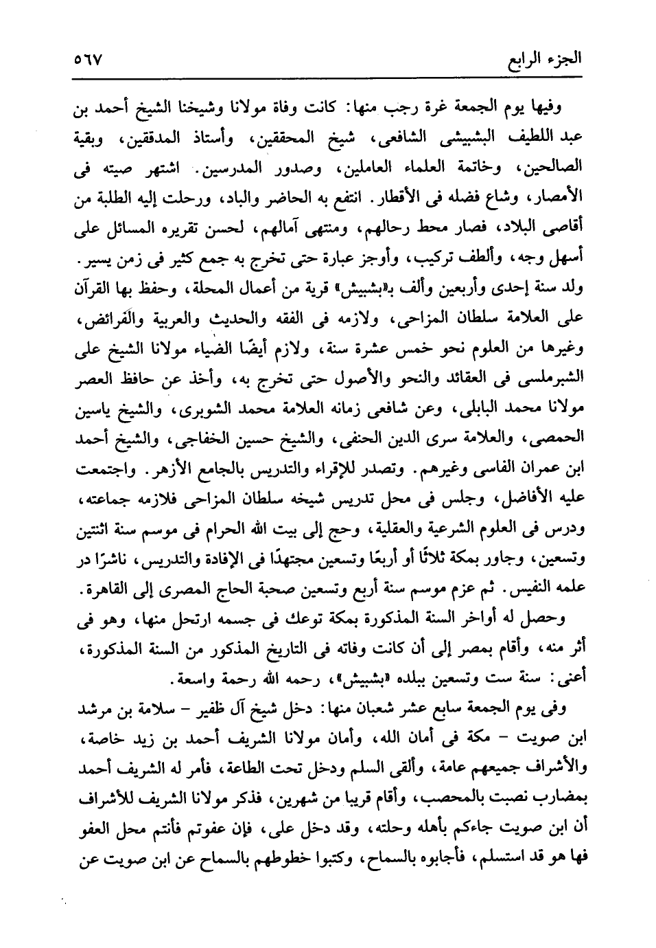 وفيهَا يَوْم الْجُمُعَة غرَّة رَجَب مِنْهَا كَانَت وَفَاة مَوْلَانَا وَشَيخنَا الشَّيْخ أَحْمد بن عبد اللَّطِيف البشبيشي الشَّافِعِي شيخ الْمُحَقِّقين وأستاذ المدققين وَبَقِيَّة الصَّالِحين وخاتمة الْعلمَاء العاملين وصدور المدرسين اشْتهر صيته فِي الْأَمْصَار وشاع فَضله فِي الأقطار انْتفع بِهِ الْحَاضِر والباد ورحلت إِلَيْهِ الطّلبَة من أقاصي الْبِلَاد فَصَارَ محط رحالهم ومنتهى آمالهم لحسن تَقْرِيره الْمسَائِل على أسهل وَجه وألطف تركيب وأوجز عبارَة حَتَّى تخرج بِهِ جمع كثير فِي زمن يسير ولد سنة إِحْدَى وَأَرْبَعين وَألف ب بشبيش قَرْيَة من أَعمال الْمحلة وَحفظ بهَا الْقُرْآن على الْعَلامَة سُلْطَان المزاحي ولازمه فِي الْفِقْه والْحَدِيث والعربية والفرائض وَغَيرهَا من الْعُلُوم نَحْو خمس عشرَة سنة ولازم أَيْضا الضياء مَوْلَانَا الشَّيْخ على الشبرملسي فِي العقائد والنحو وَالْأُصُول حَتَّى تخرج بِهِ وَأخذ عَن حَافظ الْعَصْر مَوْلَانَا مُحَمَّد البابلي وَعَن شَافِعِيّ زَمَانه الْعَلامَة مُحَمَّد الشَّوْبَرِيّ وَالشَّيْخ ياسين الْحِمصِي والعلامة سري الدّين الْحَنَفِيّ وَالشَّيْخ حُسَيْن الخفاجي وَالشَّيْخ أَحْمد ابْن عمرَان الفاسي وَغَيرهم وتصدر للإقراء والتدريس بالجامع الْأَزْهَر وَاجْتمعت عَلَيْهِ الأفاضل وَجلسَ فِي مَحل تدريس شَيْخه سُلْطَان المزاحي فلازمه جماعته ودرس فِي الْعُلُوم الشَّرْعِيَّة والعقلية وَحج إِلَى بَيت الله الْحَرَام فِي موسم سنة اثْنَتَيْنِ وَتِسْعين وجاور بِمَكَّة ثَلَاثًا أَو أَرْبعا وَتِسْعين مُجْتَهدا فِي الإفادة والتدريس ناشراً در علمه النفيس ثمَّ عزم موسم سنة أَربع وَتِسْعين صُحْبَة الْحَاج الْمصْرِيّ إِلَى الْقَاهِرَة وَحصل لَهُ أَوَاخِر السّنة الْمَذْكُورَة بِمَكَّة توعك فِي جِسْمه ارتحل مِنْهَا وَهُوَ فِي أثر مِنْهُ وَأقَام بِمصْر إِلَى أَن كَانَت وَفَاته فِي التَّارِيخ الْمَذْكُور من السّنة الْمَذْكُورَة أَعنِي سنة سِتّ وَتِسْعين بِبَلَدِهِ بشبيش رَحمَه الله رَحْمَة وَاسِعَة وَفِي يَوْم الْجُمُعَة سَابِع عشر شعْبَان مِنْهَا دخل شيخ آل ظفير سَلامَة بن مرشد ابْن صويت مَكَّة فِي أَمَان الله وأمان مَوْلَانَا الشريف أَحْمد بن زيد خَاصَّة والأشراف جَمِيعهم عَامَّة وَألقى السّلم وَدخل تَحت الطَّاعَة فَأمر لَهُ الشريف أَحْمد بمضارب نصبت بالمحصب وَأقَام قَرِيبا من شَهْرَيْن فَذكر مَوْلَانَا الشريف للأشراف أَن ابْن صويت جَاءَكُم بأَهْله وحلته وَقد دخل عَليّ فَإِن عفوتم فَأنْتم مَحل الْعَفو فها هُوَ قد استسلم فَأَجَابُوهُ بالسماح وَكَتَبُوا خطوطهم بالسماح عَن ابْن صويت عَن