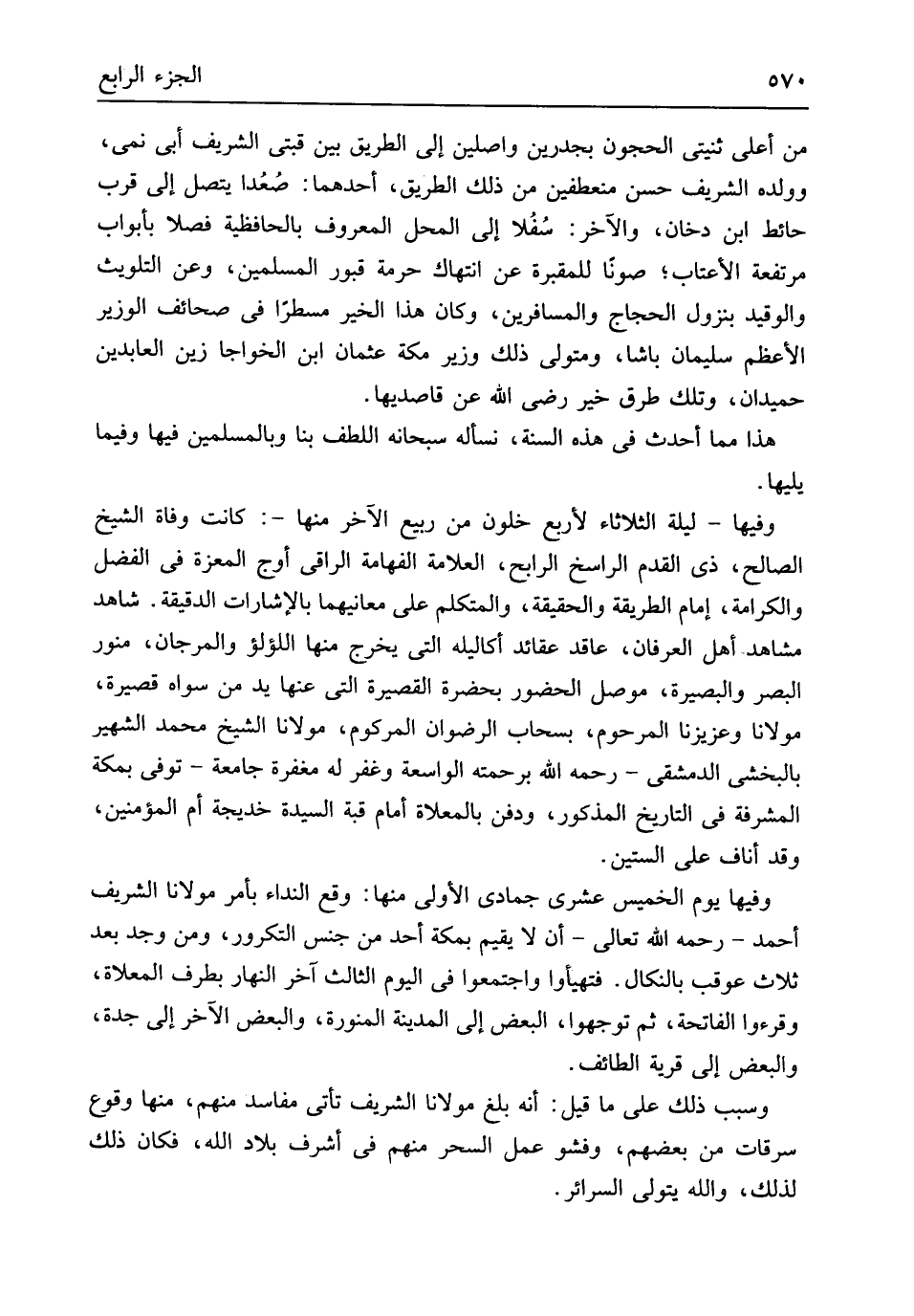 من أَعلَى ثنيتى الْحجُون يجدرين واصلين إِلَى الطَّرِيق بَين قبتي الشريف أبي نمي وَولده الشريف حسن منعطفين من ذَلِك الطَّرِيق أَحدهمَا صُعُدا يتَّصل إِلَى قرب حَائِط ابْن دُخان وَالْآخر سُفُلا إِلَى الْمحل الْمَعْرُوف بالحافظية فصلا بِأَبْوَاب مُرْتَفعَة الأعتاب صونا للمقبرة عَن انتهاك حُرْمَة قُبُور الْمُسلمين وَعَن التلويث والوقيد بنزول الْحجَّاج والمسافرين وَكَانَ هَذَا الْخَيْر مسطراً فِي صَحَائِف الْوَزير الْأَعْظَم سُلَيْمَان باشا ومتولي ذَلِك وَزِير مَكَّة عُثْمَان ابْن الخواجا زين العابدين حميدان وَتلك طرق خير رضى الله عَن قاصديها هَذَا مِمَّا أحدث فِي هَذِه السّنة نَسْأَلهُ سُبْحَانَهُ اللطف بِنَا وبالمسلمين فِيهَا وَفِيمَا يَليهَا وفيهَا لَيْلَة الثُّلَاثَاء لأَرْبَع خلون من ربيع الآخر مِنْهَا كَانَت وَفَاة الشَّيْخ الصَّالح ذِي الْقدَم الراسخ الرابح الْعَلامَة الفهامة الراقي أوج المعزة فِي الْفضل والكرامة إِمَام الطَّرِيقَة والحقيقة والمتكلم على معانيهما بالإشارات الدقيقة شَاهد مشَاهد أهل الْعرْفَان عَاقد عقائد أكاليله الَّتِي يخرج مِنْهَا اللُّؤْلُؤ والمرجان منور الْبَصَر والبصيرة موصل الْحُضُور بِحَضْرَة القصيرة الَّتِي عَنْهَا يَد من سواهُ قَصِيرَة مَوْلَانَا وعزيزنا المرحوم بسحاب الرضْوَان المركوم مَوْلَانَا الشَّيْخ مُحَمَّد الشهير بالبخشى الدِّمَشْقِي رَحمَه الله برحمته الواسعة وَغفر لَهُ مغْفرَة جَامِعَة توفّي بِمَكَّة المشرفة فِي التَّارِيخ الْمَذْكُور وَدفن بالمعلاة أَمَام قبَّة السيدة خَدِيجَة أم الْمُؤمنِينَ وَقد أناف على السِّتين وفيهَا يَوْم الْخَمِيس عشري جُمَادَى الأولى مِنْهَا وَقع النداء بِأَمْر مَوْلَانَا الشريف أَحْمد رَحمَه الله تَعَالَى أَن لَا يُقيم بِمَكَّة أحد من جنس التكرور وَمن وجد بعد ثَلَاث عُوقِبَ بالنكال فتهيأوا واجتمعوا فِي الْيَوْم الثَّالِث آخر النَّهَار بِطرف المعلاة وقرءوا الْفَاتِحَة ثمَّ توجهوا الْبَعْض إِلَى الْمَدِينَة المنورة وَالْبَعْض الآخر إِلَى جدة وَالْبَعْض إِلَى قَرْيَة الطَّائِف وَسبب ذَلِك على مَا قيل أَنه بلغ مَوْلَانَا الشريف تَأتي مفاسد مِنْهُم مِنْهَا وُقُوع سرقات من بَعضهم وفشو عمل السحر مِنْهُم فِي أشرف بِلَاد الله فَكَانَ ذَلِك لذَلِك وَالله يتَوَلَّى السرائر