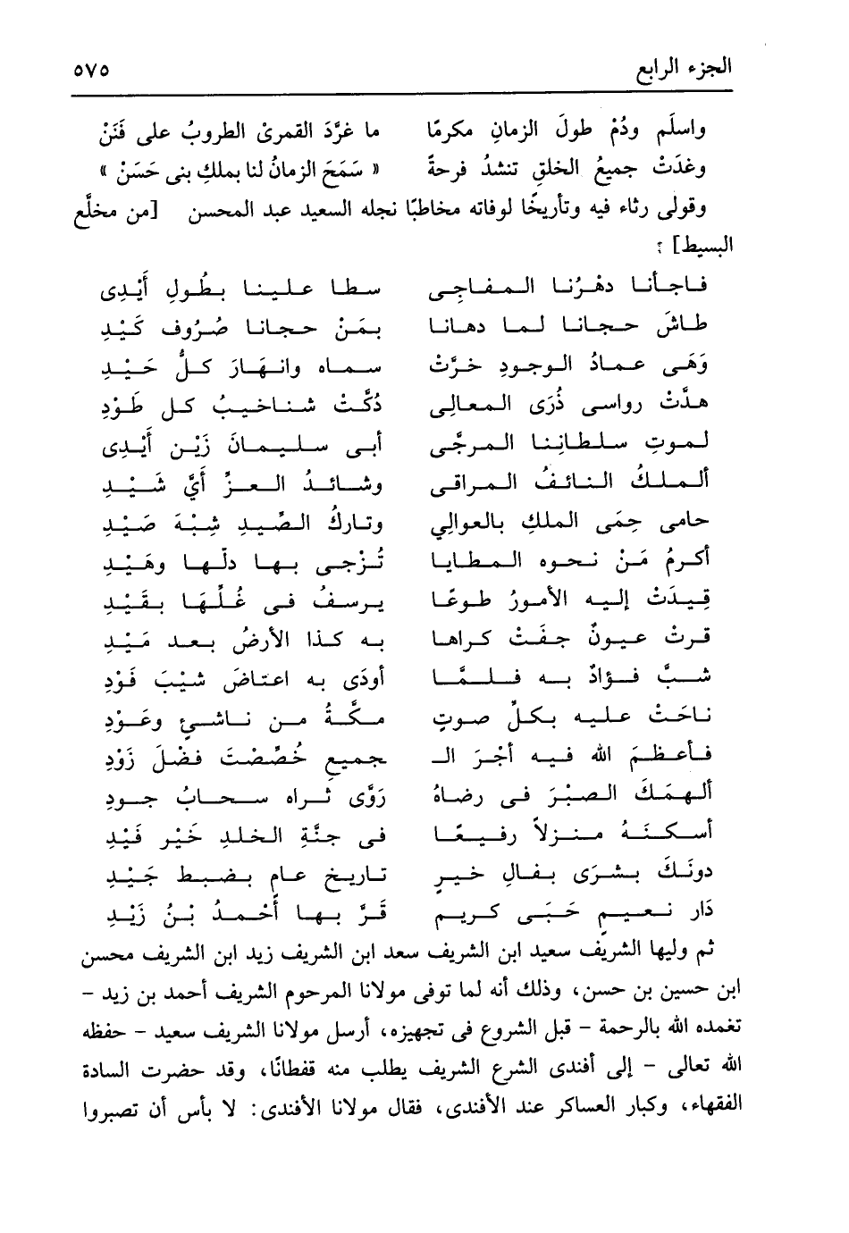 ثمَّ وَليهَا الشريف سعيد ابْن الشريف سعد ابْن الشريف زيد ابْن الشريف محسن ابْن حُسَيْن بن حسن وَذَلِكَ أَنه لما توفّي مَوْلَانَا المرحوم الشريف أَحْمد بن زيد تغمده الله بِالرَّحْمَةِ قبل الشُّرُوع فِي تَجْهِيزه أرسل مَوْلَانَا الشريف سعيد حفظه الله تَعَالَى إِلَى أَفَنْدِي الشَّرْع الشريف يطْلب مِنْهُ قفطاناً وَقد حضرت السَّادة الْفُقَهَاء وكبار العساكر عِنْد الأفندي فَقَالَ مَوْلَانَا الأفندي لَا بَأْس أَن تصبروا