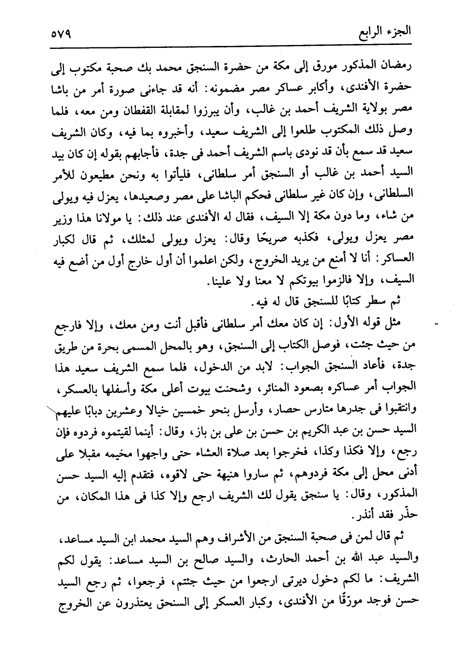 رَمَضَان الْمَذْكُور مُورق إِلَى مَكَّة من حَضْرَة السنجق مُحَمَّد بك صُحْبَة مَكْتُوب إِلَى حَضْرَة الأفندي وأكأبر عَسَاكِر مصر مضمونه أَنه قد جَاءَنِي صُورَة أَمر من باشا مصر بِولَايَة الشريف أَحْمد بن غَالب وَأَن يبرزوا لمقابلة القفطان وَمن مَعَه فَلَمَّا وصل ذَلِك الْمَكْتُوب طلعوا إِلَى الشريف سعيد وَأَخْبرُوهُ بِمَا فِيهِ وَكَانَ الشريف سعيد قد سمع بِأَن قد نُودي باسم الشريف أَحْمد فِي جدة فأجابهم بقوله إِن كَانَ بيد السَّيِّد أَحْمد بن غَالب أَو السنجق أَمر سلطاني فليأتوا بِهِ وَنحن مطيعون لِلْأَمْرِ السلطاني وَإِن كَانَ غير سلطاني فَحكم الباشا على مصر وصعيدها يعْزل فِيهِ ويولى من شَاءَ وَمَا دون مَكَّة إِلَّا السَّيْف فَقَالَ لَهُ الأفندي عِنْد ذَلِك يَا مَوْلَانَا هَذَا وَزِير مصر يعْزل ويولى فكذبه صَرِيحًا وَقَالَ يعْزل ويولى لمثلك ثمَّ قَالَ لكبار العساكر أَنا لَا أمنع من يُرِيد الْخُرُوج وَلَكِن اعلموا أَن أول خَارج أول من أَضَع فِيهِ السَّيْف وَإِلَّا فالزموا بُيُوتكُمْ لَا مَعنا وَلَا علينا ثمَّ سطر كتابا للسنجق قَالَ لَهُ فِيهِ مثل قَوْله الأول إِن كَانَ مَعَك أَمر سلطاني فَأقبل أَنْت وَمن مَعَك وَإِلَّا فَارْجِع من حَيْثُ جِئْت فوصل الْكتاب إِلَى السنجق وَهُوَ بِالْمحل الْمُسَمّى بحرة من طَرِيق جدة فَأَعَادَ السنجق الْجَواب لابد من الدُّخُول فَلَمَّا سمع الشريف سعيد هَذَا الْجَواب أَمر عساكره بصعود المنائر وشحنت بيُوت أَعلَى مَكَّة وأسفلها بالعسكر وانتقبوا فِي جدرها متارس حِصَار وَأرْسل بِنَحْوِ خمسين خيالاً وَعشْرين دباباً عَلَيْهِم السَّيِّد حسن بن عبد الْكَرِيم بن حسن بن عَليّ بن باز وَقَالَ أَيْنَمَا لقيتموه فَردُّوهُ فَإِن رَجَعَ وَإِلَّا فَكَذَا وَكَذَا فَخَرجُوا بعد صَلَاة الْعشَاء حَتَّى واجهوا مخيمه مُقبلا على أدنى مَحل إِلَى مَكَّة فردوهم ثمَّ سَارُوا هنيهة حَتَّى لاقوه فَتقدم إِلَيْهِ السَّيِّد حسن الْمَذْكُور وَقَالَ يَا سنجق يَقُول لَك الشريف ارْجع وَإِلَّا كَذَا فِي هَذَا الْمَكَان من حذر فقد أنذر ثمَّ قَالَ لمن فِي صُحْبَة السنجق من الْأَشْرَاف وهم السَّيِّد مُحَمَّد ابْن السَّيِّد مساعد وَالسَّيِّد عبد الله بن أَحْمد الْحَارِث وَالسَّيِّد صَالح بن السَّيِّد مساعد يَقُول لكم الشريف مَا لكم دُخُول ديرتي ارْجعُوا من حَيْثُ جئْتُمْ فَرَجَعُوا ثمَّ رَجَعَ السَّيِّد حسن فَوجدَ مورقا من الأفندى وكبار الْعَسْكَر إِلَى السنحق يَعْتَذِرُونَ عَن الْخُرُوج