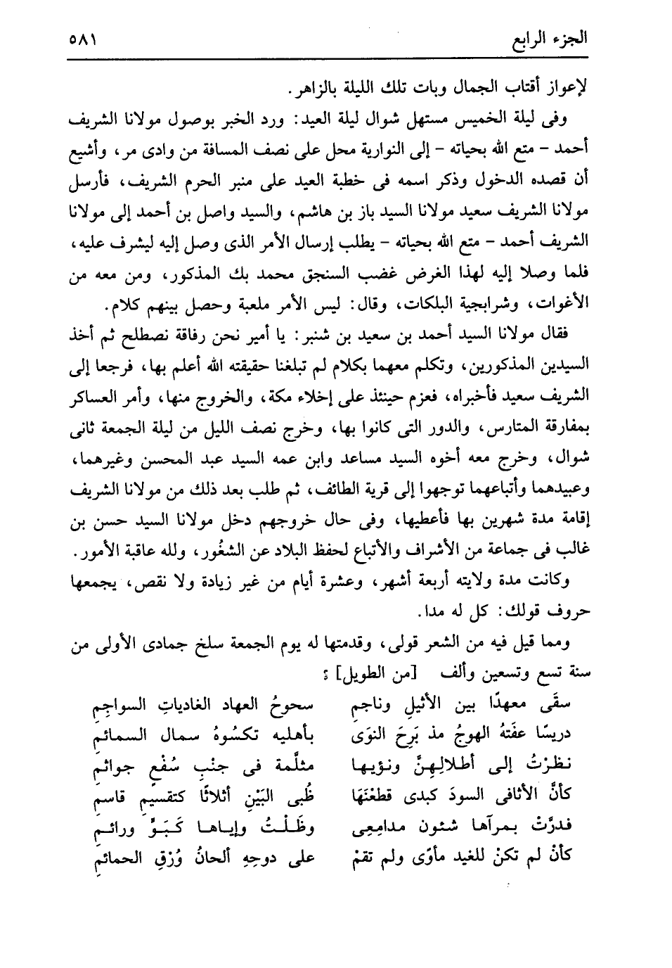 لإعواز أقتاب الْجمال وَبَات تِلْكَ اللَّيْلَة بالزاهر وَفِي لَيْلَة الْخَمِيس مستهل شَوَّال لَيْلَة الْعِيد ورد الْخَبَر بوصول مَوْلَانَا الشريف أَحْمد متع الله بحياته إِلَى النوارية مَحل على نصف الْمسَافَة من وَادي مر وَأشيع أَن قَصده الدُّخُول وَذكر اسْمه فِي خطْبَة الْعِيد على مِنْبَر الْحرم الشريف فَأرْسل مَوْلَانَا الشريف سعيد مَوْلَانَا السَّيِّد باز بن هَاشم وَالسَّيِّد وَاصل بن أَحْمد إِلَى مَوْلَانَا الشريف أَحْمد متع الله بحياته يطْلب إرْسَال الْأَمر الَّذِي وصل إِلَيْهِ ليشرف عَلَيْهِ فَلَمَّا وصلا إِلَيْهِ لهَذَا الْغَرَض غضب السنجق مُحَمَّد بك الْمَذْكُور وَمن مَعَه من الأغوات وشرابجية البلكات وَقَالَ لَيْسَ الْأَمر ملعبة وَحصل بَينهم كَلَام فَقَالَ مَوْلَانَا السَّيِّد أَحْمد بن سعيد بن شنبر يَا أَمِير نَحن رفاقة نصطلح ثمَّ أَخذ السيدين الْمَذْكُورين وَتكلم مَعَهُمَا بِكَلَام لم تبلغنَا حَقِيقَته الله أعلم بهَا فَرَجَعَا إِلَى الشريف سعيد فَأَخْبَرَاهُ فعزم حِينَئِذٍ على إخلاء مَكَّة وَالْخُرُوج مِنْهَا وَأمر العساكر بمفارقة المتارس والدور الَّتِي كَانُوا بهَا وَخرج نصف اللَّيْل من لَيْلَة الْجُمُعَة ثَانِي شَوَّال وَخرج مَعَه أَخُوهُ السَّيِّد مساعد وَابْن عَمه السَّيِّد عبد المحسن وَغَيرهمَا وعبيدهما وأتباعهما توجهوا إِلَى قَرْيَة الطَّائِف ثمَّ طلب بعد ذَلِك من مَوْلَانَا الشريف إِقَامَة مُدَّة شَهْرَيْن بهَا فأعطيها وَفِي حَال خُرُوجهمْ دخل مَوْلَانَا السَّيِّد حسن بن غَالب فِي جمَاعَة من الْأَشْرَاف والأتباع لحفظ الْبِلَاد عَن الشغُور وَللَّه عَاقِبَة الْأُمُور وَكَانَت مُدَّة ولَايَته أَرْبَعَة أشهر وَعشرَة أَيَّام من غير زِيَادَة وَلَا نقص يجمعها حُرُوف قَوْلك كل لَهُ مدا وَمِمَّا قيل فِيهِ من الشّعْر قولي وقدمتها لَهُ يَوْم الْجُمُعَة سلخ جُمَادَى الأولى من سنة تسع وَتِسْعين وَألف // (من الطَّوِيل) //