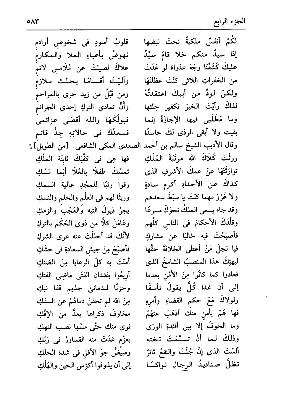 (فيا نجلَ مَنْ أعْطى الخلافَةَ حقَّها ... فأصبَحَ مِنْ جيشِ السعادةِ فِي حشْكِ)