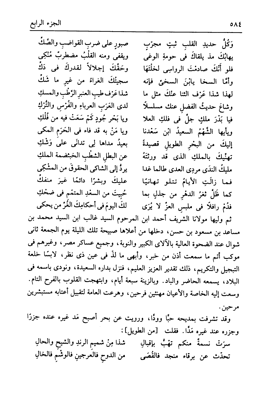 ثمَّ وَليهَا مَوْلَانَا الشريف أَحْمد ابْن المرحوم السَّيِّد غَالب ابْن السَّيِّد مُحَمَّد بن مساعد بن مَسْعُود بن حسن دَخلهَا من أَعْلَاهَا صَبِيحَة تِلْكَ اللَّيْلَة يَوْم الْجُمُعَة ثانى شَوَّال عِنْد الضحوة الْعَالِيَة بالآلاى الْكَبِير والنوبة وَجَمِيع عَسَاكِر مصر وَغَيرهم فِي موكب أتم مَا سَمِعت أذن من خبر وأبهى مَا لذ فِي عين ذِي نظر لابساً خلعة التبجيل والتكريم ذَلِك تَقْدِير الْعَزِيز الْعَلِيم فَنزل بداره السعيدة وَنُودِيَ باسمه فِي الْبِلَاد يسمعهُ الْحَاضِر والباد وبالزينة سَبْعَة أَيَّام وابتهجت الْقُلُوب بالفرح التَّام وسعت إِلَيْهِ الْخَاصَّة والأعيان مهنئين فرحين وهرعت الْعَامَّة لتقبيل أعتابه مستبشرين مرحين وَقد تشرفت بمديحه حبا ووداً وَرويت عَن بَحر أصبح مَد غَيره عِنْده جزراً وجزره عِنْد غَيره مدا فَقلت // (من الطَّوِيل) //