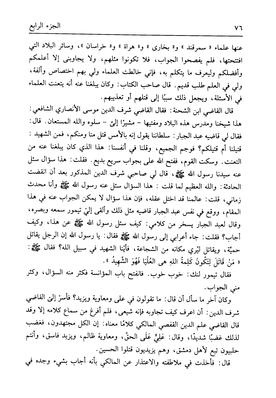 مَنْ قَاتَلَ لِتَكُونَ كَلِمةُ اللهِ هِيَ العُلْياً فَهُوَ الشَهِيدُ فَقَالَ تيمور لنك خوب خوب فانفتح بَاب المؤانسة فَكثر مِنْهُ السُّؤَال وَكثر مني الْجَواب وَكَانَ آخر مَا سَأَلَ أَن قَالَ مَا تَقولُونَ فِي عَليّ وَمُعَاوِيَة وَيزِيد فَأسر إِلَى القَاضِي شرف الدّين أَن اعرف كَيفَ تجاوبه فَإِنَّهُ شيعي فَلم أفرغ من مساع كَلَامه إِلَّا وَقد قَالَ القَاضِي علم الدّين القفصي الْمَالِكِي كلَاما مَعْنَاهُ إِن الْكل مجتهدون فَغَضب لذَلِك غَضبا شَدِيدا وَقَالَ عَلِي عَلَى الْحق وَمُعَاوِيَة ظَالِم وَيزِيد فَاسق وَأَنْتُم حلبيون تبع لأهل دمشق وهم يزِيدُونَ قتلوا الْحُسَيْن قَالَ فَأخذت فِي ملاطفته والاعتذار عَن الْمَالِكِي بِأَنَّهُ أجَاب بِشَيْء وجده فِي