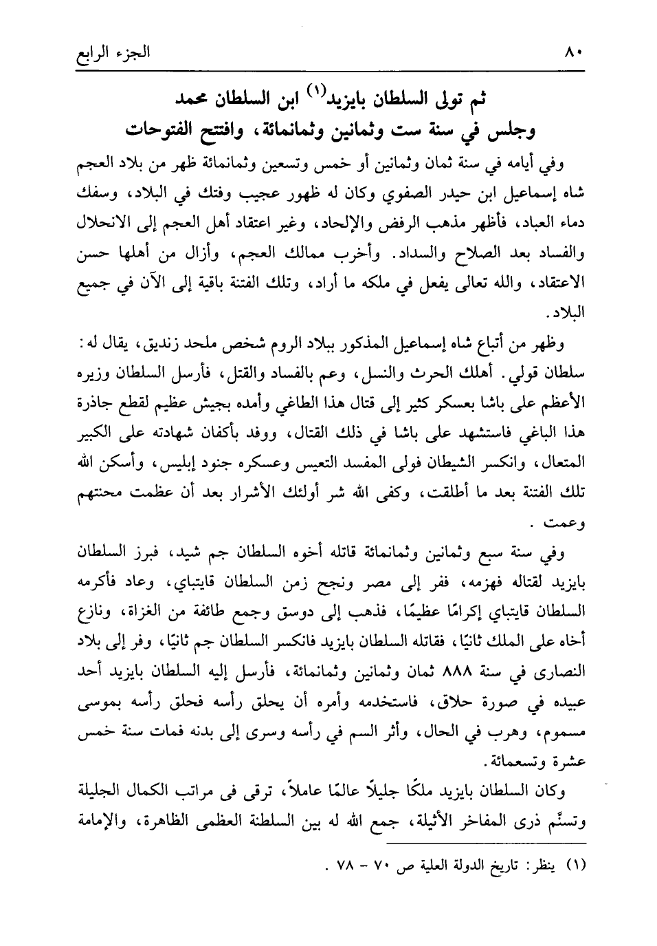 وَفِي أَيَّامه فِي سنة ثَمَان وَثَمَانِينَ أَو خمس وَتِسْعين وَثَمَانمِائَة ظهر من بِلَاد الْعَجم شاه إِسْمَاعِيل ابْن حيدر الصفوي وَكَانَ لَهُ ظُهُور عَجِيب وفتك فِي الْبِلَاد وَسَفك دِمَاء الْعباد فأظهر مَذْهَب الرَّفْض والإلحاد وَغير اعْتِقَاد أهل الْعَجم إِلَى الانحلال وَالْفساد بعد الصّلاح والسداد وأخرب ممالك الْعَجم وأزال من أَهلهَا حسن الِاعْتِقَاد وَالله تَعَالَى يفعل فِي ملكه مَا أَرَادَ وَتلك الْفِتْنَة بَاقِيَة إِلَى الْآن فِي جَمِيع الْبِلَاد وَظهر من أَتبَاع شاه إِسْمَاعِيل الْمَذْكُور بِبِلَاد الرّوم شخص ملحد زنديق يُقَال لَهُ سُلْطَان قولي أهلك الْحَرْث والنسل وَعم بِالْفَسَادِ وَالْقَتْل فَأرْسل السُّلْطَان وزيره الْأَعْظَم على باشا بعسكر كثير إِلَى قتال هَذَا الطاغي وأمده بِجَيْش عَظِيم لقطع جاذرة هَذَا الْبَاغِي فاستشهد عَليّ باشا فِي ذَلِك الْقِتَال ووفد بأكفان شَهَادَته على الْكَبِير المتعال وانكسر الشَّيْطَان فولى الْمُفْسد التعيس وَعَسْكَره جنود إِبْلِيس وأسكن الله تِلْكَ الْفِتْنَة بعد مَا أطلقت وَكفى الله شَرّ أُولَئِكَ الأشرار بعد أَن عظمت محنتهم وعمت وَفِي سنة سبع وَثَمَانِينَ وَثَمَانمِائَة قَاتله أَخُوهُ السُّلْطَان جم شيد فبرز السُّلْطَان بايزيد لقتاله فَهَزَمَهُ ففر إِلَى مصر ونجح زمن السُّلْطَان قايتباي وَعَاد فَأكْرمه السُّلْطَان قايتباي إِكْرَاما عَظِيما فَذهب إِلَى دوسق وَجمع طَائِفَة من الْغُزَاة وَنَازع أَخَاهُ على الْملك ثانيَاً فقاتله السُّلْطَان بايزيد فانكسر السُّلْطَان جم ثانيَاً وفر إِلَى بِلَاد النَّصَارَى فِي سنة 888 ثَمَان وَثَمَانِينَ وَثَمَانمِائَة فَأرْسل إِلَيْهِ السُّلْطَان بايزيد أحد عبيده فِي صُورَة حلاق فاستخدمه وَأمره أَن يحلق رَأسه فحلق رَأسه بمُوسَى مَسْمُوم وهرب فِي الْحَال وَأثر السم فِي رَأسه وسرى إِلَى بدنه فَمَاتَ سنة خمس عشرَة وَتِسْعمِائَة وَكَانَ السُّلْطَان بايزيد ملكا جَلِيلًا عَالما عَاملا ترقى فِي مَرَاتِب الْكَمَال الجليلة وتسنم ذرى المفاخر الأثيلة جمع الله لَهُ بَين السلطنة الْعُظْمَى الظَّاهِرِيَّة والإمامة