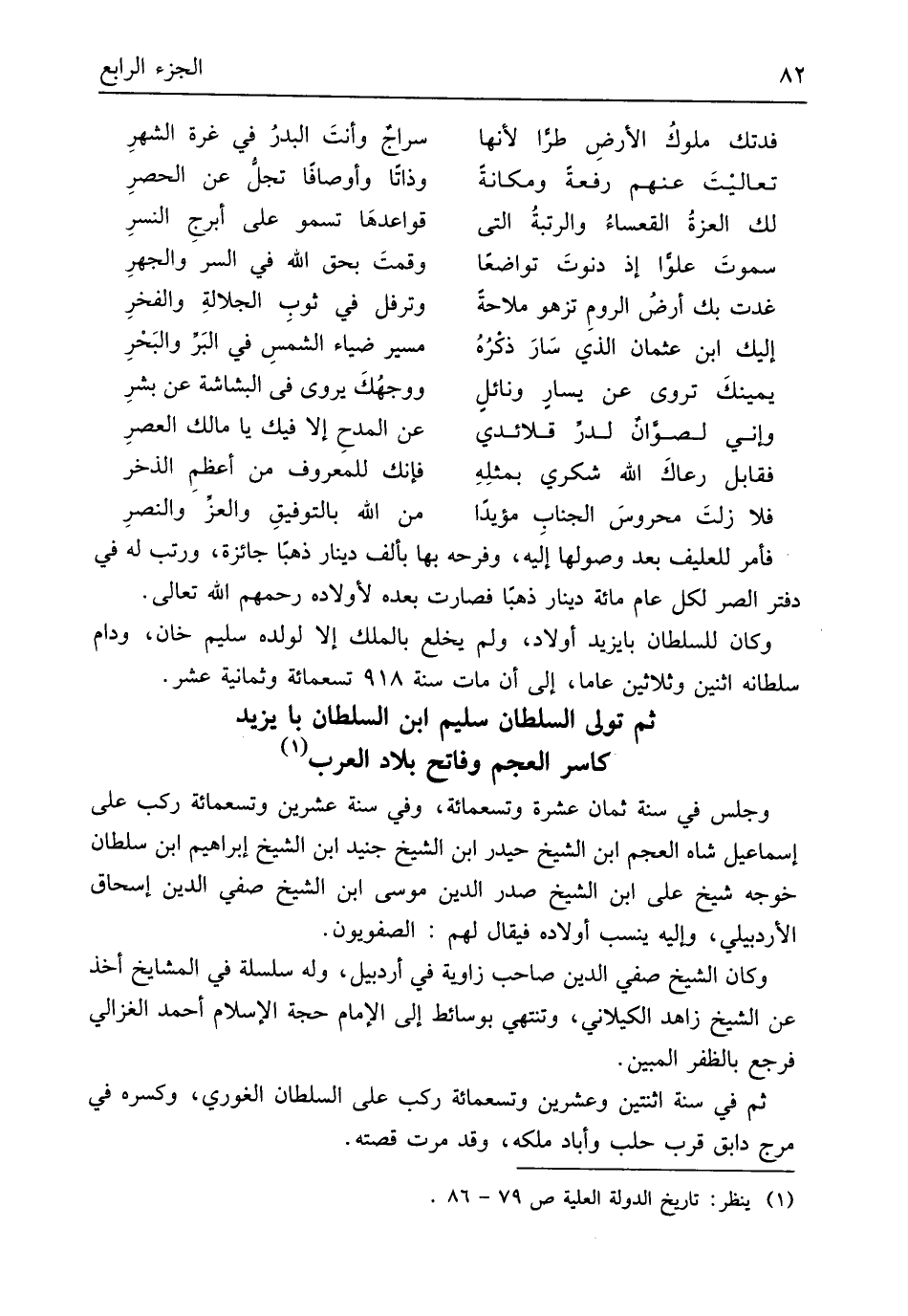 وَجلسَ فِي سنة ثَمَان عشرَة وَتِسْعمِائَة وَفِي سنة عشْرين وَتِسْعمِائَة ركب على إِسْمَاعِيل شاه الْعَجم ابْن الشَّيْخ حيدر ابْن الشَّيْخ جُنَيْد ابْن الشَّيْخ إِبْرَاهِيم ابْن سُلْطَان خوجه شيخ عَليّ ابْن الشَّيْخ صدر الدّين مُوسَى ابْن الشَّيْخ صفي الدّين إِسْحَاق الأردبيلي وَإِلَيْهِ ينْسب أَوْلَاده فَيُقَال لَهُم الصفويون وَكَانَ الشَّيْخ صفي الدّين صَاحب زَاوِيَة فِي أردبيل وَله سلسلة فِي الْمَشَايِخ أَخذ عَن الشَّيْخ زاهد الكيلاني وتنتهي بوسائط إِلَى الإِمَام حجَّة الْإِسْلَام أَحْمد الْغَزالِيّ فَرجع بالظفر الْمُبين ثمَّ فِي سنة اثْنَتَيْنِ وَعشْرين وَتِسْعمِائَة ركب على السُّلْطَان الغوري وكسره فِي مرج دابق قرب حلب وأباد ملكه وَقد مرت قصَّته