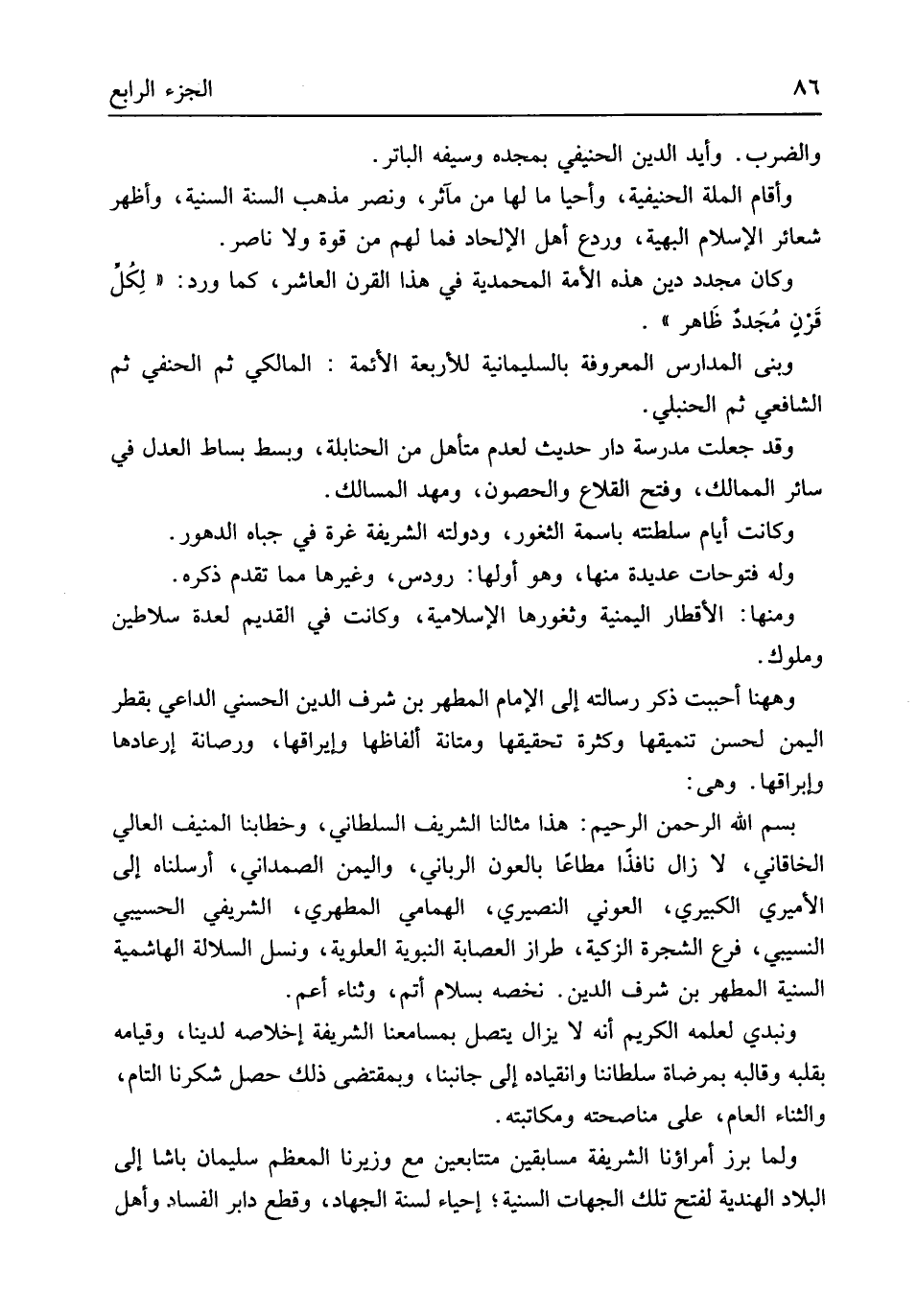 وَالضَّرْب وأيد الدّين الحنيفي بمجده وسيفه الباتر وَأقَام الْملَّة الحنيفية وَأَحْيَا مَا لَهَا من مآثر وَنصر مَذْهَب السّنة السّنيَّة وَأظْهر شَعَائِر الْإِسْلَام البهية وردع أهل الْإِلْحَاد فَمَا لَهُم من قُوَّة وَلَا نَاصِر وَكَانَ مُجَدد دين هَذِه الْأمة المحمدية فِي هَذَا الْقرن الْعَاشِر كَمَا ورد لِكُل قَرنٍ مُجَددٌ ظَاهر وَبنى الْمدَارِس الْمَعْرُوفَة بالسليمانية للأربعة الْأَئِمَّة الْمَالِكِي ثمَّ الْحَنَفِيّ ثمَّ الشَّافِعِي ثمَّ الْحَنْبَلِيّ وَقد جعلت مدرسة دَار حَدِيث لعدم متأهل من الْحَنَابِلَة وَبسط بِسَاط الْعدْل فِي سَائِر الممالك وَفتح القلاع والحصون ومهد المسالك وَكَانَت أَيَّام سلطنته باسمة الثغور ودولته الشَّرِيفَة عرة فِي جباه الدهور وَله فتوحات عديدة مِنْهَا وَهُوَ أَولهَا رودس وَغَيرهَا مِمَّا تقدم ذكره وَمِنْهَا الأقطار اليمنية وثغورها الإسلامية وَكَانَت فِي الْقَدِيم لعدة سلاطين وملوك وَهَهُنَا أَحْبَبْت ذكر رسَالَته إِلَى الإِمَام المطهر بن شرف الدّين الحسني الدَّاعِي بقطر الْيمن لحسن تنميقها وَكَثْرَة تحقيقها ومتانة ألفاظها وإيراقها ورصانة إرعادها وإبراقها وَهِي بِسم الله الرَّحْمَن الرَّحِيم هَذَا مثالنا الشريف السلطاني وخطابنا المنيف العالي الخاقاني لَا زَالَ نَافِذا مُطَاعًا بالعون الرباني واليمن الصمداني أرسلناه إِلَى الأميري الكبيري العوني النصيري الهمامي المطهري الشريفي الحسيبي النسيبي فرع الشَّجَرَة الزكية طراز الْعِصَابَة النَّبَوِيَّة العلوية ونسل السلالة الهاشمية السّنيَّة المطهر بن شرف الدّين نخصه بِسَلام أتم وثناء أَعم ونبدي لعلمه الْكَرِيم أَنه لَا يزَال يتَّصل بمسامعنا الشَّرِيفَة إخلاصه لدينا وقيامه بِقَلْبِه وقالبه بمرضاة سلطاننا وانقياده إِلَى جانبنا وبمقتضى ذَلِك حصل شكرنا التَّام وَالثنَاء الْعَام على مناصحته ومكاتبته وَلما برز أمراؤنا الشَّرِيفَة مسابقين مُتَتَابعين مَعَ وزيرنا الْمُعظم سُلَيْمَان باشا إِلَى الْبِلَاد الْهِنْدِيَّة لفتح تِلْكَ الْجِهَات السّنيَّة إحْيَاء لسنة الْجِهَاد وَقطع دابر الْفساد وَأهل
