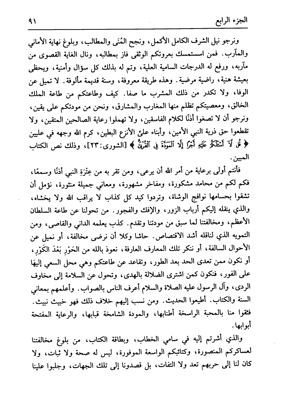 وَنَرْجُو نيل الشّرف الْكَامِل الْأَكْمَل ونجح المُنَى والمطالب وبلوغ نِهَايَة الْأَمَانِي والمآرب فَمن اسستمسك بعروتكم الوثقى فَازَ بمطالبه ونال الْغَايَة القصوى من مآربه وَرفع لَهُ الدَّرَجَات السامية الْعلية وَتمّ لَهُ بذلك كل سُؤال وأمنية ويحظى بعيشة هنيَّة راضية مرضية وَهَذِه طَريقَة مَعْرُوفَة وَسنة قديمَة مألوفة لَا تميل عَن الوفا وَلَا تكدر من ذَلِك المشرب مَا صفا كَيفَ وطاعتكم من طَاعَة الْملك الْخَالِق ومعصيتكم تظلم مِنْهَا المغارب والمشارق وَنحن من مودتكم على يَقِين وَنَرْجُو أَن لَا تصفوا أذنا الْكَلَام الْفَاسِقين وَلَا تهملوا رِعَايَة الصَّالِحين الْمُتَّقِينَ وَلَا تقطعوا حق ذُرِّيَّة النَّبِي الْأمين وَأَبْنَاء عَليّ الأنزع البطين كرم الله وَجهه فِي عليين {قل لَا أسئلكم عليهِ أجرا إِلا المَوَدةَ فِي القُربى} الشورى 23 وَذَلِكَ نَص الْكتاب الْمُبين فَأنْتم أولى برعاية من أَمر الله أَن يرْعَى وَمن تقر بِهِ من عِترَةِ النَّبِي أذنا وسمعاً فكم لكم من محامد مشكورة ومفاخر مَشْهُورَة ومعاني جميلَة منثورة نؤمل أَن تشقوا بحسامها نوافج الوشاة وتردوا كيد كل كَذَّاب لَا يراقب الله وَلَا يخشاه وَالَّذِي يَنْقُلهُ إِلَيْكُم أَرْبَاب الزُّور والإفك والفجور من تَحَوَّلْنَا عَن طَاعَة السُّلْطَان الْأَعْظَم ومخالفتنا لما سبق من مودتنا وَتقدم كذب يُعلمهُ الداني والقاصي وَمن التمويه الَّذِي لناقله أَشد الاقتصاص حاشا وكلا أَن نرضى مُخَالفَة أَو نَمِيل عَن الْأَحْوَال السالفة أَو ننكر تِلْكَ المعارف العارفة نَعُوذ بِاللَّه من الحَوْرِ بَعْدَ الكَوْرِ أَو نَكُون مِمَّن تعدى الْحَد بعد الطّور وتقاعد عَن طاعتكم وَهِي مَحل السَّعْي إِلَيْهَا على الْفَوْر فنكون كمن اشْترى الضَّلَالَة بِالْهدى وتحول عَن السَّلامَة إِلَى مخاوف الردى وَآل الرَّسُول عَلَيْهِ الصَّلَاة وَالسَّلَام أعرف النَّاس بِالصَّوَابِ وأعلمهم بمعاني السّنة وَالْكتاب أطِيعُوا الحَدِيث وَمن نسب إِلَيْهِم خلاف ذَلِك فَهُوَ خَبِيث نبيث فثقوا منا بالمحبة الراسخة أطنابها والمودة الشامخة قبابها وَالرِّعَايَة المفتحة أَبْوَابهَا وَالَّذِي أشرتم إِلَيْهِ فِي سامي الْخطاب وبطاقة الْكتاب من بُلُوغ مخالفتنا لعساكركم المنصورة وكتائبكم الواسعة الموفورة لَيْسَ لَهُ صِحَة وَلَا ثبات وَلَا كَانَ لنا إِلَى حربهم تعد وَلَا الْتِفَات بل قصدونا إِلَى تِلْكَ الْجِهَات وجلبوا علينا