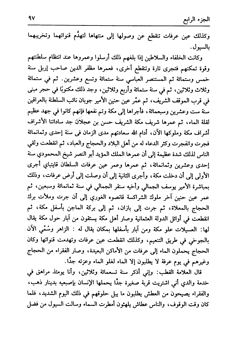 وَكَذَلِكَ عين عَرَفَات تَنْقَطِع عَن وصولها إِلَى مُنْتَهَاهَا لتهدم قنواتهما وتخريبهما بالسيول وَكَانَت الْخُلَفَاء والسلاطين إِذا بَلغهُمْ ذَلِك أرْسلُوا وعمروها عِنْد انتظام سلطنتهم وَقُوَّة تمكنهم فتجري تَارَة وتنقطع أُخْرَى فعمرها مظفر الدّين صَاحب إربل سنة خمس وسِتمِائَة ثمَّ الْمُسْتَنْصر العباسي سنة سِتّمائَة وتسع وَعشْرين ثمَّ فِي سِتّمائَة وَثَلَاث وَثَلَاثِينَ ثمَّ فِي سنة سِتّمائَة وَأَرْبع وَثَلَاثِينَ وجد ذَلِك مَكْتُوبًا فِي حجر مَبْنِيّ فِي قرب الْموقف الشريف ثمَّ عمر عين حنين الْأَمِير جوبان نَائِب السلطنة بالعراقين سنة سِتّ وَعشْرين وَسَبْعمائة فأجراها إِلَى مَكَّة وَتمّ نَفعهَا فَإِنَّهُم كَانُوا فِي جهد عَظِيم لقلَّة المَاء ثمَّ عمرها شرِيف مَكَّة الشريف حسن بن عجلَان جد سَادَاتنَا الْأَشْرَاف أَشْرَاف مَكَّة وملوكها الْآن أدام الله سعادتهم مدى الزَّمَان فِي سنة إِحْدَى وَثَمَانمِائَة فجرت وانفجرت وَكثر الدُّعَاء لَهُ من أهل الْبِلَاد وَالْحجاج والعباد ثمَّ انْقَطَعت وَلَقي النَّاس لذَلِك شدَّة عَظِيمَة إِلَى أَن عمرها الْملك الْمُؤَيد أَبُو النَّصْر شيخ المحمودي سنة إِحْدَى وَعشْرين وَثَمَانمِائَة ثمَّ عمرها وَعمر عين عَرَفَات السُّلْطَان قايتباي أجْرى الأولى إِلَى أَن دخلت مَكَّة وأجرى الثَّانِيَة إِلَى أَن وصلت إِلَى أَرض عَرَفَات وَذَلِكَ بمناشرة الْأَمِير يُوسُف الجمالي وأخيه سنقر الجمالي فِي سنة ثَمَانمِائَة وَسبعين ثمَّ عمر عين حنين آخر مُلُوك الشراكسة قانصوه الغوري إِلَى أَن جرت وملأت برك الْحجَّاج بالمعلاة ثمَّ جرت إِلَى بازان ثمَّ إِلَى بركَة الماجن بِأَسْفَل مَكَّة ثمَّ انْقَطَعت فِي أَوَائِل الدولة العثمانية وَصَارَ أهل مَكَّة يستقون من آبار حول مَكَّة يُقَال لَهَا العسيلات علو مَكَّة وَمن آبار بأسفلها بمَكَان يُقَال لَهُ الزَّاهِر وسُمي الْآن بالجوخي فِي طَرِيق التَّنْعِيم وَكَذَلِكَ انْقَطَعت عين عَرَفَات وتهدمت قنواتها وَكَانَ الْحجَّاج يحملون المَاء إِلَى عَرَفَات من الْأَمَاكِن الْبَعِيدَة وَصَارَ الْفُقَرَاء من الْحجَّاج وَغَيرهم فِي يَوْم عَرَفَة لَا يطْلبُونَ إِلَّا المَاء لغلو المَاء وعزته جدا قَالَ الْعَلامَة القطب وَإِنِّي أذكر سنة تِسْعمائَة وَثَلَاثِينَ وَأَنا يَوْمئِذٍ مراهق فِي خدمَة وَالِدي أَنِّي اشْتريت قربَة صَغِيرَة جدا يحملهَا الْإِنْسَان بإصبعيه بِدِينَار ذهب والفقراء يصيحون من الْعَطش يطْلبُونَ مَا يبل حُلُوقهمْ فِي ذَلِك الْيَوْم الشَّديد فَلَمَّا كَانَ وَقت الْوُقُوف وَالنَّاس عطاش يلهثون أمْطرت السَّمَاء وسالت السُّيُول من فضل