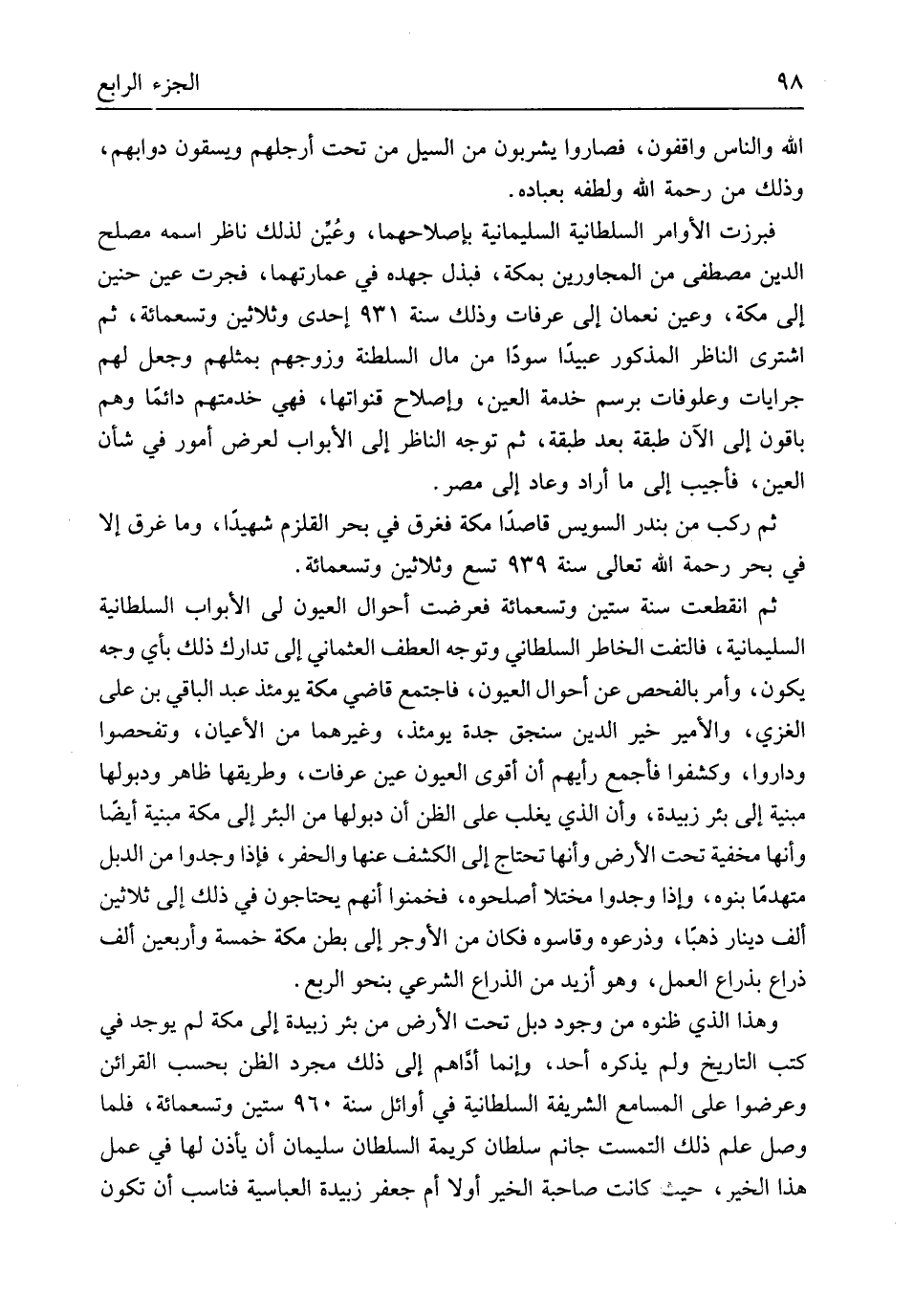 الله وَالنَّاس واقفون فصاروا يشربون من السَّيْل من تَحت أَرجُلهم ويسقون دوابهم وَذَلِكَ من رَحْمَة الله ولطفه بعباده فبرزت الْأَوَامِر السُّلْطَانِيَّة السليمانية بإصلاحهما وعُين لذَلِك نَاظر اسْمه مصلح الدّين مصطفى من المجاورين بِمَكَّة فبذل جهده فِي عمارتهما فجرت عين حنين إِلَى مَكَّة وَعين نعْمَان إِلَى عَرَفَات وَذَلِكَ سنة 931 إِحْدَى وَثَلَاثِينَ وَتِسْعمِائَة ثمَّ اشْترى النَّاظر الْمَذْكُور عبيدا سُودًا من مَال السلطنة وزوجهم بمثلهم وَجعل لَهُم جرايات وعلوفات برسم خدمَة الْعين وَإِصْلَاح قنواتها فَهِيَ خدمتهم دَائِما وهم باقون إِلَى الْآن طبقَة بعد طبقَة ثمَّ توجه النَّاظر إِلَى الْأَبْوَاب لعرض أُمُور فِي شَأْن الْعين فَأُجِيب إِلَى مَا أَرَادَ وَعَاد إِلَى مصر ثمَّ ركب من بندر السويس قَاصِدا مَكَّة فغرق فِي بَحر القلزم شَهِيدا وَمَا غرق إِلَّا فِي بَحر رَحْمَة الله تَعَالَى سنة 939 تسع وَثَلَاثِينَ وَتِسْعمِائَة ثمَّ انْقَطَعت سنة سِتِّينَ وَتِسْعمِائَة فعرضت أَحْوَال الْعُيُون لي الْأَبْوَاب السُّلْطَانِيَّة السليمانية فَالْتَفت الخاطر السلطاني وَتوجه الْعَطف العثماني إِلَى تدارك ذَلِك بِأَيّ وَجه يكون وَأمر بالفحص عَن أَحْوَال الْعُيُون فَاجْتمع قَاضِي مَكَّة يَوْمئِذٍ عبد الْبَاقِي بن عَليّ الْغَزِّي والأمير خير الدّين سنجق جدة يَوْمئِذٍ وَغَيرهمَا من الْأَعْيَان وتفحصوا وداروا وكشفوا فأجمع رَأْيهمْ أَن أقوى الْعُيُون عين عَرَفَات وطريقها ظَاهر ودبولها مَبْنِيَّة إِلَى بِئْر زبيدة وَأَن الَّذِي يغلب على الظَّن أَن دبولها من الْبِئْر إِلَى مَكَّة مَبْنِيَّة أَيْضا وَأَنَّهَا مخفية تَحت الأَرْض وَأَنَّهَا تحْتَاج إِلَى الْكَشْف عَنْهَا والحفر فَإِذا وجدوا من الدبل متهدماً بنوه وَإِذا وجدوا مختلاً أصلحوه فخمنوا أَنهم يَحْتَاجُونَ فِي ذَلِك إِلَى ثَلَاثِينَ ألف دِينَار ذَهَبا وذرعوه وقاسوه فَكَانَ من الأوجر إِلَى بطن مَكَّة خَمْسَة وَأَرْبَعين ألف ذِرَاع بِذِرَاع الْعَمَل وَهُوَ أَزِيد من الذِّرَاع الشَّرْعِيّ بِنَحْوِ الرّبع وَهَذَا الَّذِي طنوه من وجود دبل تَحت الأَرْض من بِئْر زبيدة إِلَى مَكَّة لم يُوجد فِي كتب التَّارِيخ وَلم يذكرهُ أحد وَإِنَّمَا أداهم إِلَى ذَلِك مُجَرّد الظَّن بِحَسب القرا ئن وعرضوا على المسامع الشَّرِيفَة السُّلْطَانِيَّة فِي أَوَائِل سنة 960 سِتِّينَ وَتِسْعمِائَة فَلَمَّا وصل علم ذَلِك التمست جانم سُلْطَان كَرِيمَة السُّلْطَان سُلَيْمَان أَن يَأْذَن لَهَا فِي عمل هَذَا الْخَيْر حَيْثُ كَانَت صَاحِبَة الْخَيْر أَولا أم جَعْفَر زبيدة العباسية فَنَاسَبَ أَن تكون