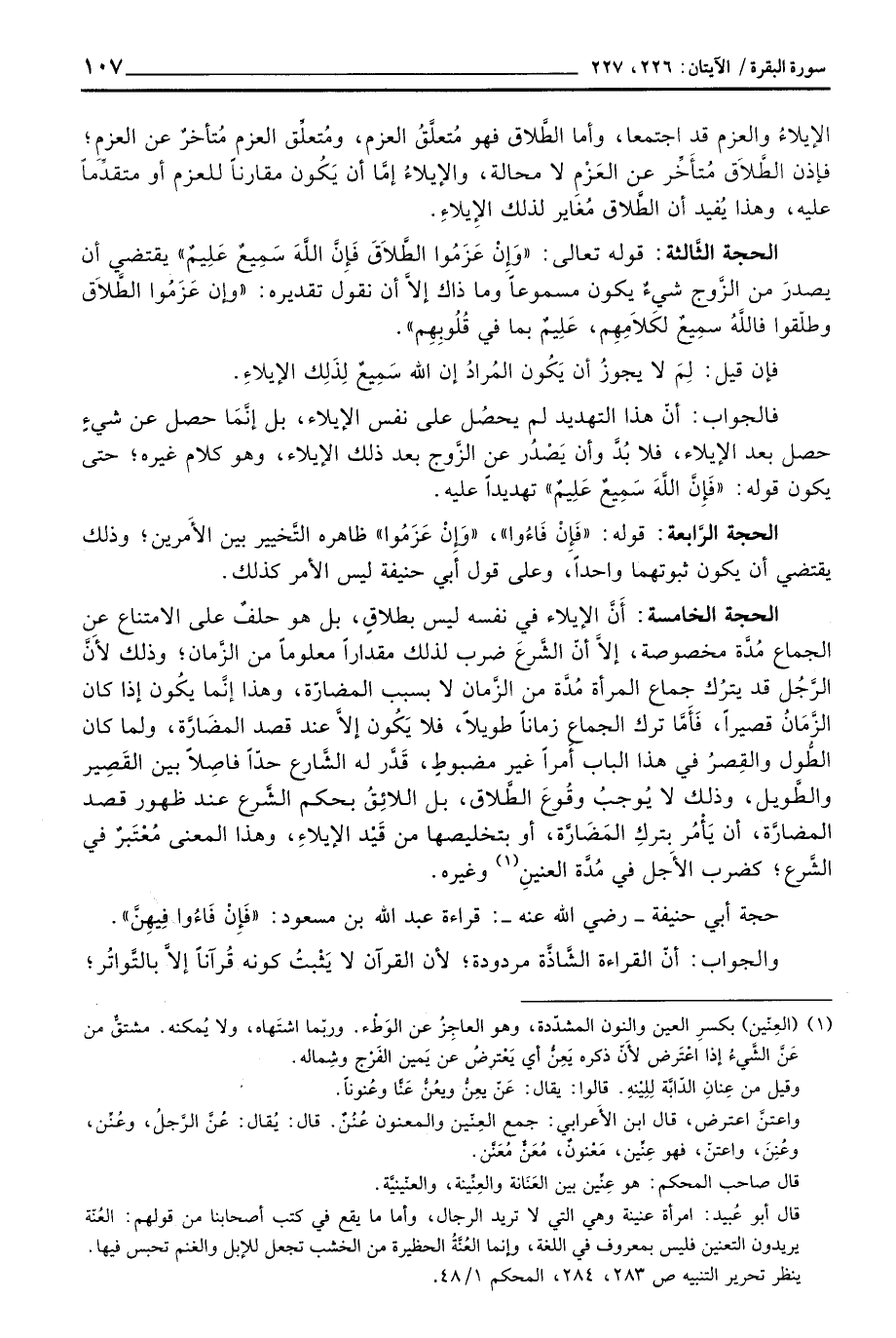 الحجة الرَّابعة: قوله: «فَإِنْ فَاءُوا» ، «وَإِنْ عَزَمُوا» ظاهره التَّخيير بين الأَمرين؛ وذلك يقتضي أن يكون ثبوتهما واحداً، وعلى قول أبي حنيفة ليس الأمر كذلك.
