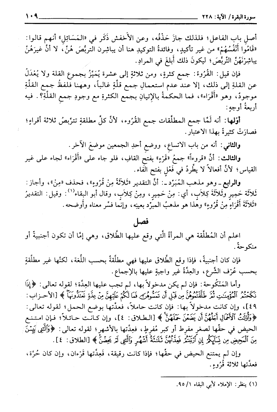 فإن قيل: القُرُوءُ: جمع كثرةٍ، ومن ثلاثةٍ إلى عشرة يُمَيَّزُ بجموع القلة ولا يُعْدَلُ عن القلةِ إلى ذلك، إلا عند عدم استعمالِ جمع قلَّةٍ غالباً، وههنا فلفظُ جمع القلَّةِ موجودٌ، وهو» أَقْرَاء «، فما الحكمةُ بالإِتيانِ بجمع الكثرةِ مع وجودِ جمعِ القلَّةِ؟ .